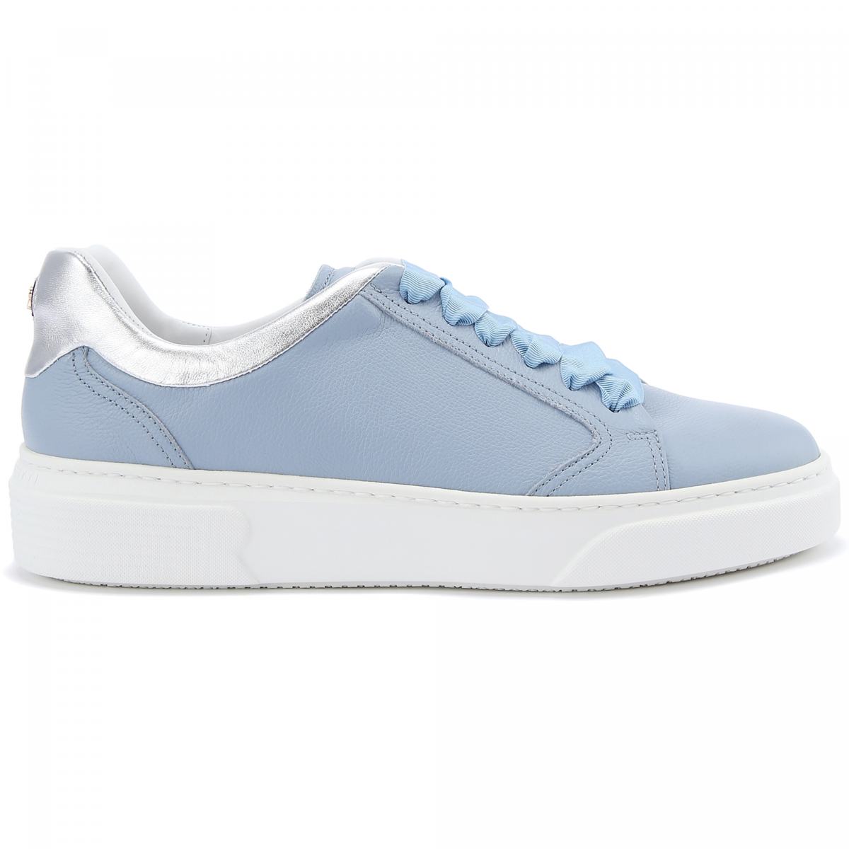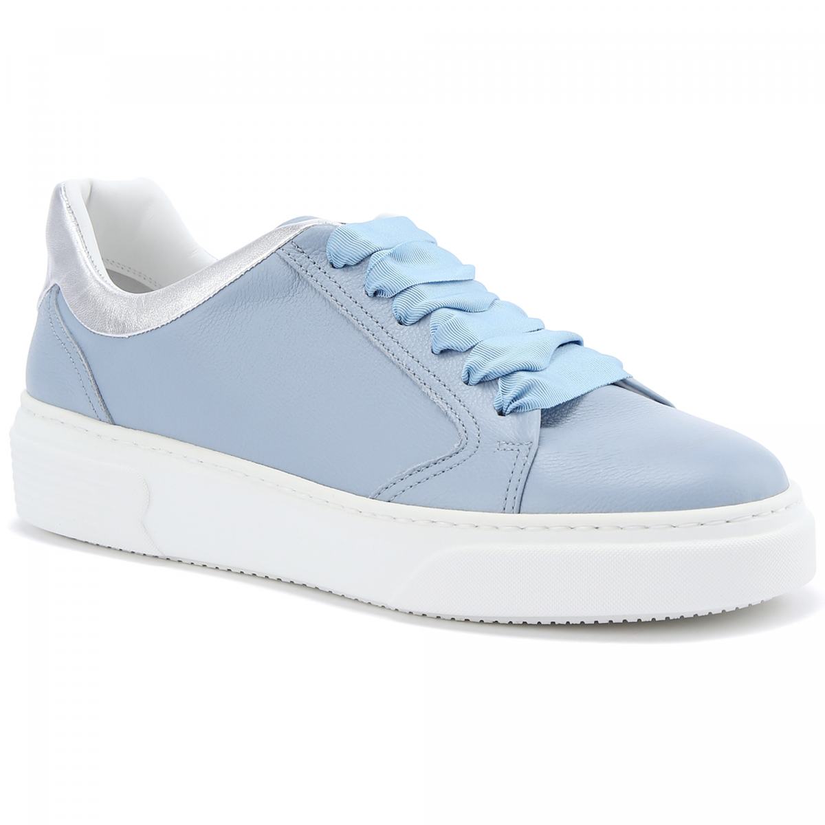 Кроссовки из мягкой кожи в голубом цвете от Fratelli Rossetti One. Кроссовки выполнены из натуральной кожи в голубом и серебристом цвете. Дизайн пары подчеркивает уникальная вставка на пятке с металлическим логотипом. Съемная стелька из натуральной кожи и кожаная подкладка с перфорацией. Подошва с индивидуальным протектором выполнена из резины.