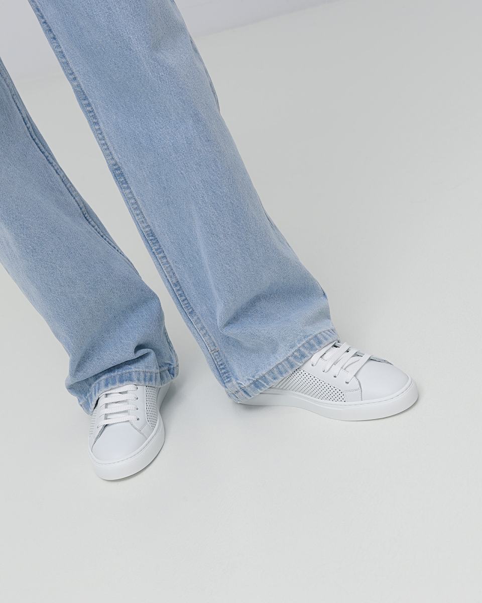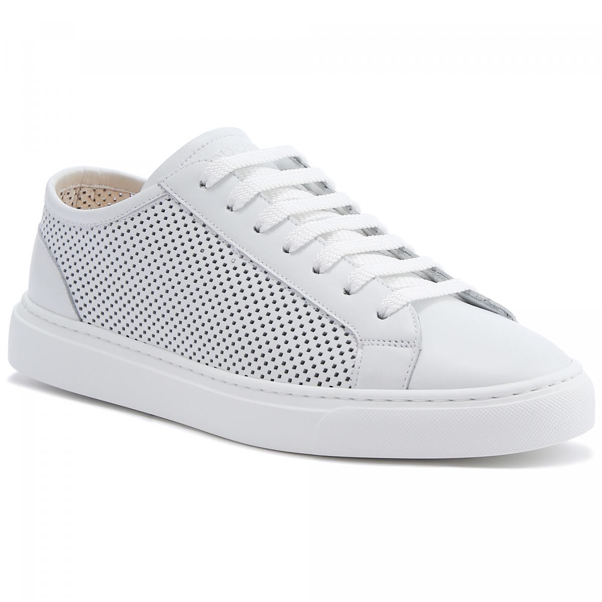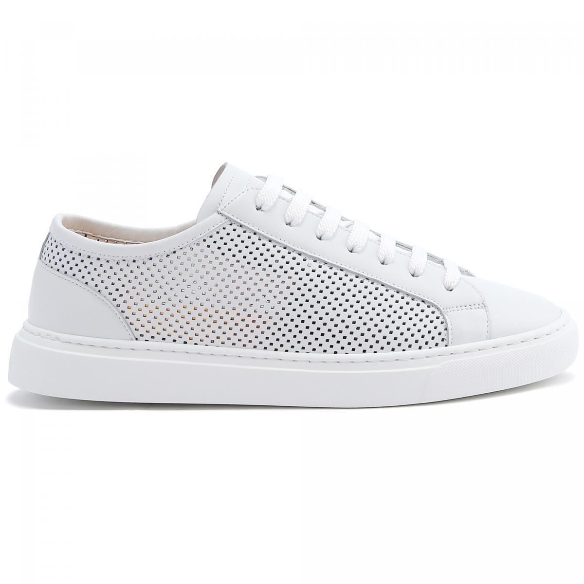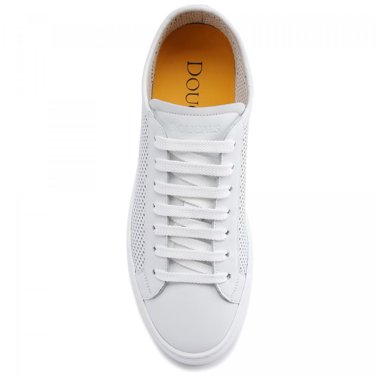 Кеды из натуральной кожи в белом цвете от Doucal’s. Модель с перфорацией особенно актуальна для жарких летней дней. Контрастная сверхлёгкая резиновая подошва, текстильная шнуровка в цвет, стелька и подкладка из натуральной кожи. Сделано в Италии.