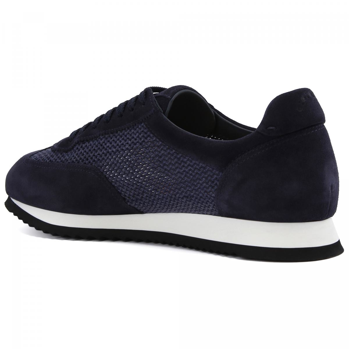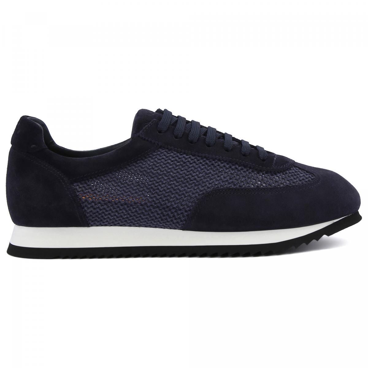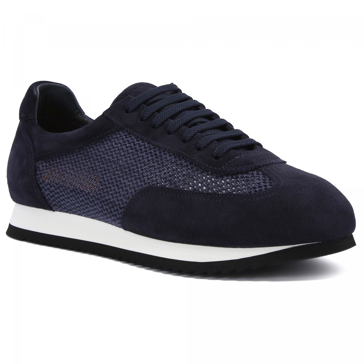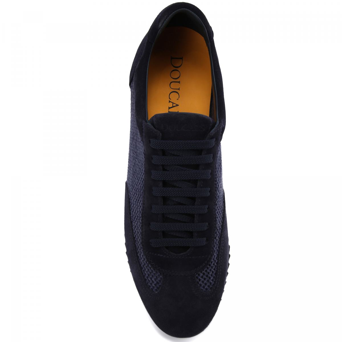 Кроссовки в оттенках синего, выполненные из замши и текстиля от Doucal’s. Комбинированные кроссовки - прекрасный вариант для теплого времени года, ведь текстильная часть верха отлично проветривается. Удобная резиновая подошва позволит совершать долгие прогулки и заниматься спортом. Стелька выполнена из натуральной кожи. Пара в тёмно-синем цвете подойдёт к любому образу и ситуации.