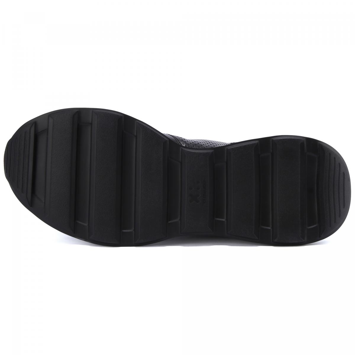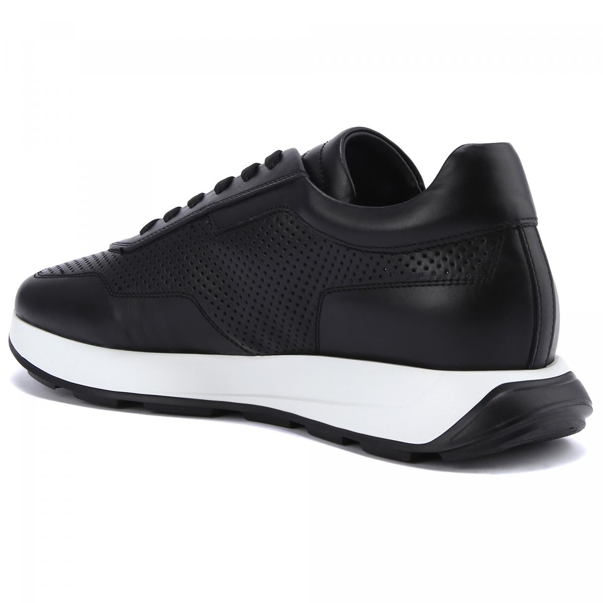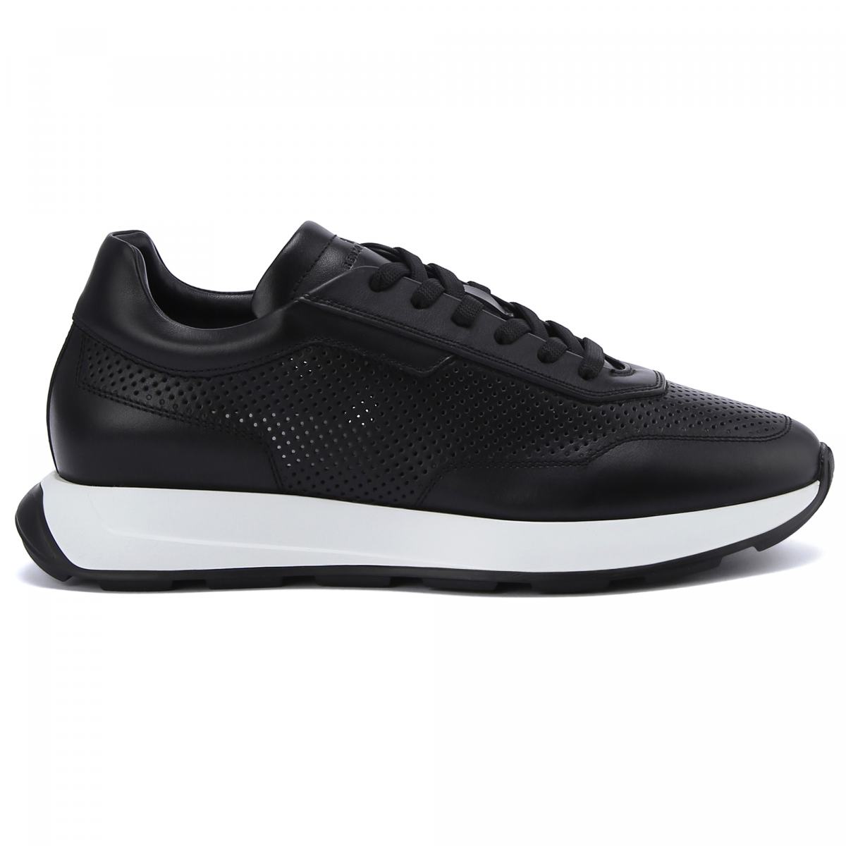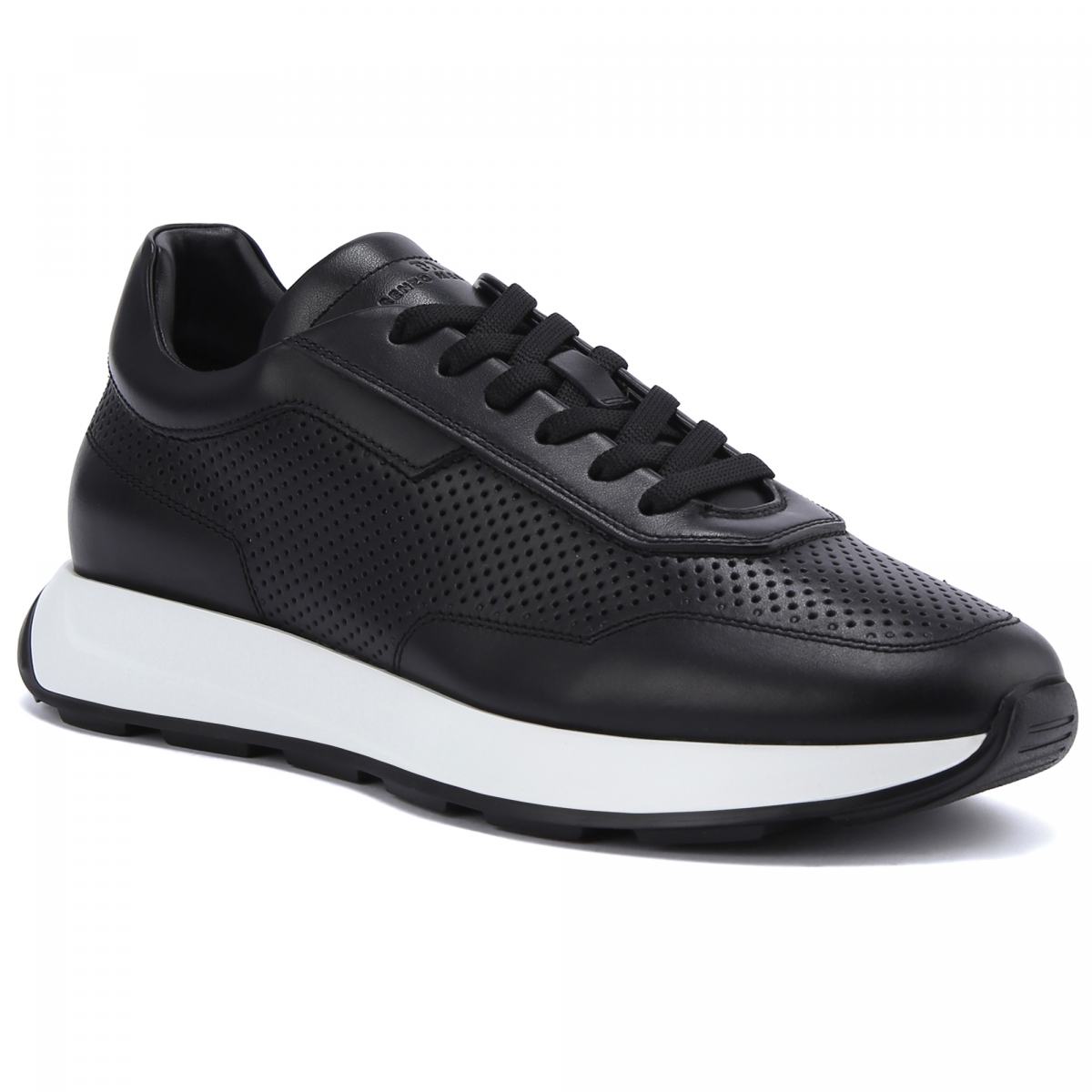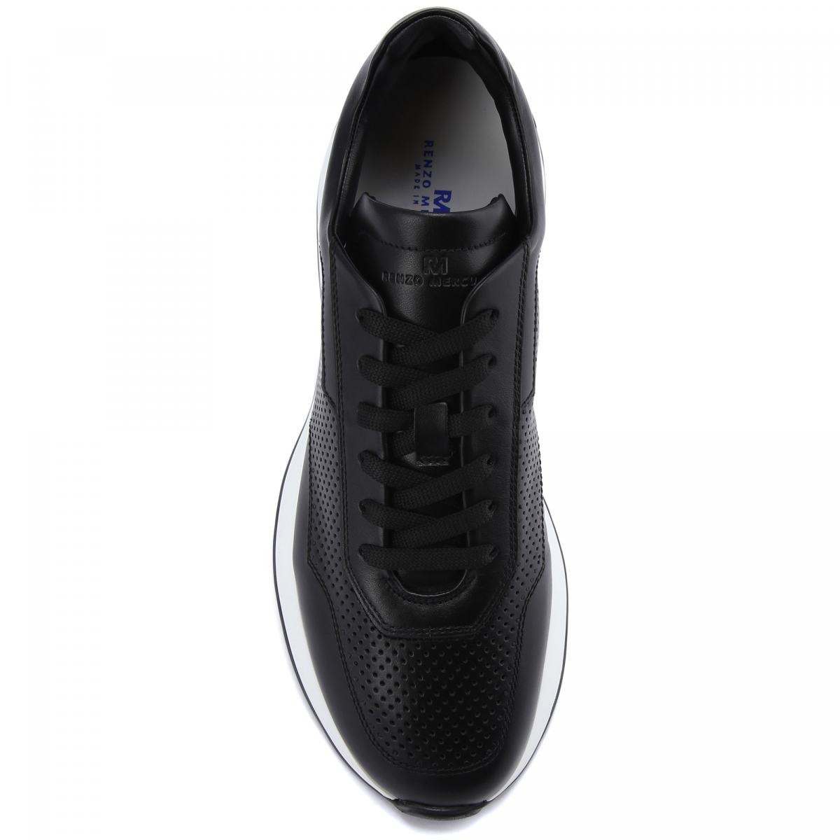 Чёрные кроссовки из натуральной кожи от Renzo Mercuri. Базовые чёрные кроссовки подойдут к любой одежде и ситуации, они универсальны и практичны. Дополнительную вентиляцию обеспечивает сквозная перфорация на коже. У модели текстильная шнуровка, резиновая подошва белого цвета, кожаная подкладка и стелька.