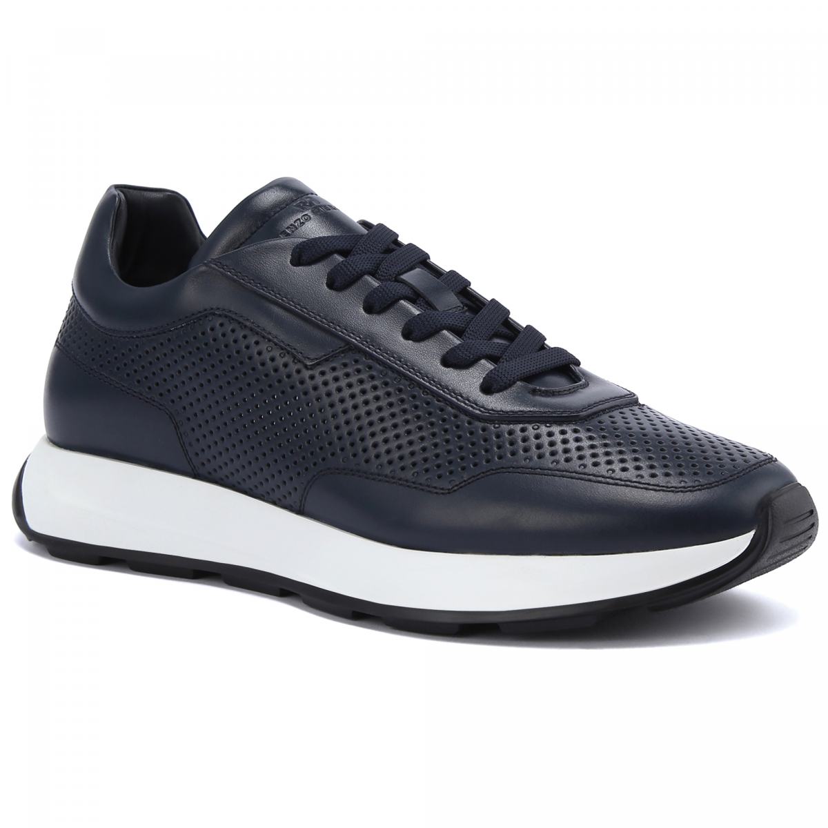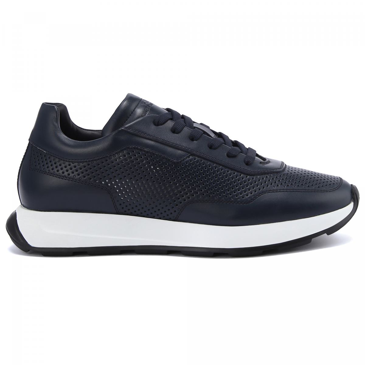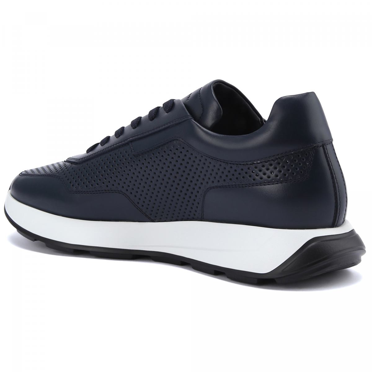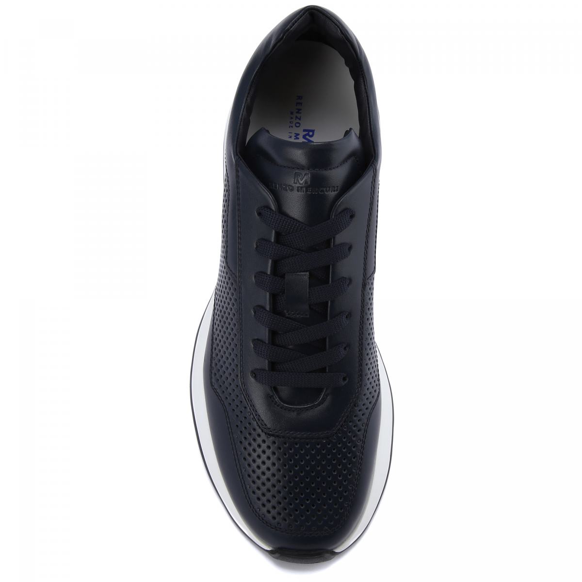 Тёмно-синие кроссовки из натуральной кожи от Renzo Mercuri. Базовые синие кроссовки подойдут к любой одежде и ситуации, они универсальны и практичны. Дополнительную вентиляцию обеспечивает сквозная перфорация на коже. У модели текстильная шнуровка, резиновая подошва белого цвета, кожаная подкладка и стелька.