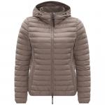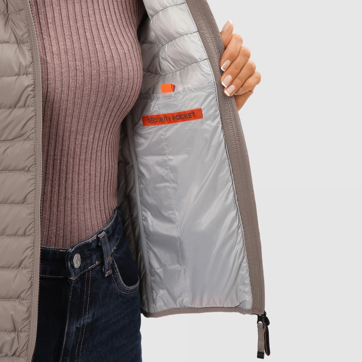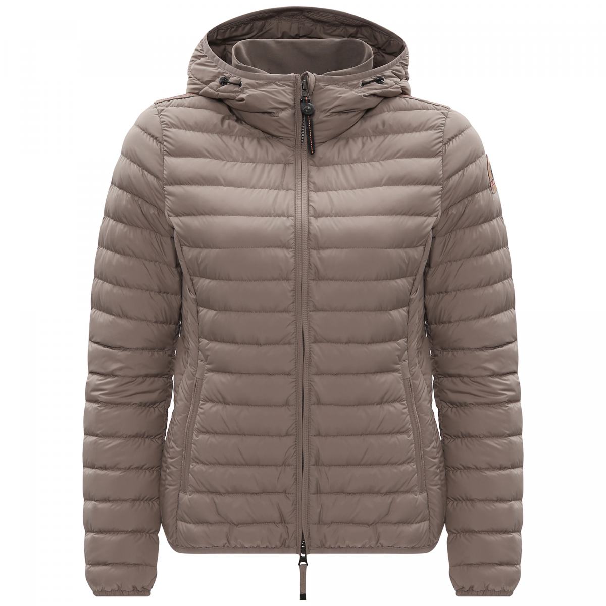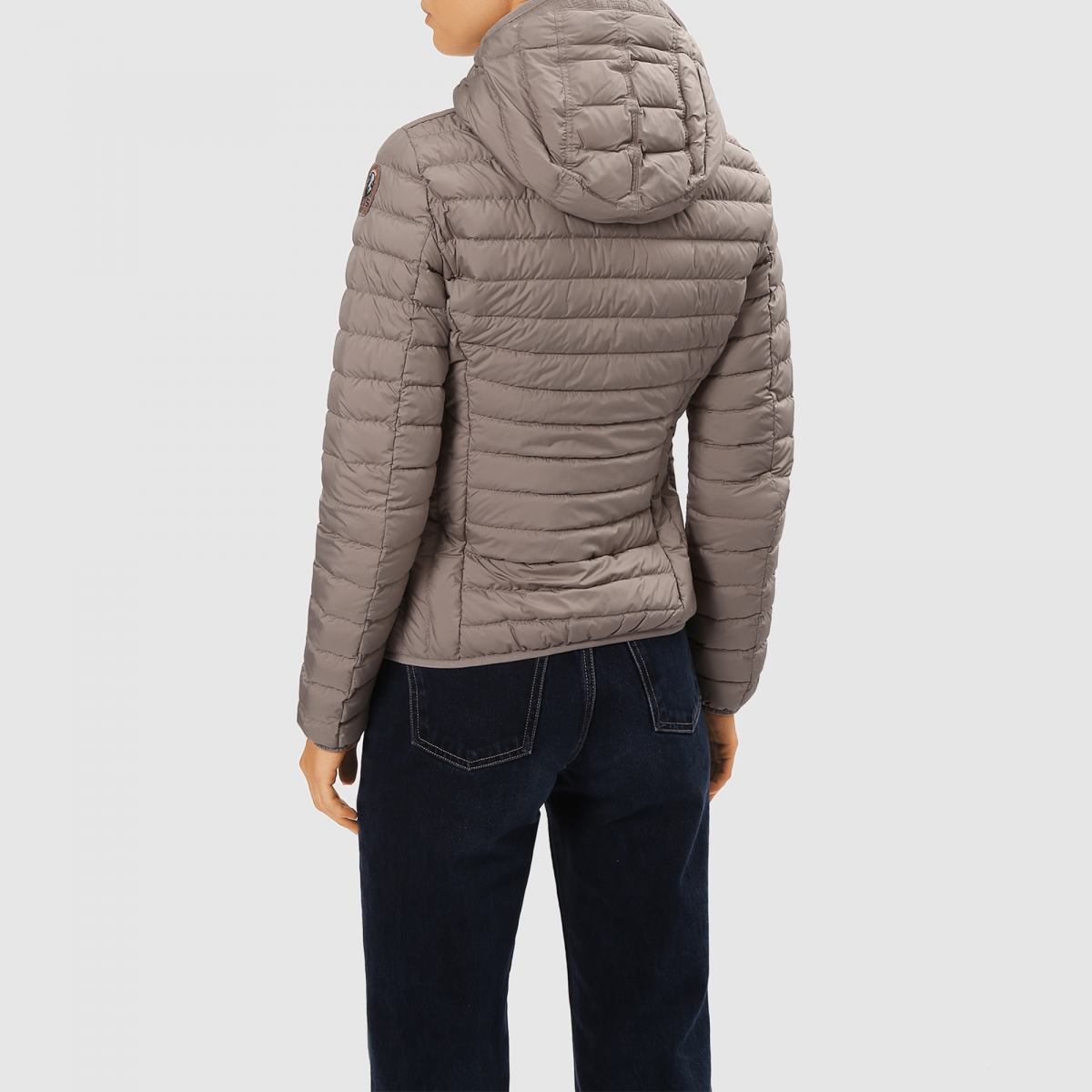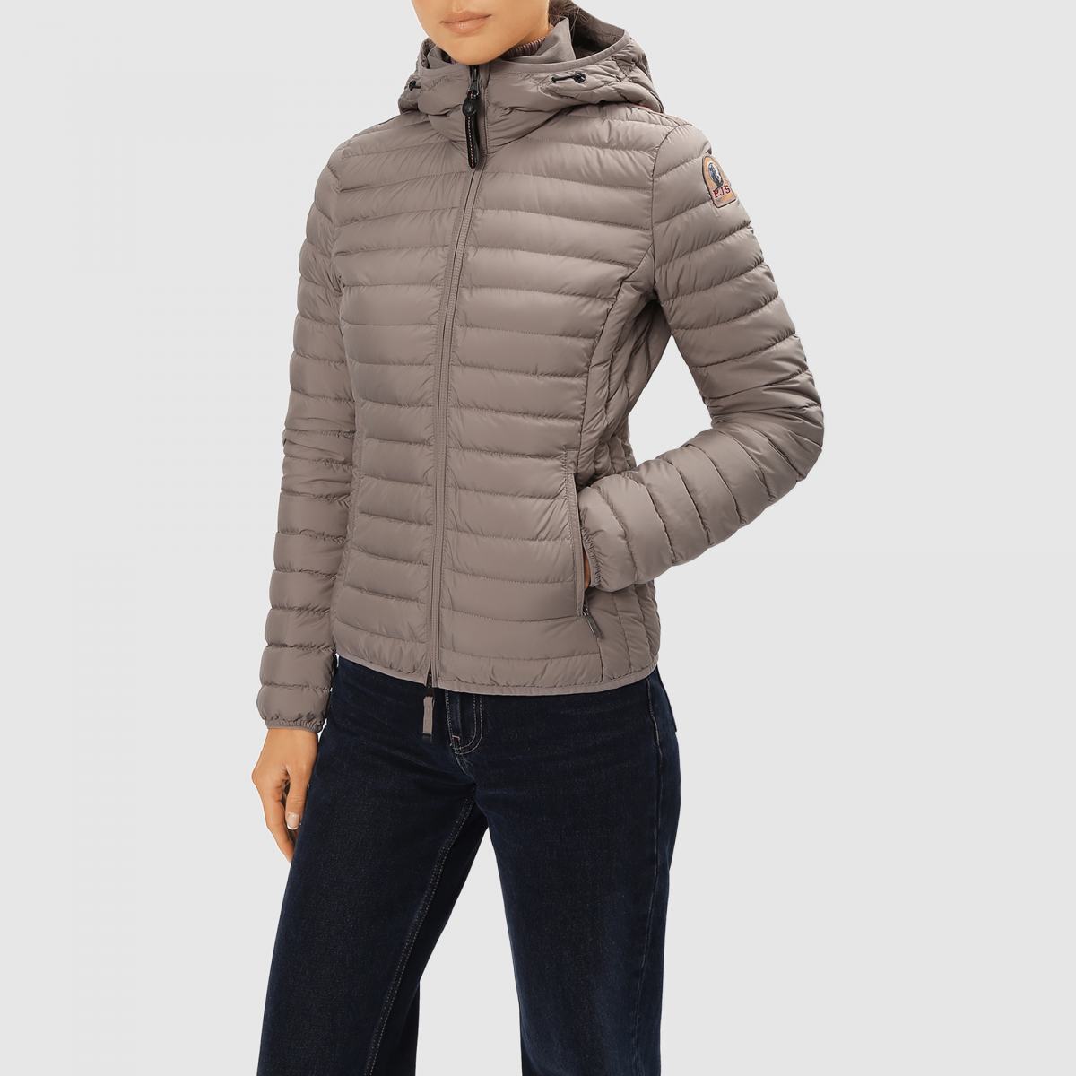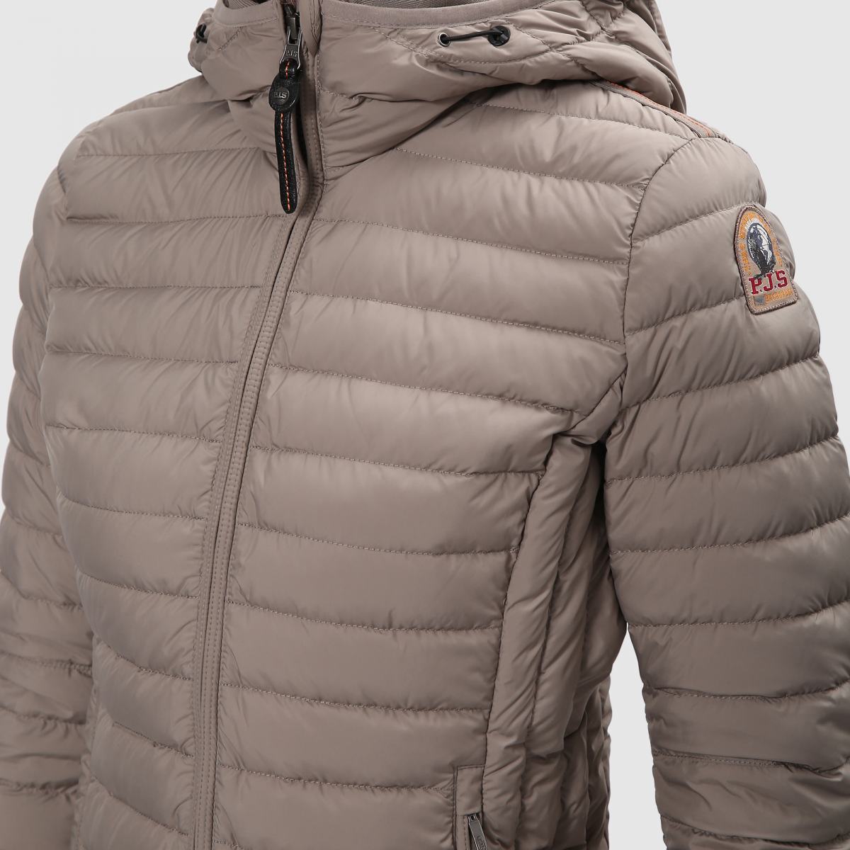 Куртка от Parajumpers из плотной ткани серого цвета. Сверхлёгкий пуховик облегающего кроя. Ткань 100% полиэстер матовая тафта с водоотталкивающей пропиткой. Наполнитель 90% утиный пух – 10% перо. Ткань – полиэстеровая матовая тафта с пухостойким покрытием. Куртка наполнена утиным пухом и перьями и имеет водоотталкивающую обработку. Капюшон на шнурке и двусторонняя молния. Два кармана на молнии и один внутренний карман. Капюшон, манжеты и нижний край с отделкой из лайкры, ребристый внутренний воротник. Вентиляция под мышками и легендарная нашивка PJS на левом рукаве.