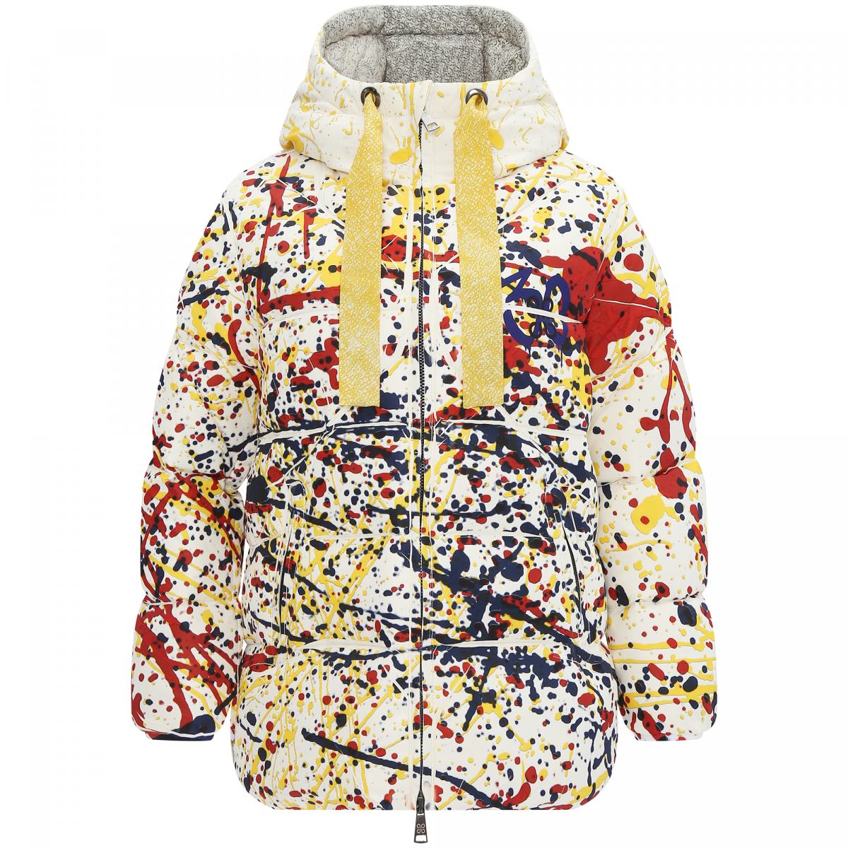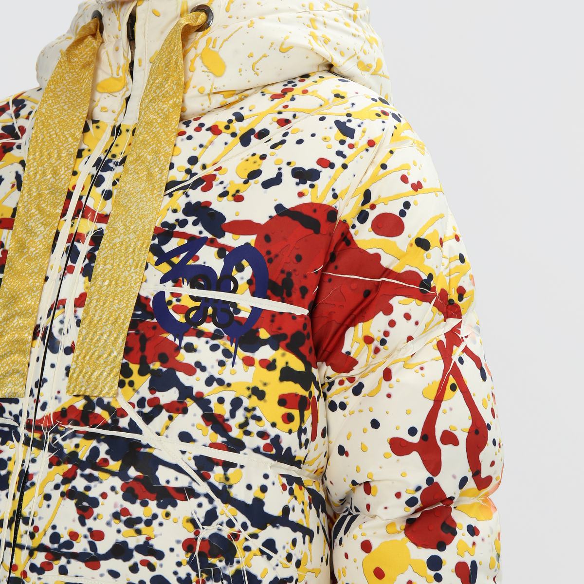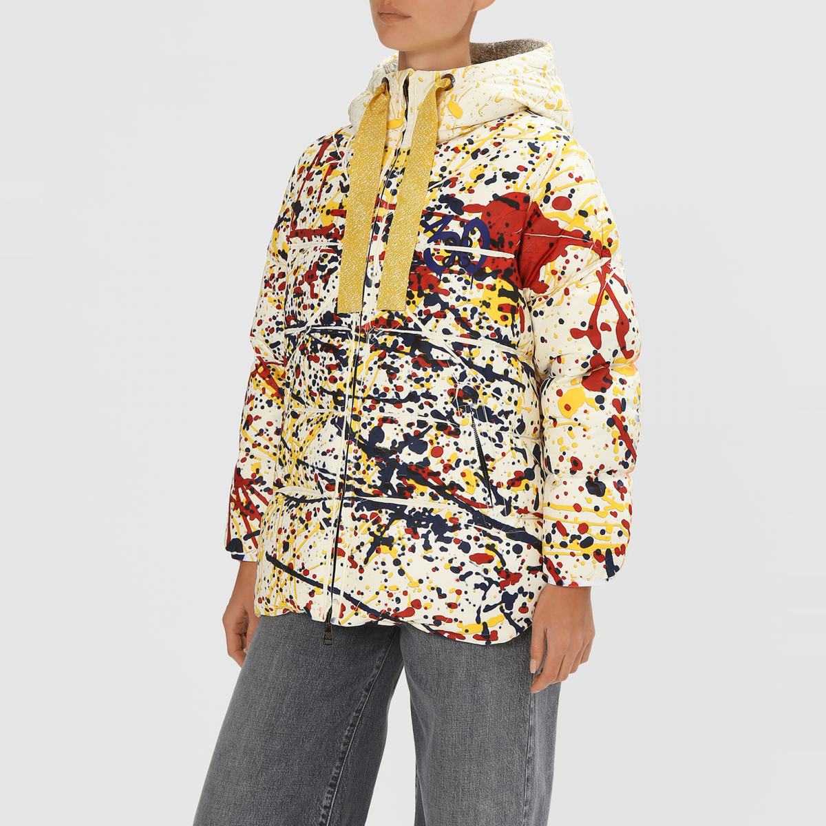Куртка с красочным принтом станет не просто предметом верхней одежды, но и оригинальным способом проявления своей индивидуальности. Модель выполнена из полиэстера и утеплена наполнителем также из полиэстера. Куртка застёгивается на двустороннюю молнию, дополнена боковыми карманами. Объёмный капюшон затягивается на крупные текстильные завязки, которые также являются акцентной деталью. Принт в виде хаотично расположенных красочных брызг позволит создавать стритвир-образы..