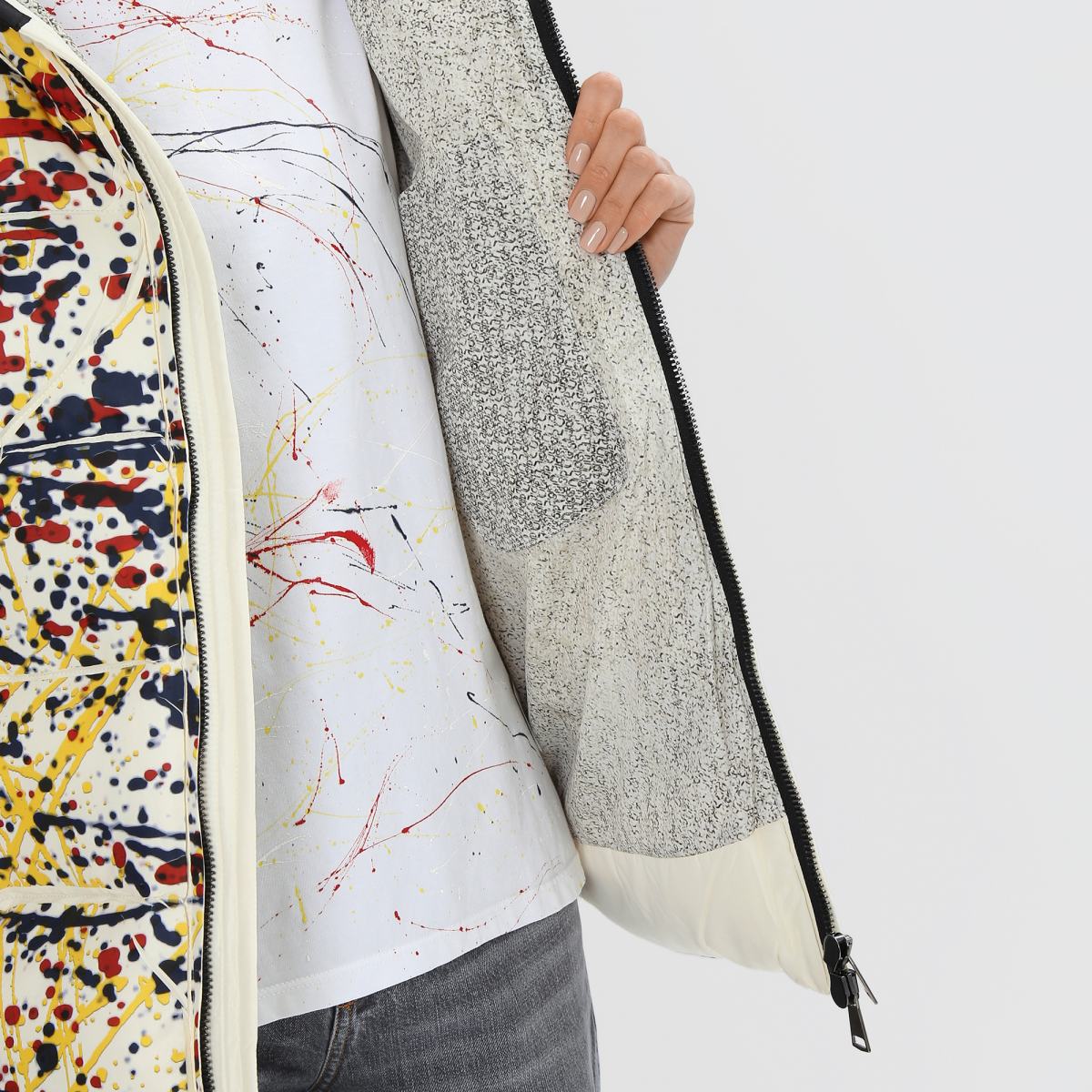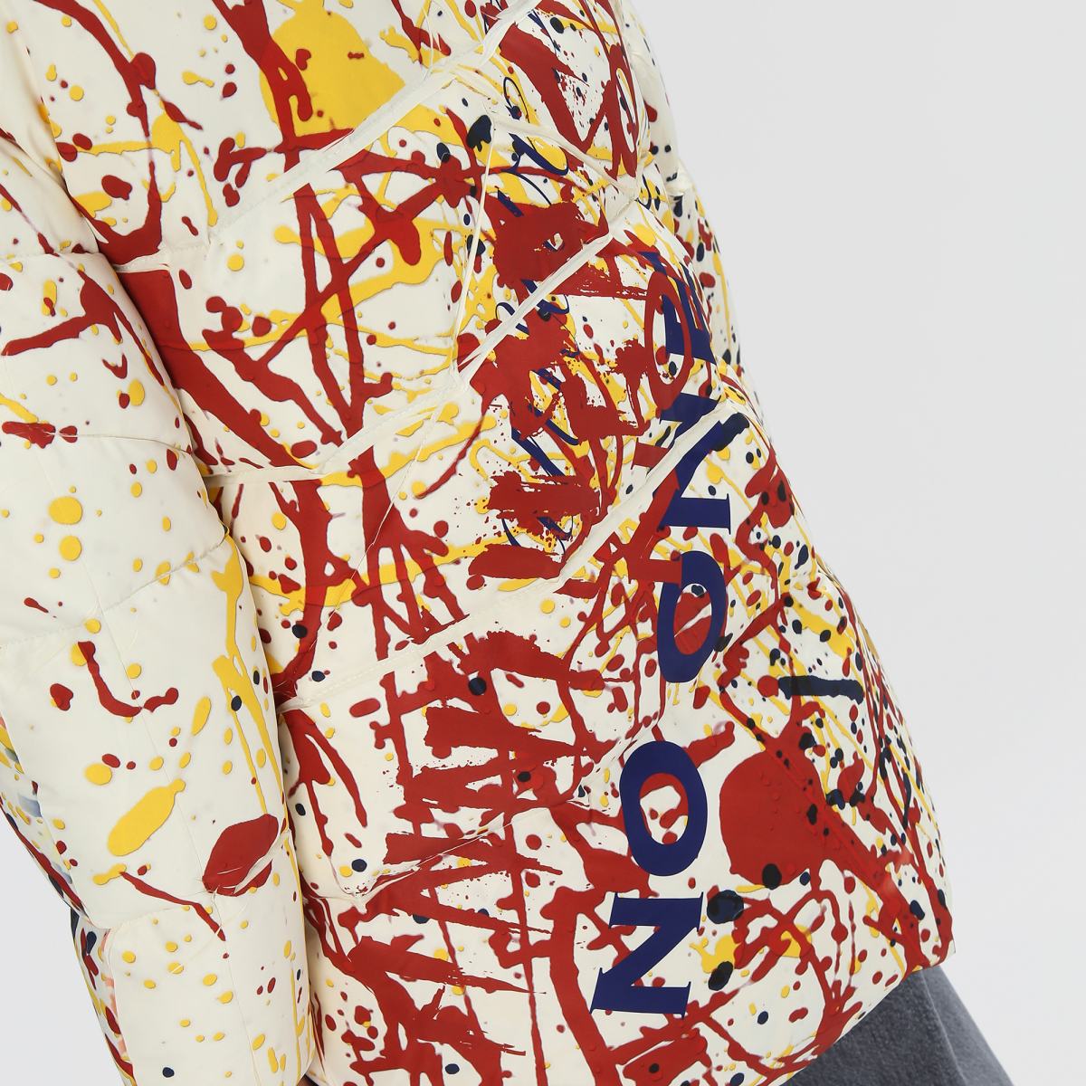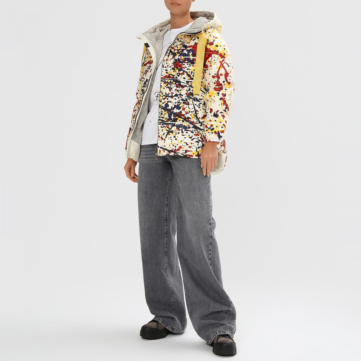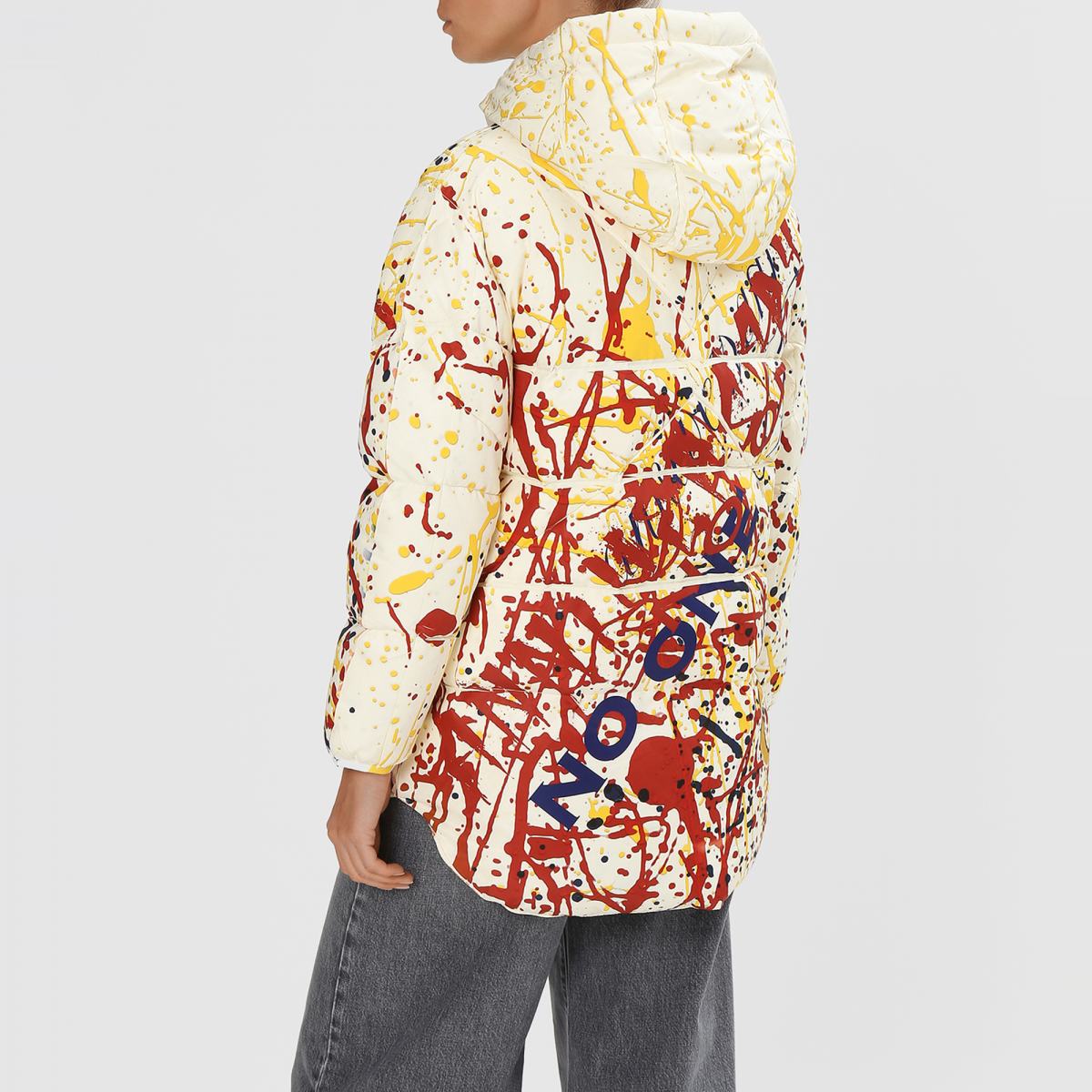 Куртка с красочным принтом станет не просто предметом верхней одежды, но и оригинальным способом проявления своей индивидуальности. Модель выполнена из полиэстера и утеплена наполнителем также из полиэстера. Куртка застёгивается на двустороннюю молнию, дополнена боковыми карманами. Объёмный капюшон затягивается на крупные текстильные завязки, которые также являются акцентной деталью. Принт в виде хаотично расположенных красочных брызг позволит создавать стритвир-образы..