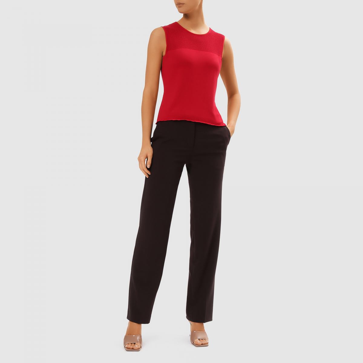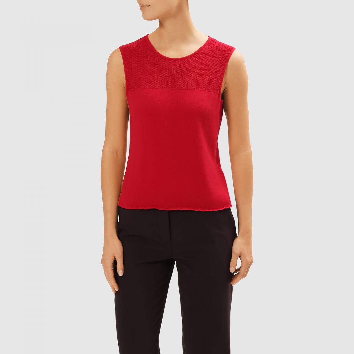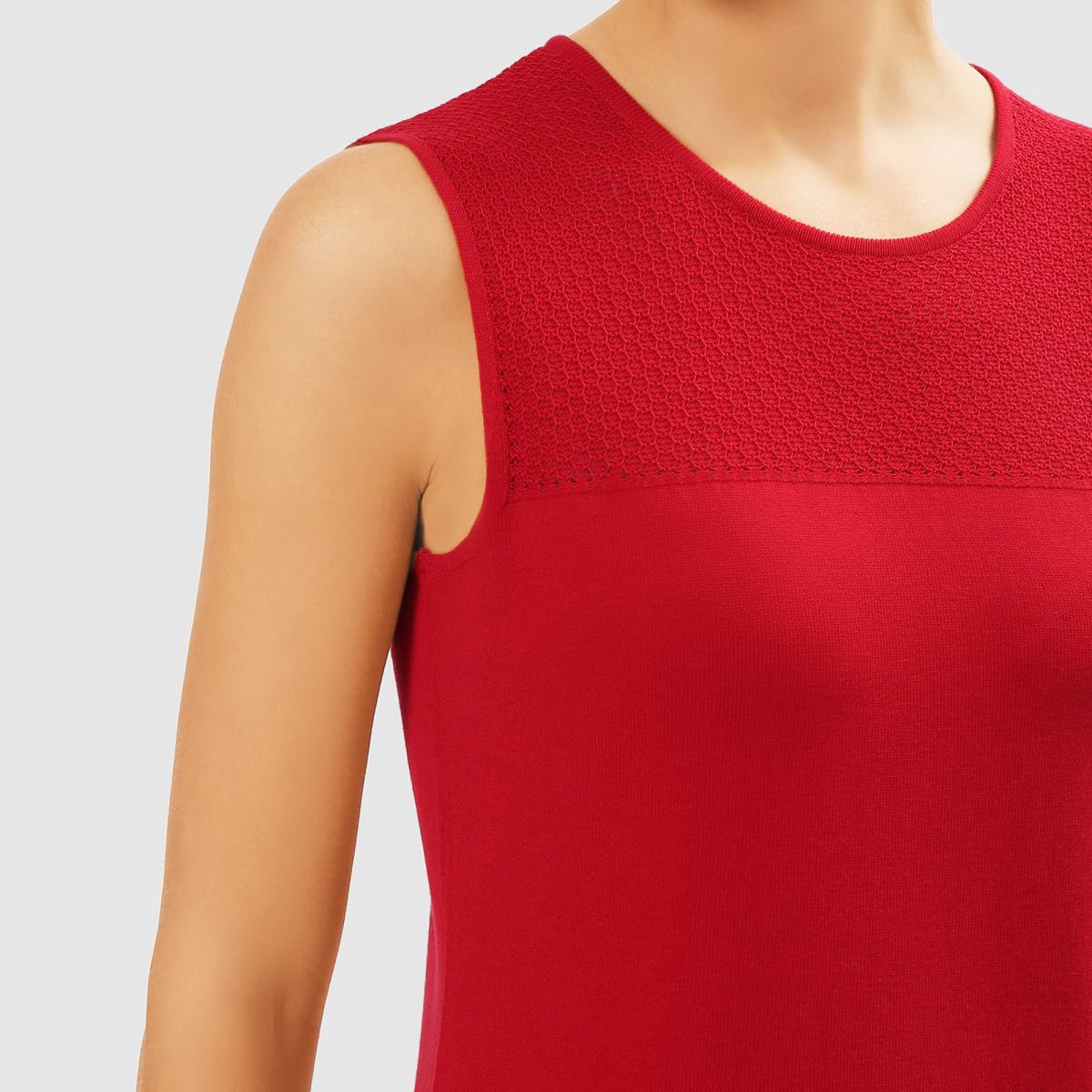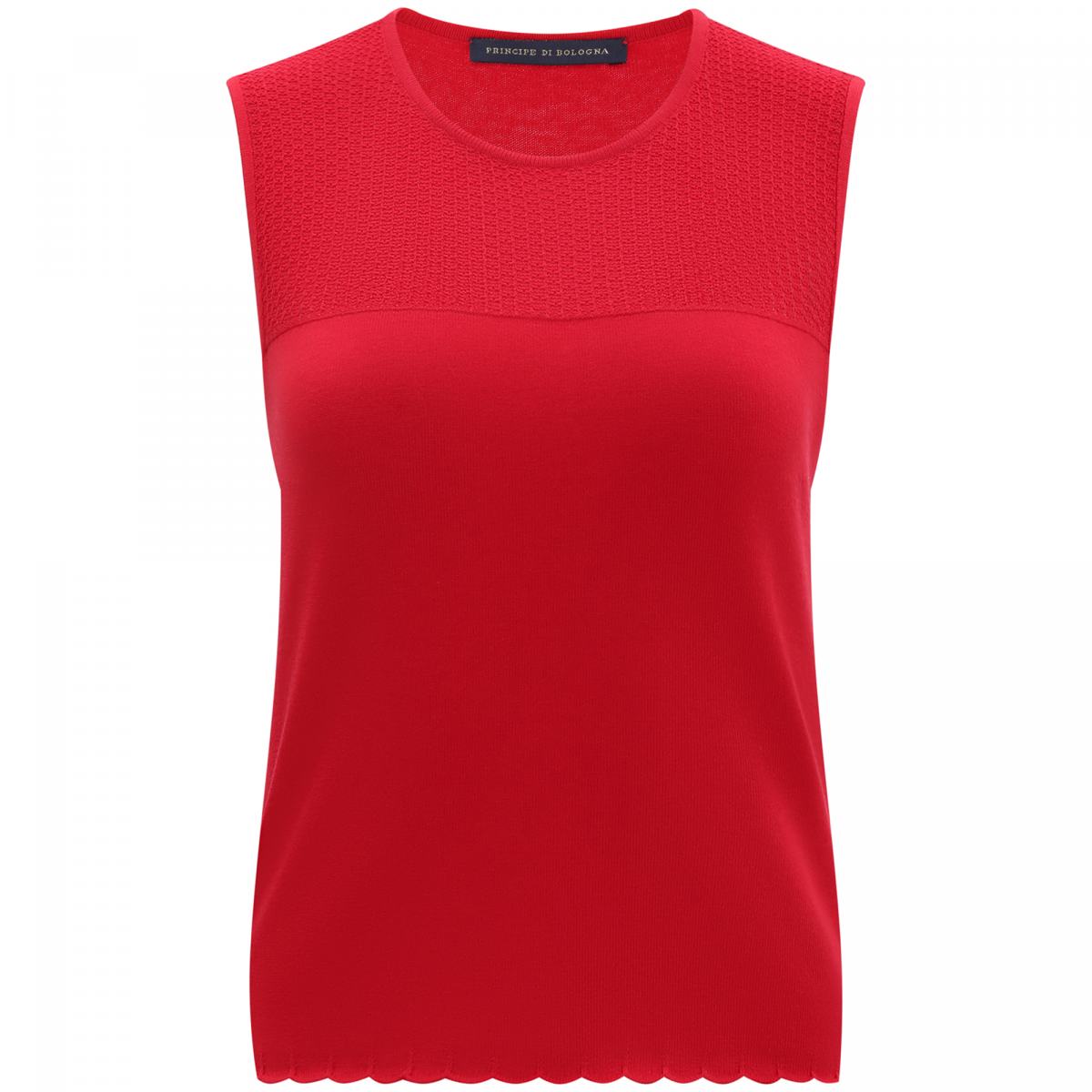 Майка из трикотажа в красном цвете от Principe di Bologna. Модель выполнена из тонкого трикотажа, в составе которого 67% вискозы, 29% акрила и 4% полиэстера. За счёт добавления акриловых нитей, модель прекрасно держит форму и подчёркивает фигуру. Носите её в качестве второго слоя под пиджак или как самостоятельный верх, сочетая с широкими брюками или юбками длины миди.