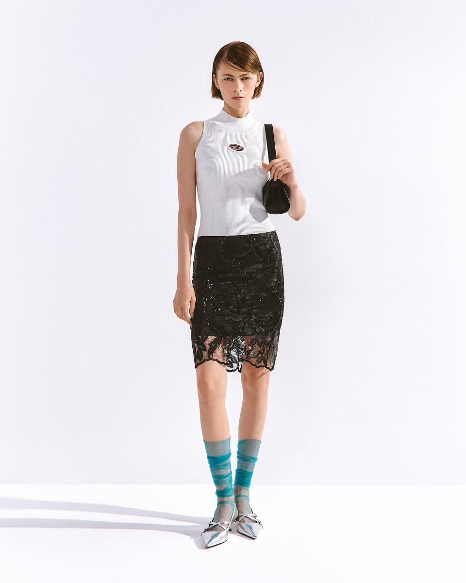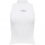 Этот женский топ без рукавов от Diesel выполнен из гибкого ребристого трикотажа, обеспечивающего плотную посадку и облегающий фигуру. Слегка укороченная модель с высоким воротником и обновленной интерпретацией логотипа Oval D: в вырез на груди вставлена металлическая пластинка, открывающая тонкие проблески кожи.