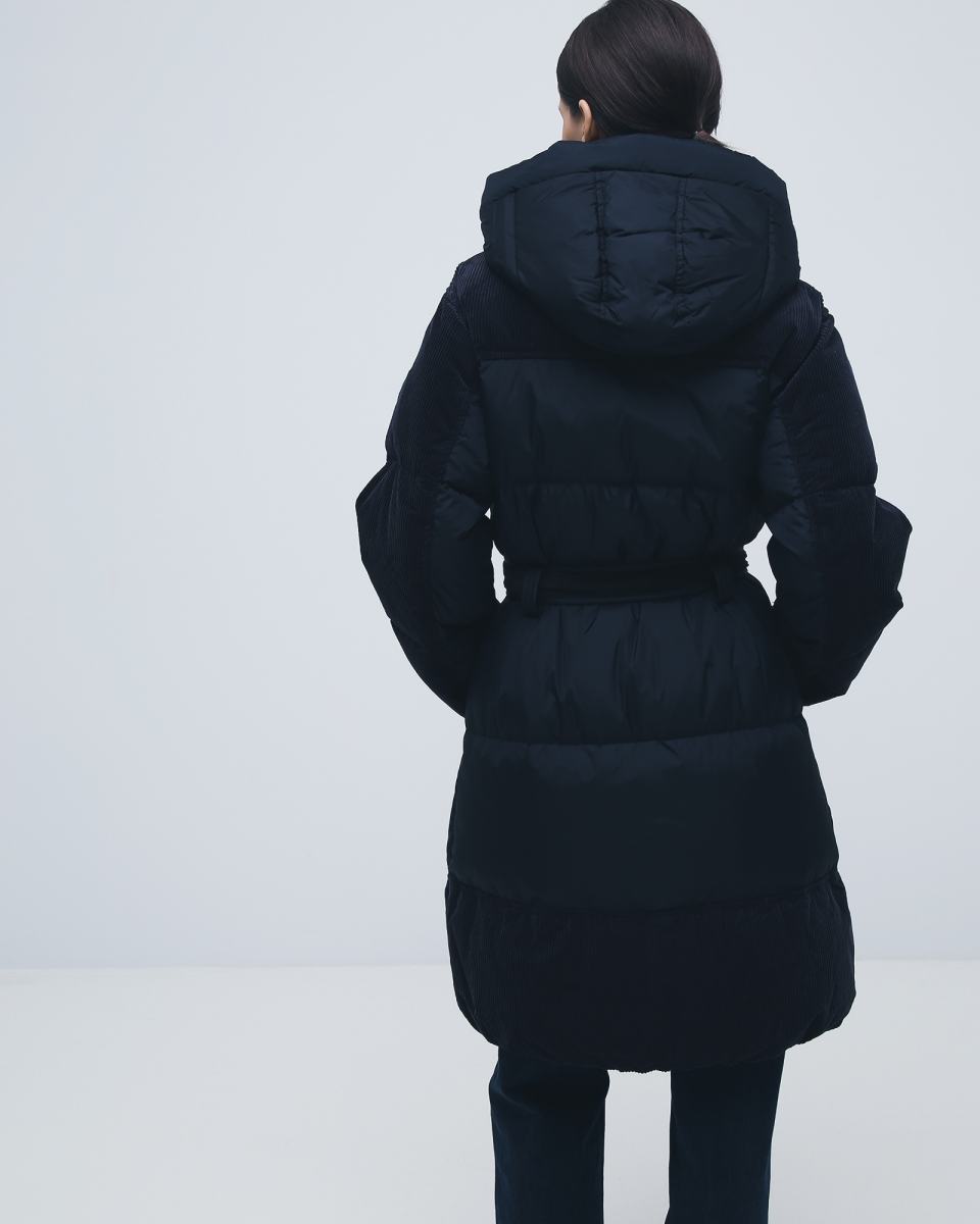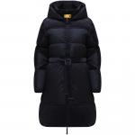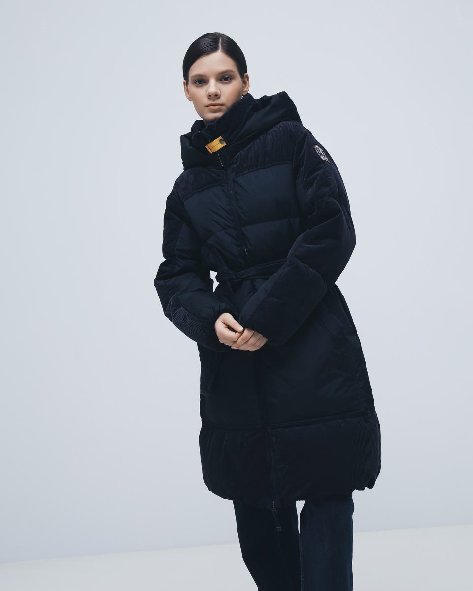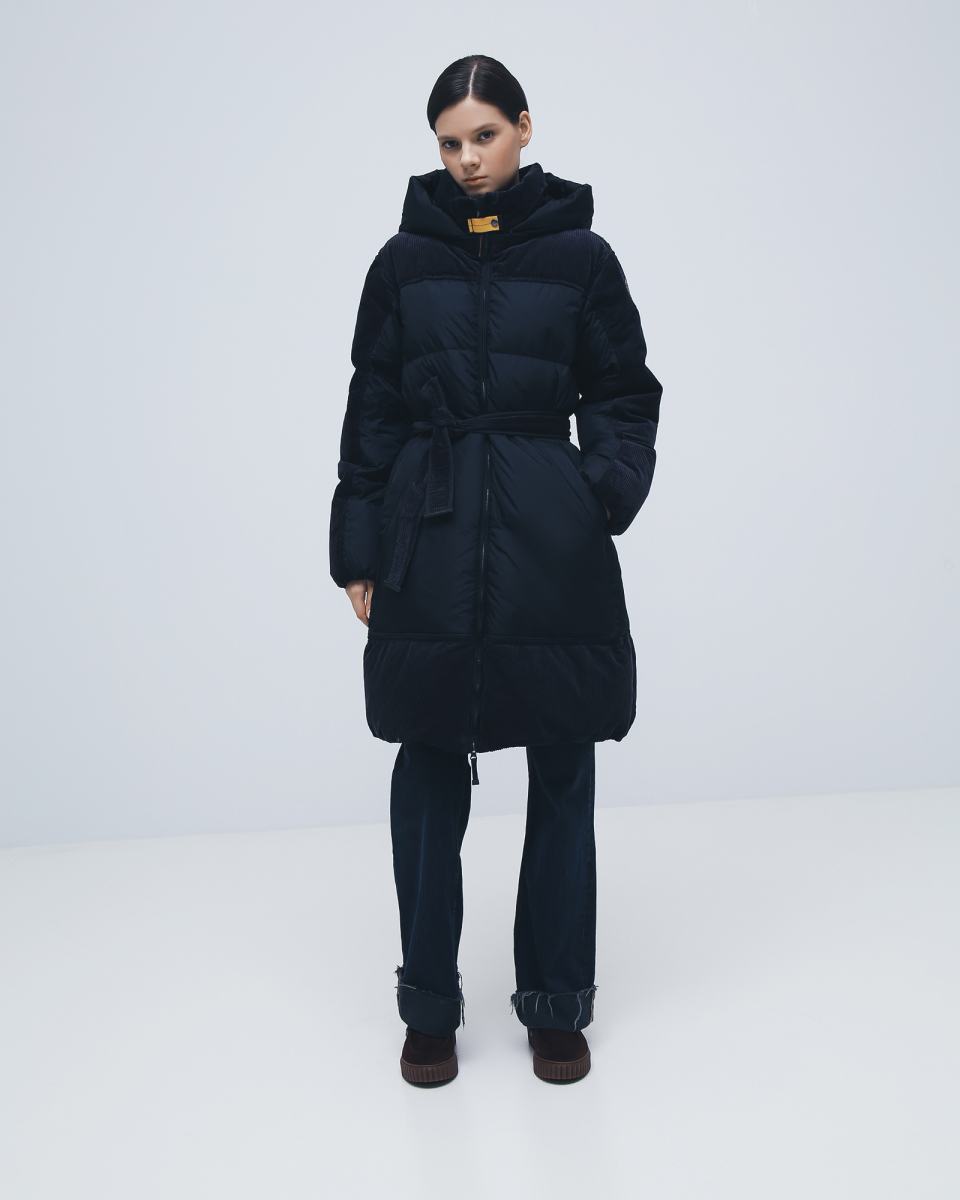 Пальто-пуховик в тёмно-синем цвете от Parajumpers. Пуховик Interstellar — эта комбинация мягкой и стильной бархатистой оболочки и теплого сердца. Двусторонняя молния спереди и съемный капюшон. Два кармана на кнопках и один внутренний сетчатый карман. Пояс на талии, эластичные манжеты и низ. Фирменная деталь в виде нашивки. Основная ткань: нейлоновый репс с водоотталкивающей пропиткой и полиуретановым покрытием на изнаночной стороне. Дополнительная ткань: хлопковый вельвет. Наполнитель: пух 90/10 и перья.
