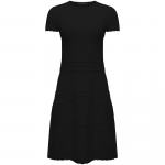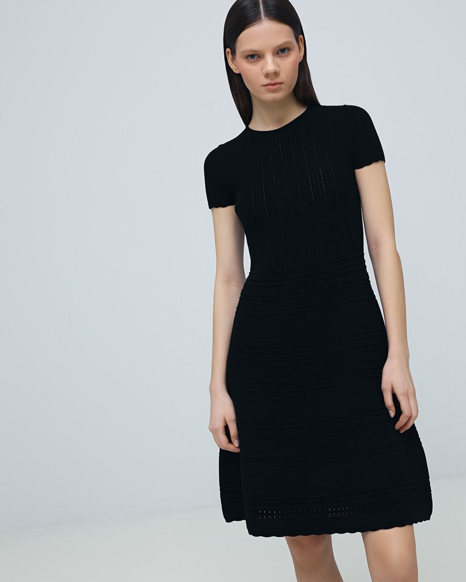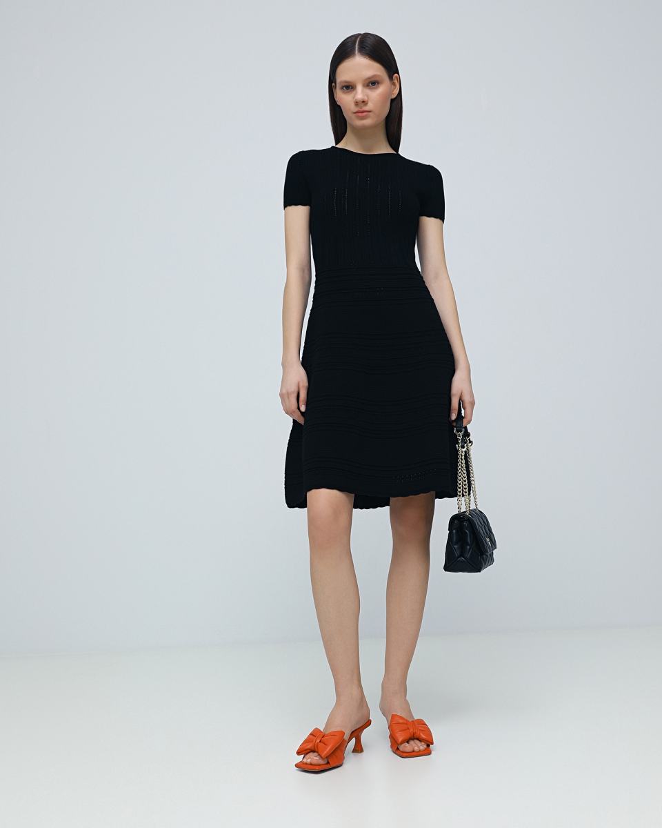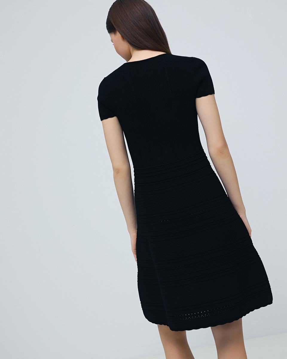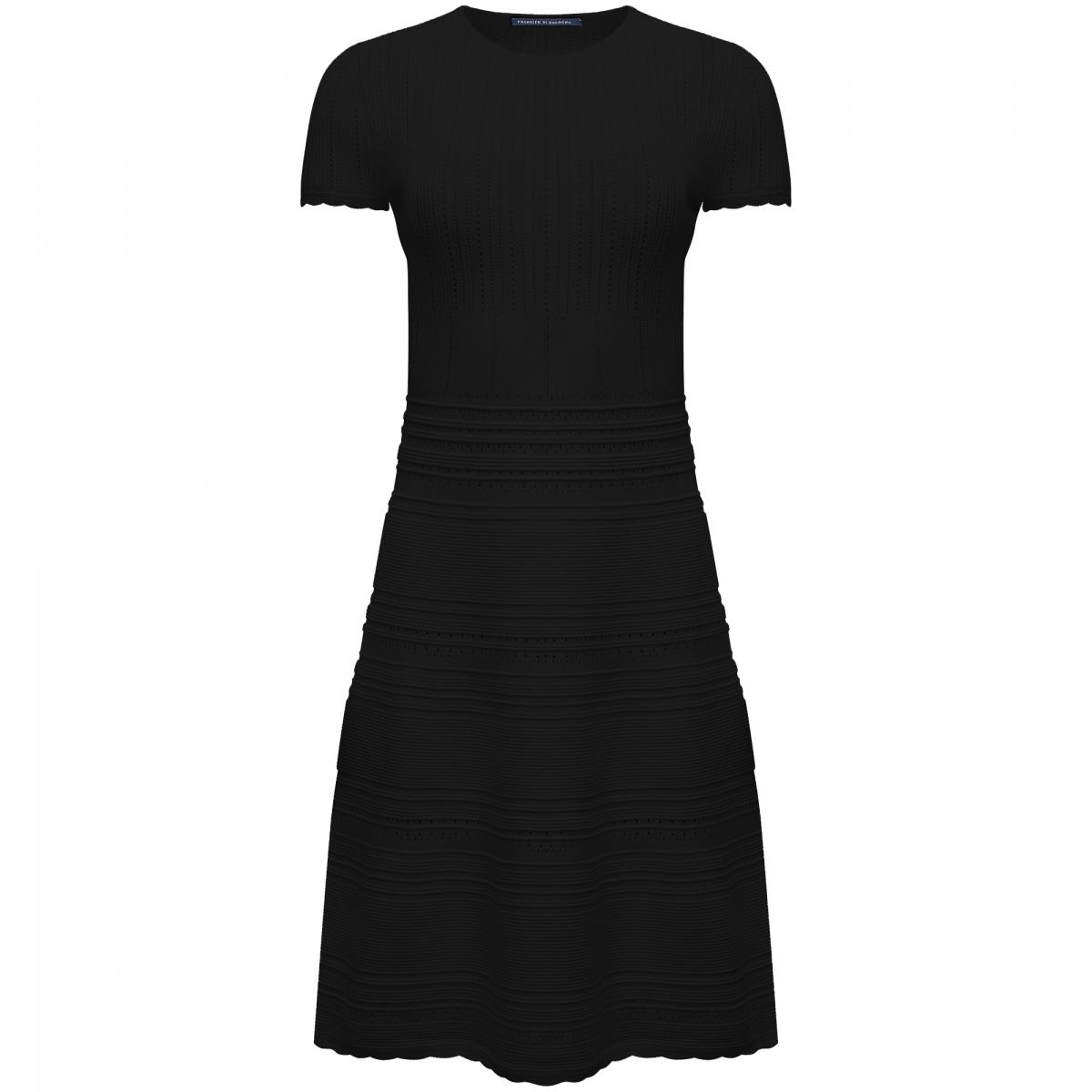 Черное вязаное платье Principe di Bologna станет основой базового гардероба. Модель выполнена из трикотажа, в составе которого 70% вискозы и 30% полиэстера. Рисунок вязки делает это платье комфортным вариантом даже для жаркой погоды. При этом платье можно носить и в более прохладные дни, сочетая с жакетом или вязаным кардиганом.