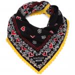 Платок с романтичным принтом от Moschino. Чёрный платок с яркой жёлтой окантовкой и принтом в виде сердец и цветов добавит образу романтичности. 100% шёлк в составе придаёт изделию особую гладкость и прочность. Длина и ширина платка 90 сантиметров.