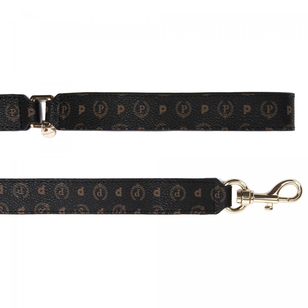 Поводок из эко-кожи чёрного цвета от Pollini. Стильный аксессуар из капсульной коллекции бренда выполнен из искусственной кожи и украшен фирменным принтом. Удобный кошелёк на молнии позволит взять с собой на прогулку с питомцем необходимые мелочи. Крепление к ошейнику на карабин.