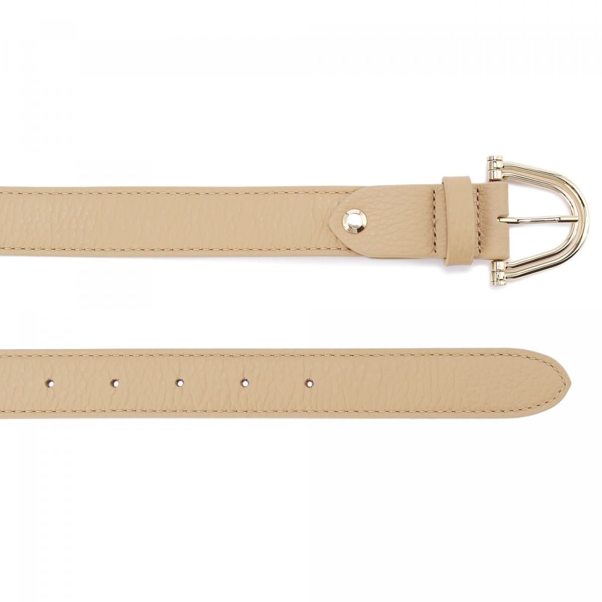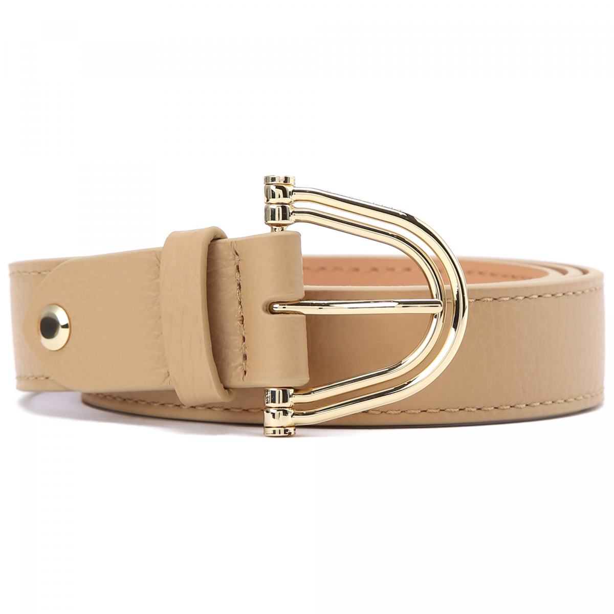 Бежевый кожаный ремень от Coccinelle. Кожаный ремень с металлической пряжкой золотого цвета. Эта модель изготовлена из кожи, обработанной на специальном оборудовании, а затем отжатой, чтобы сохранить ее мягкость. Это очень прочная кожа, которая легко поддается чистке и идеально подходит для ежедневного использования. Ширина ремня - 3 см.