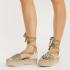 Сандалии в оттенках бежевого и зелёного идеальны для летних образов в натуральном стиле. Модель выполнена из текстиля, на оплетённой платформе и резиновой подошве. Внутри подклад из натуральной кожи и стелька из текстиля. Стопу фиксируют текстильные завязки. Передняя часть украшена крупными стразами. Сандалии подойдут как для пляжных вечеринок, так и для городских образов.