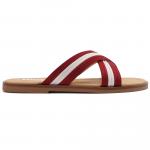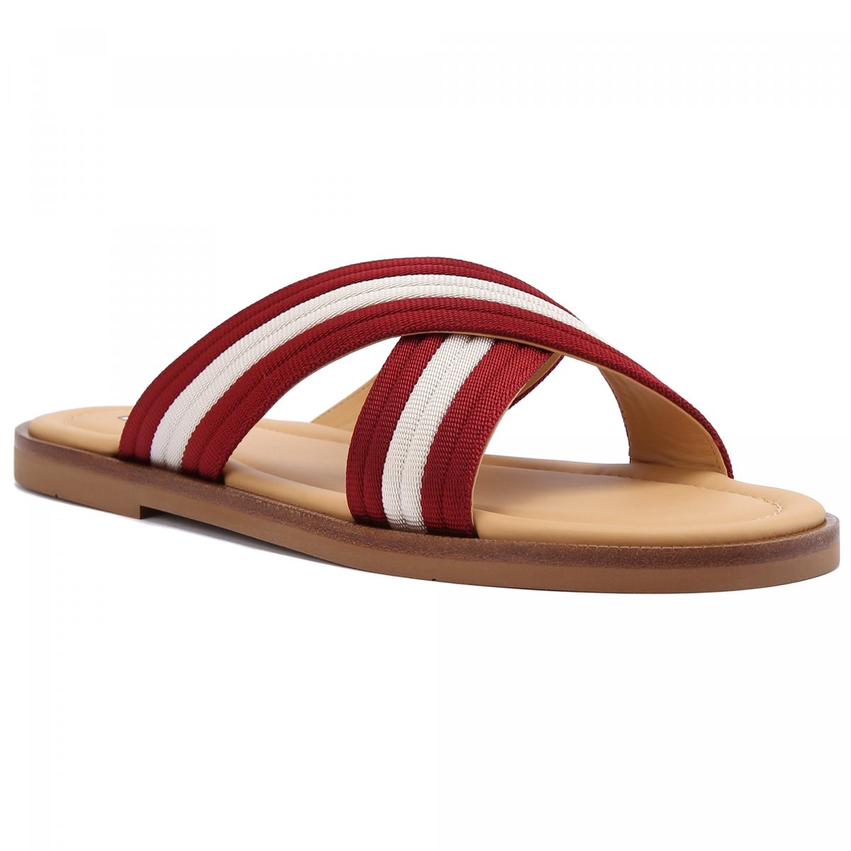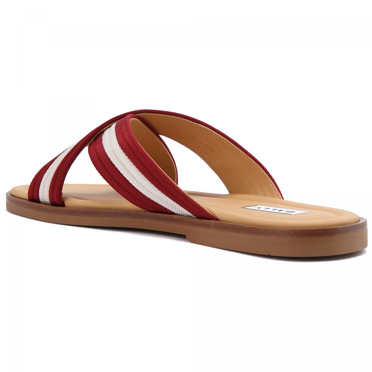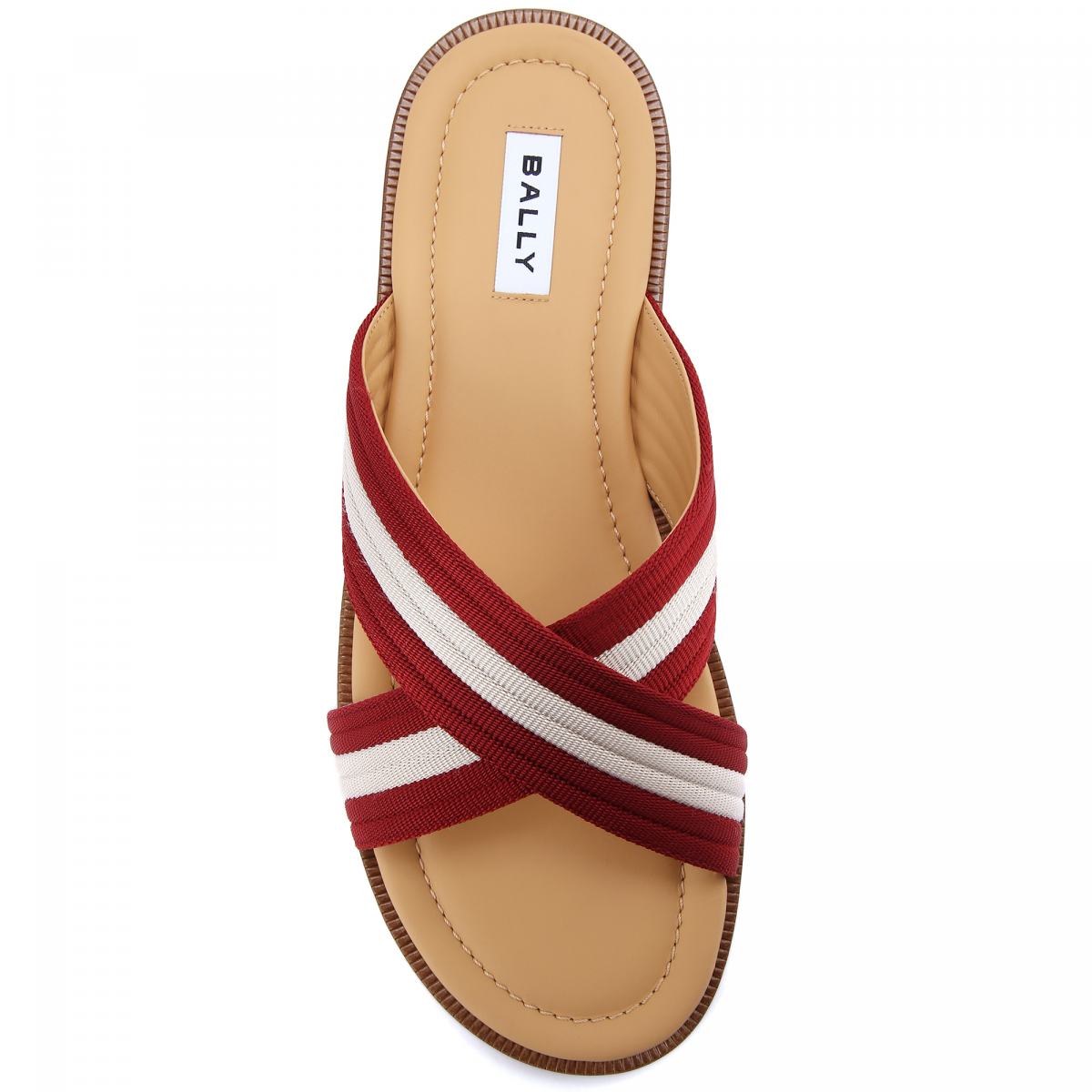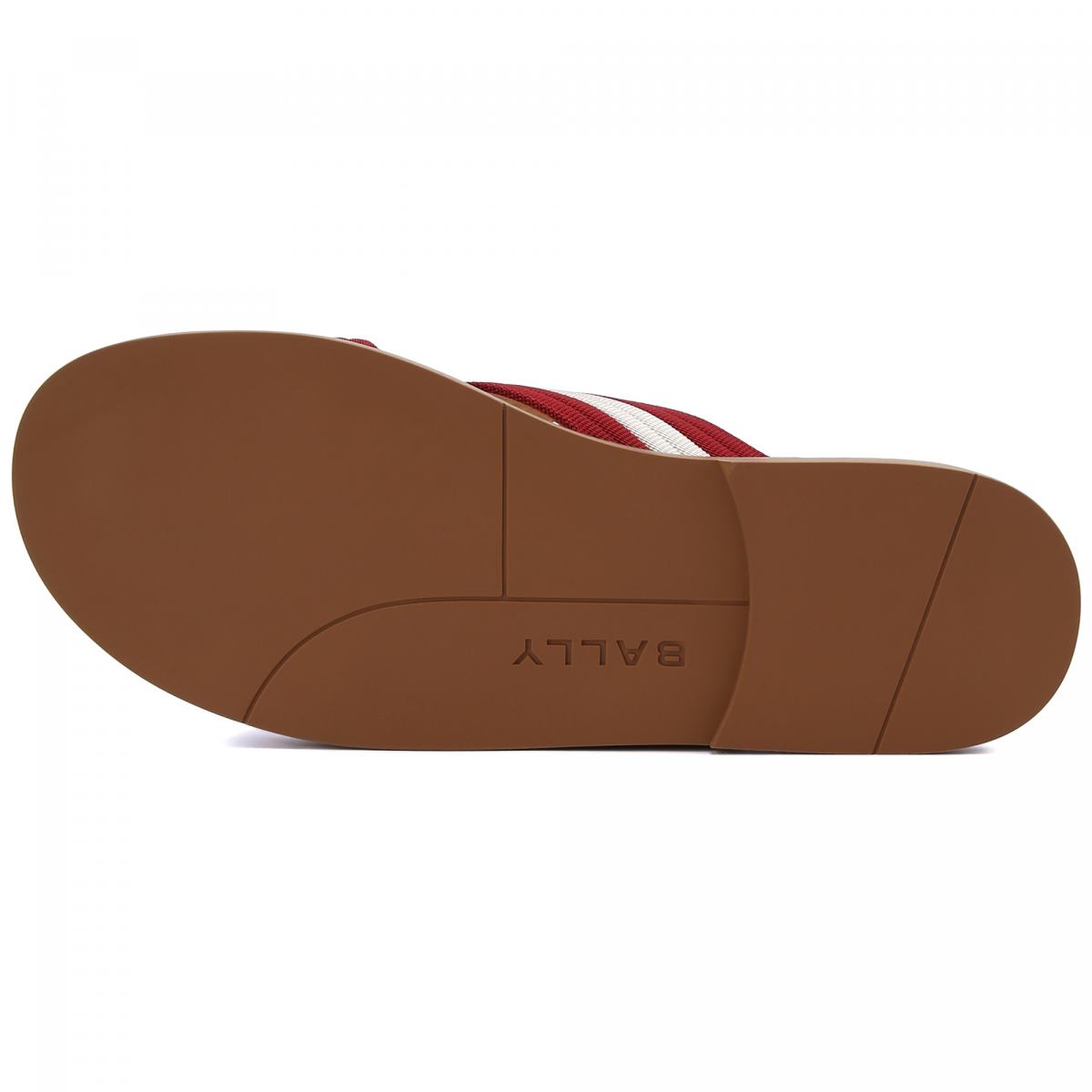 Текстильные сандалии от Bally. Верх выполнен из текстильных лент белого и красного цвета, материал подкладки и стельки - натуральная кожа. Дизайн завершает удобная резиновая подошва.