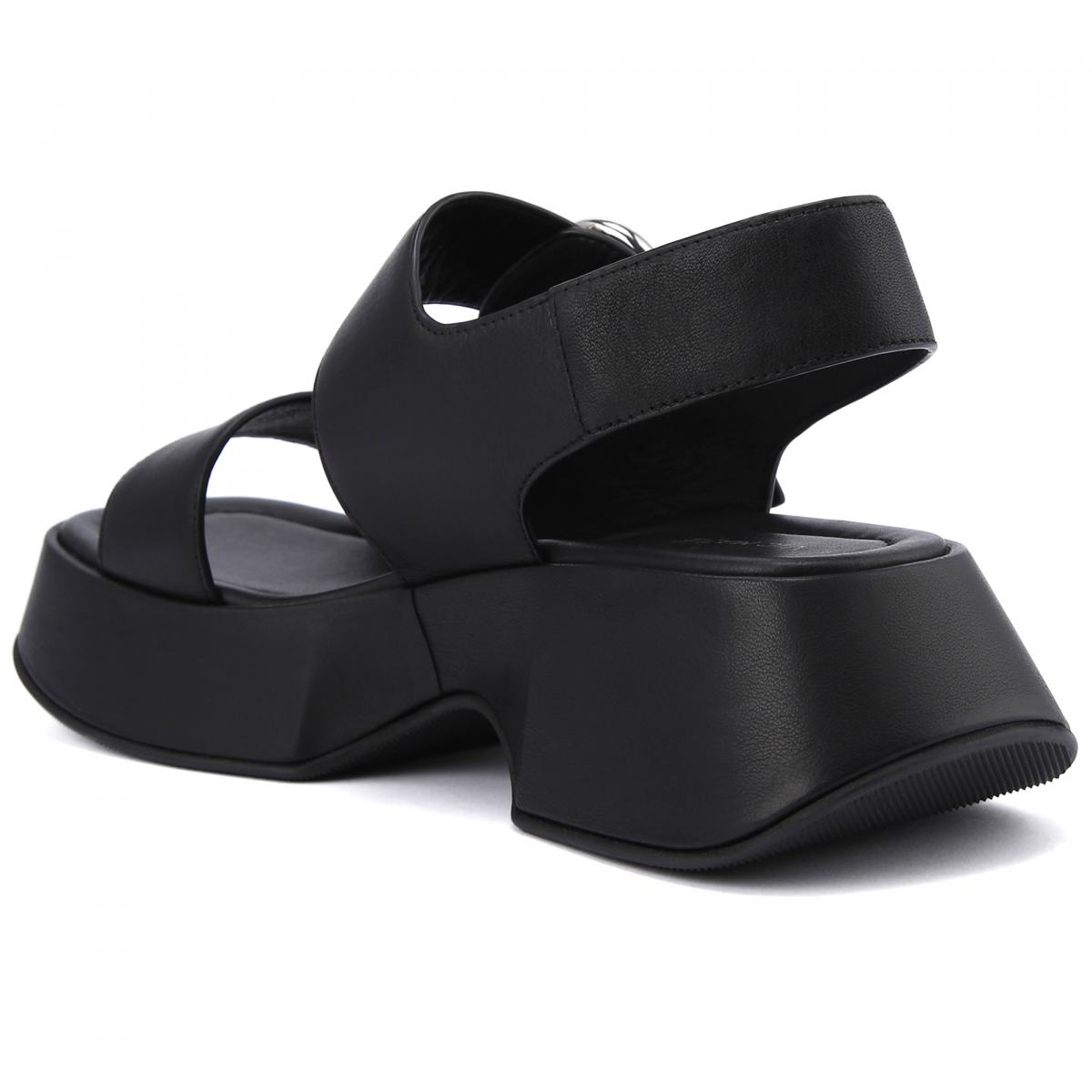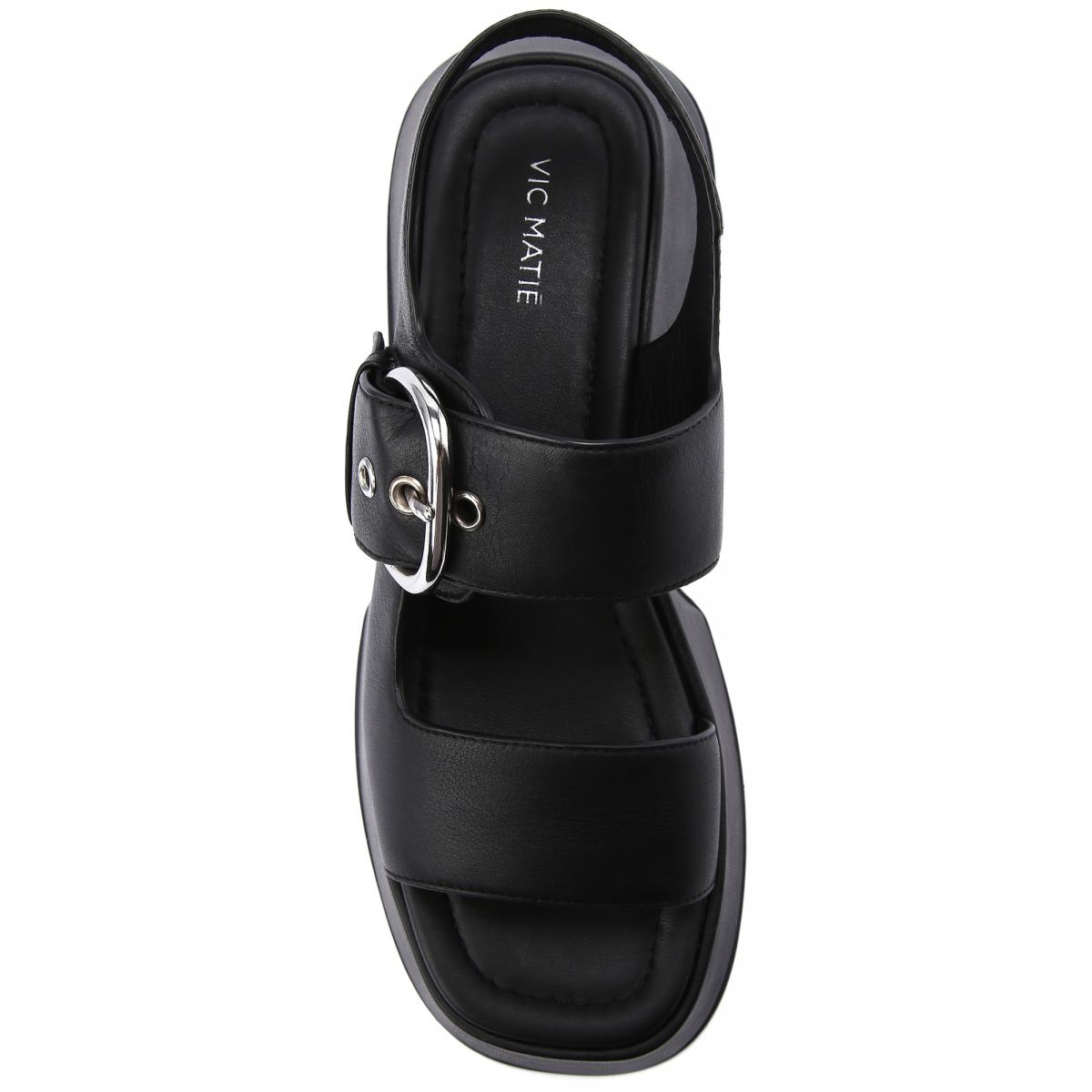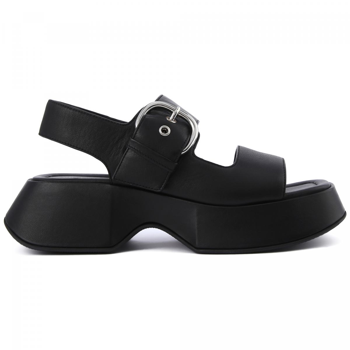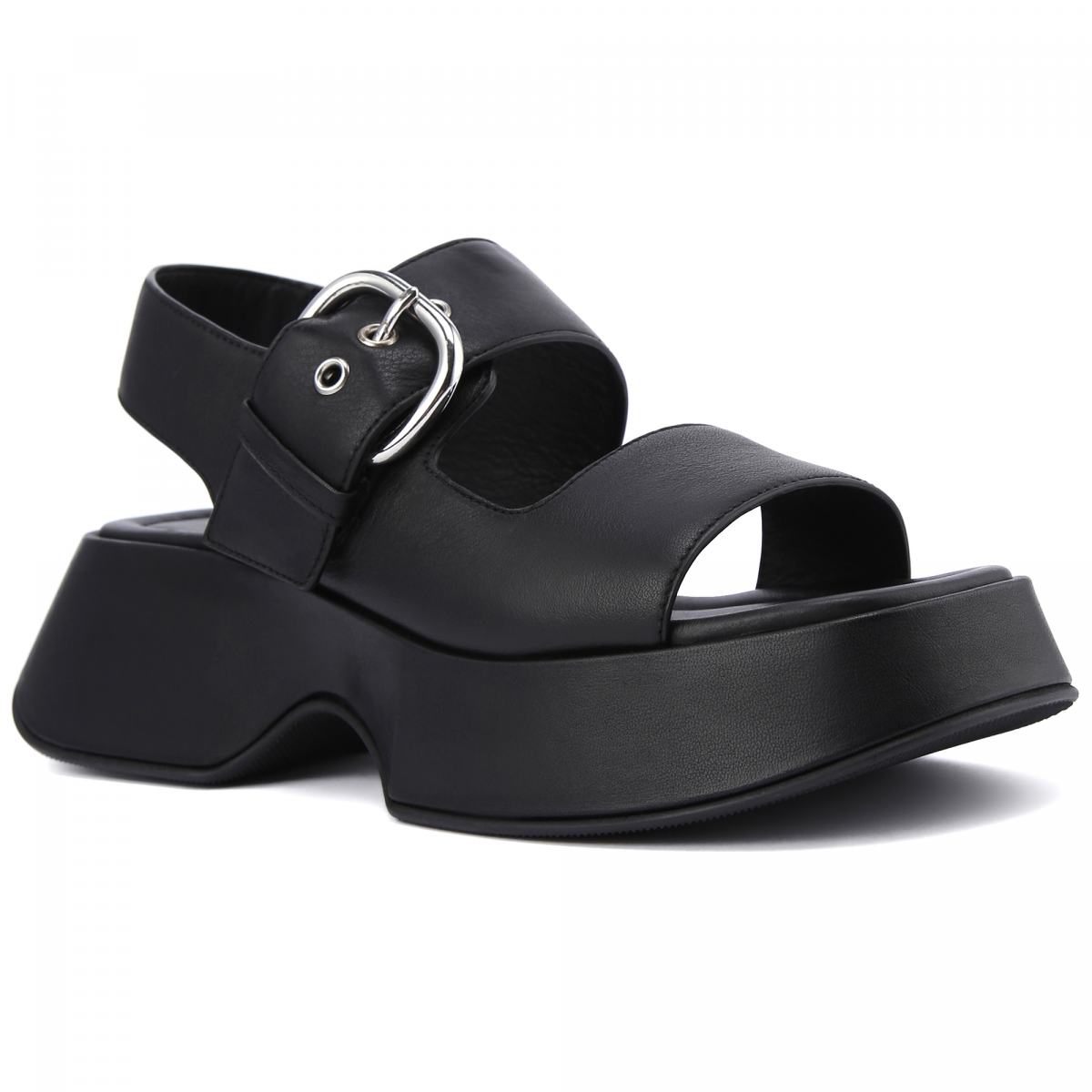 Сандалии из кожи в черном цвете от VIC MATIE’. Сандалии с широким ремешком выполнены из мягкой телячьей кожи наппа черного цвета. Пара с регулируемыми пряжками и ремешком сзади. Платформа обтянута той же кожей, что и верх. Удобная мягкая стелька выполнена из натуральной кожи. Резиновая подошва с нескользящей текстурой.