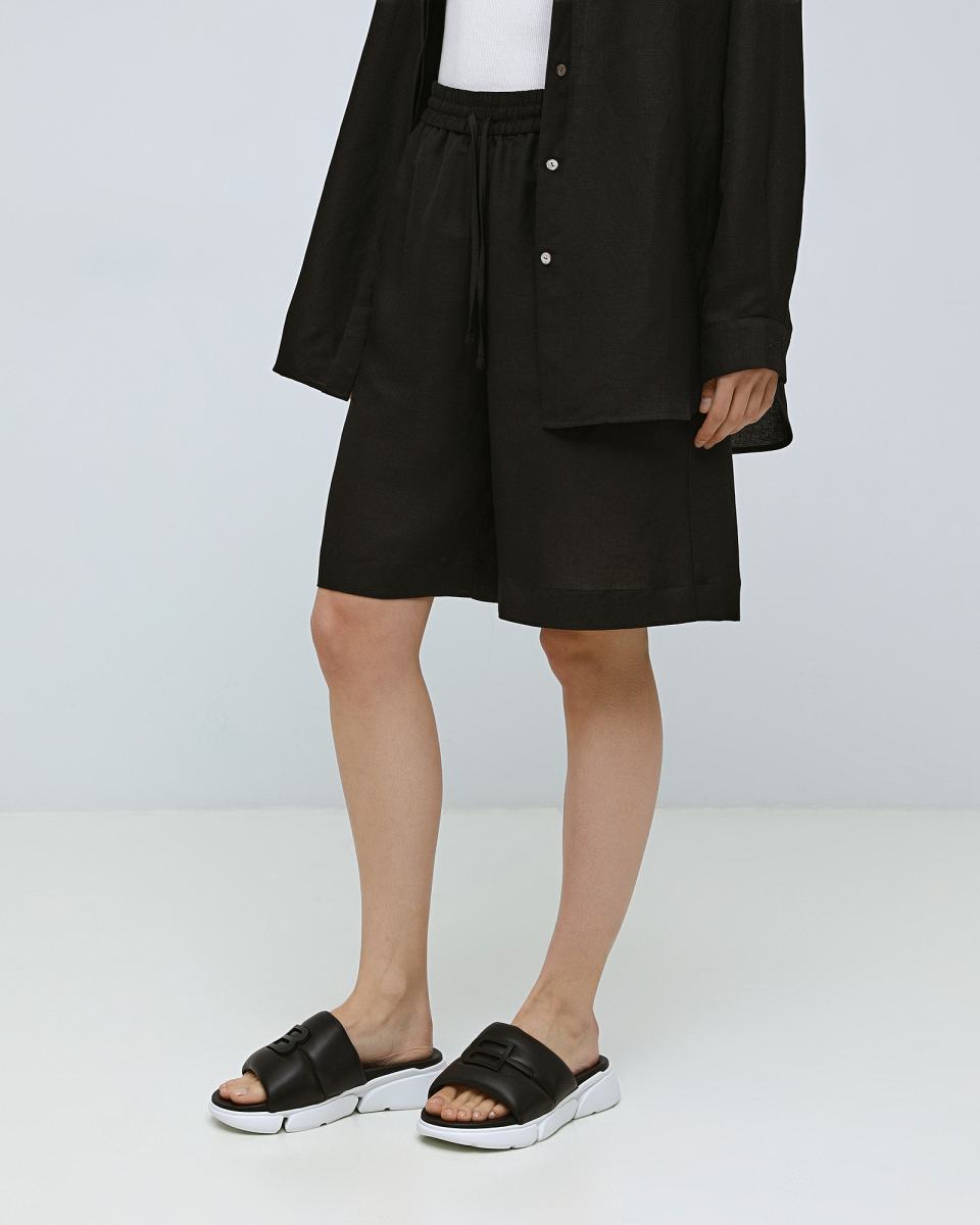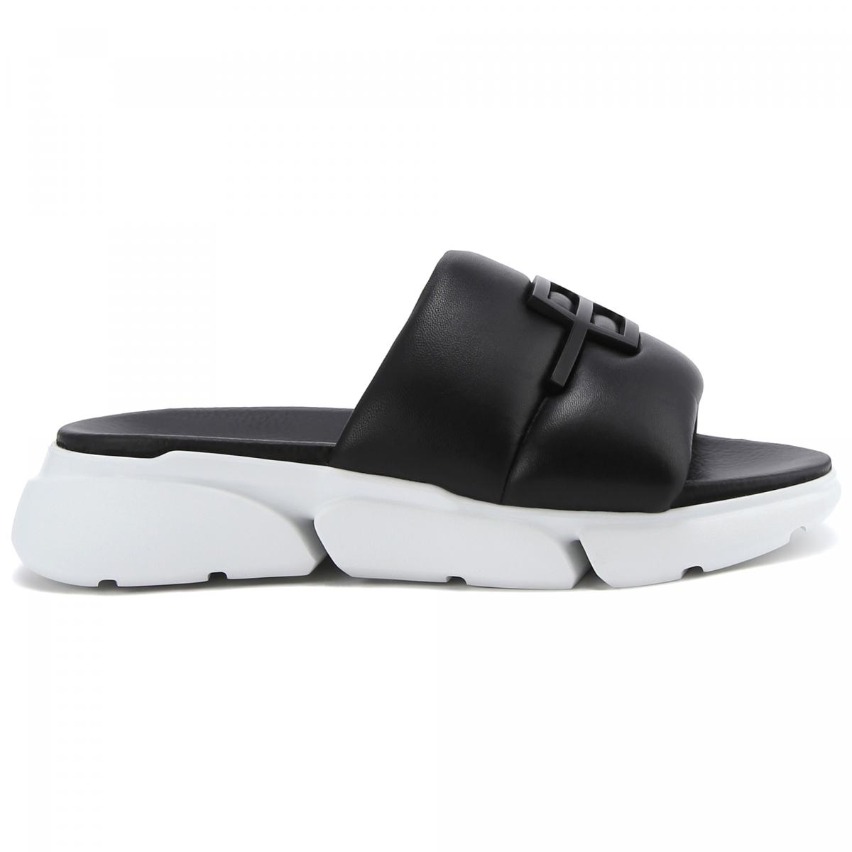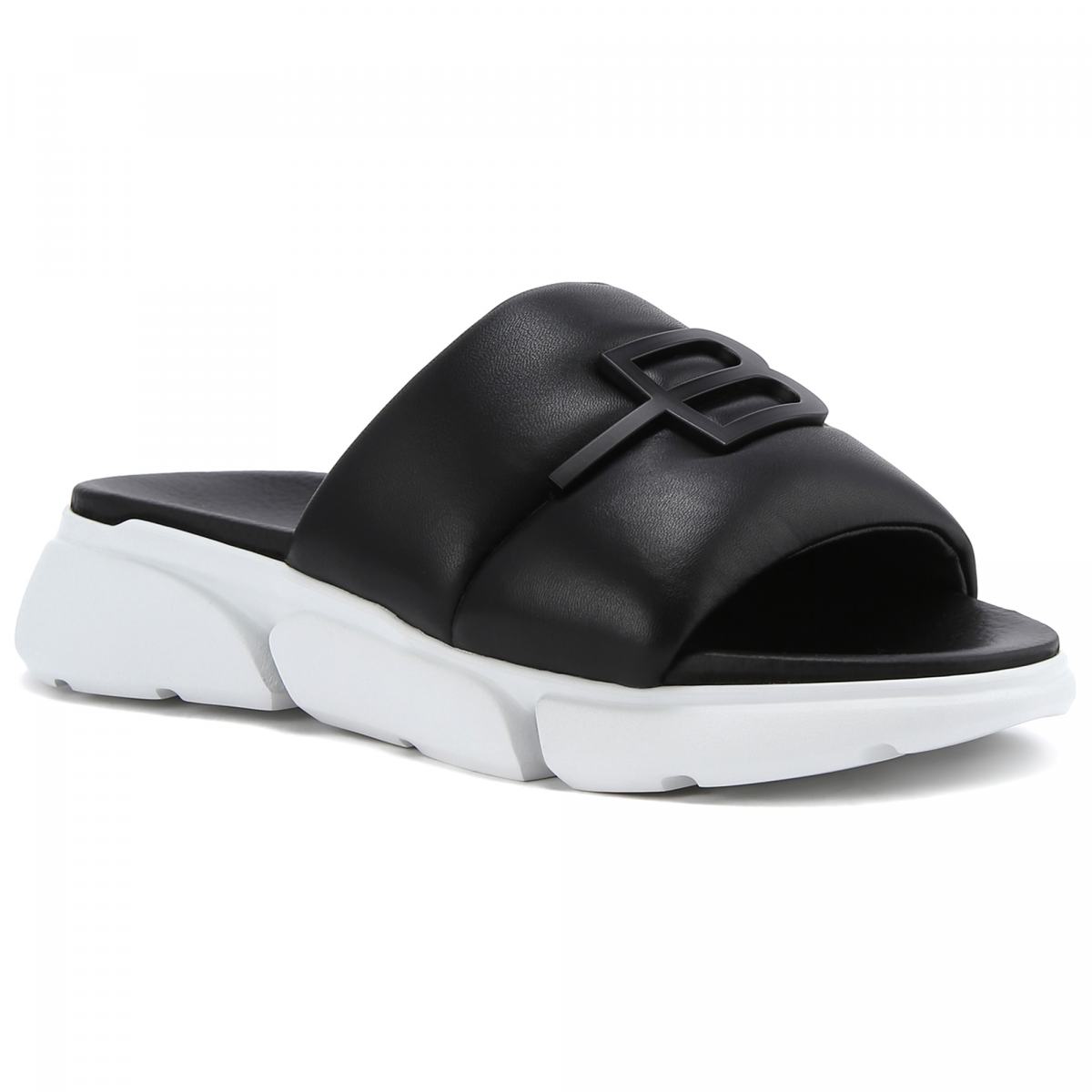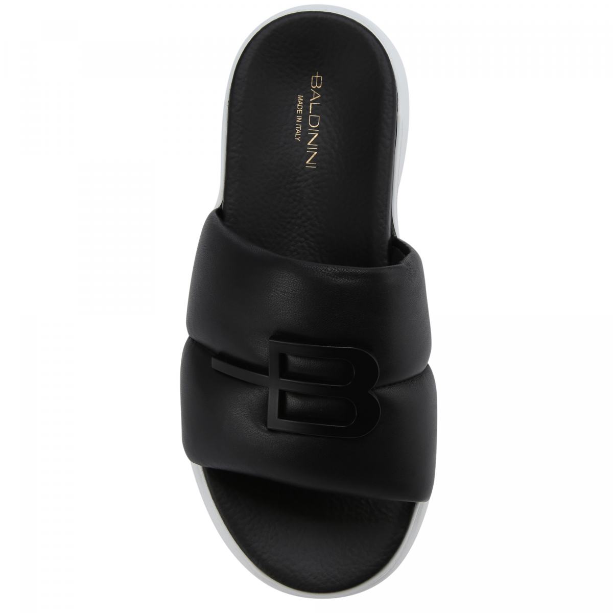 Сабо из натуральной кожи в чёрном цвете от Baldinini. Чёрные сабо помогут создать множество женственных образов. Модель выполнена из гладкой натуральной кожи, на высокой резиновой подошве. Такую пару легко вписать в образы с платьями, сарафанами и юбками любой длины. Акцент дизайна - фирменный знак бренда спереди.