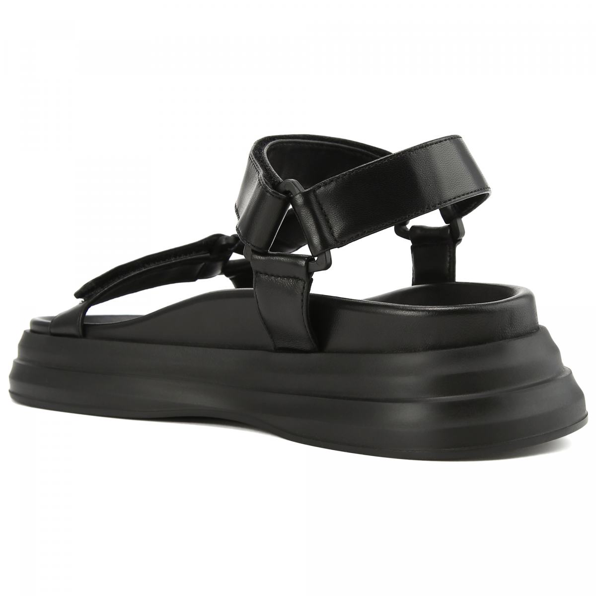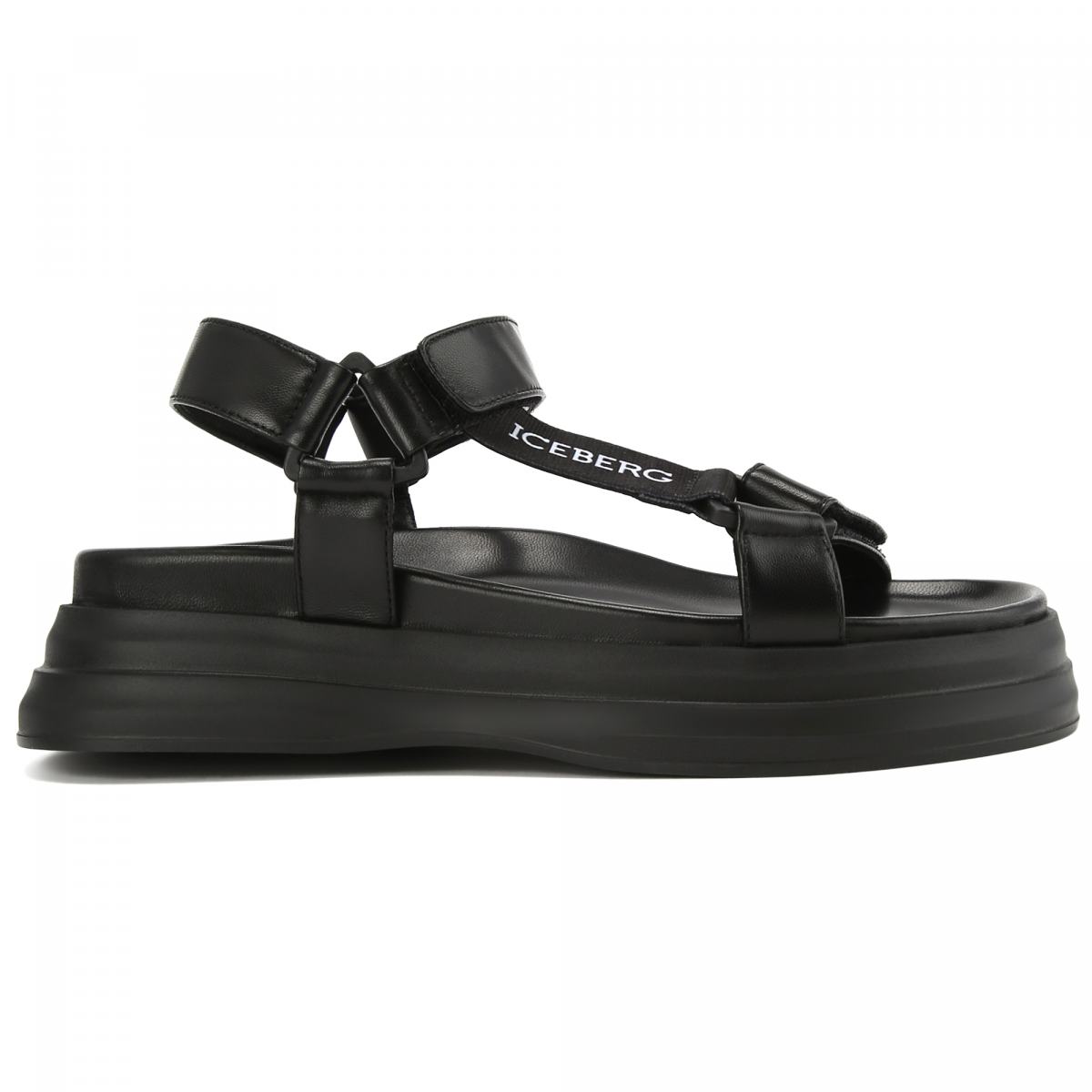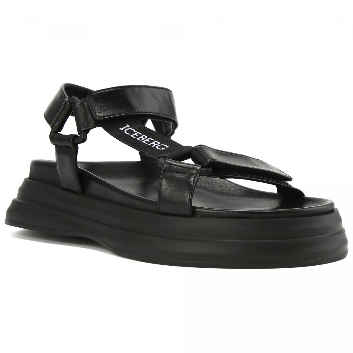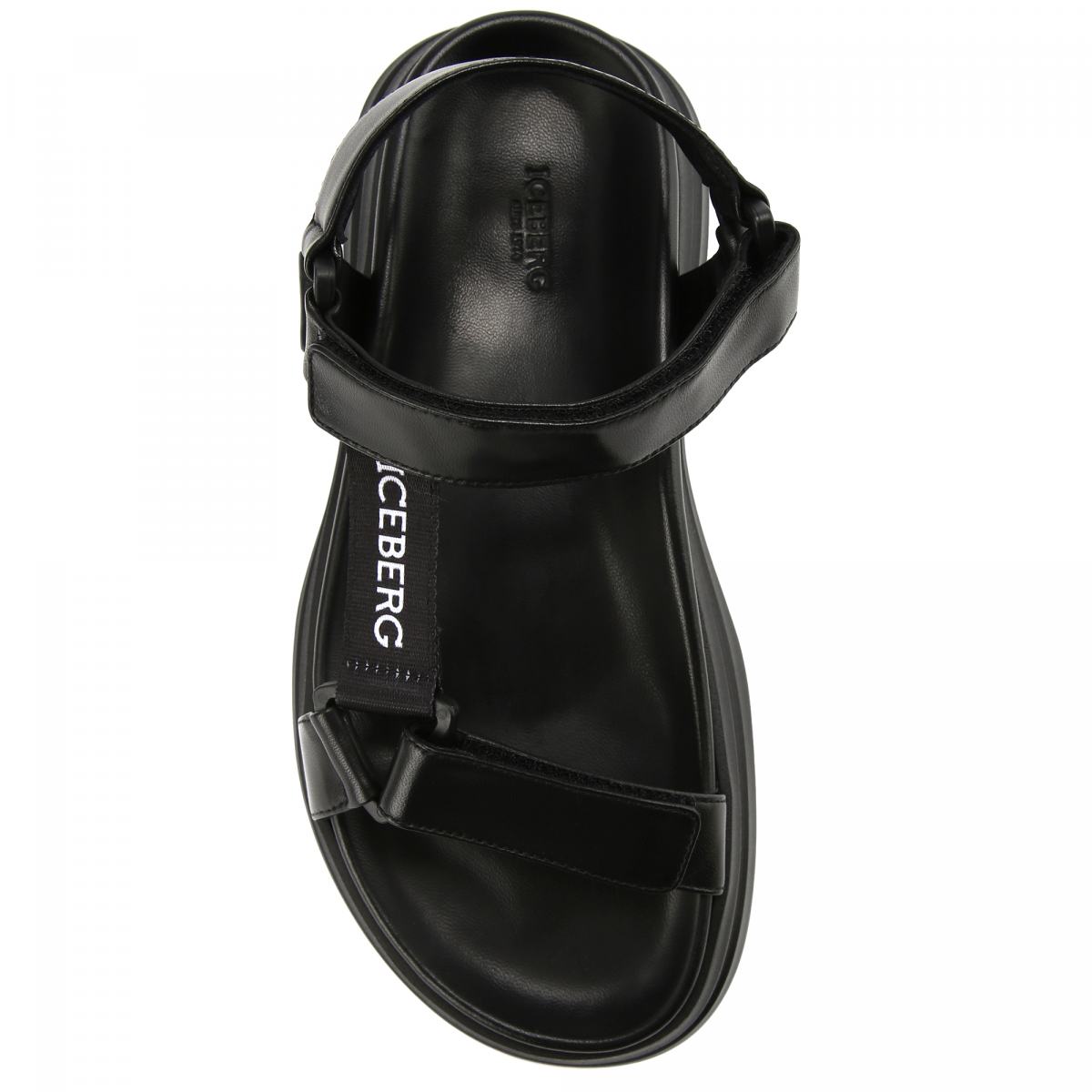 Чёрные сандалии из натуральной кожи от Iceberg. Ремешки модели выполнены из мягкой наппы. Сандалии оснащены застёжками на липучки, позволяющими подогнать посадку. Анатомичная стелька из кожи, высокая резиновая подошва.