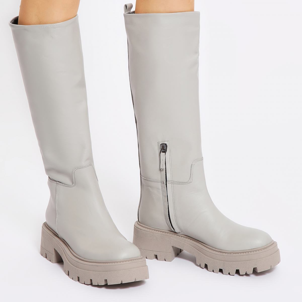 Сапоги на массивной подошве помогут создать стильный и немного дерзкий образ. Модель в светло-сером цвете выполнена из натуральной кожи и застёгивается на молнию, расположенную сбоку. Внутри подкладка и стелька из натуральной кожи. Резиновая подошва с выразительным протектором — самая акцентная часть пары, которая задаёт настроение. Сапоги будут отлично сочетаться как с юбками, так и с легинсами.
