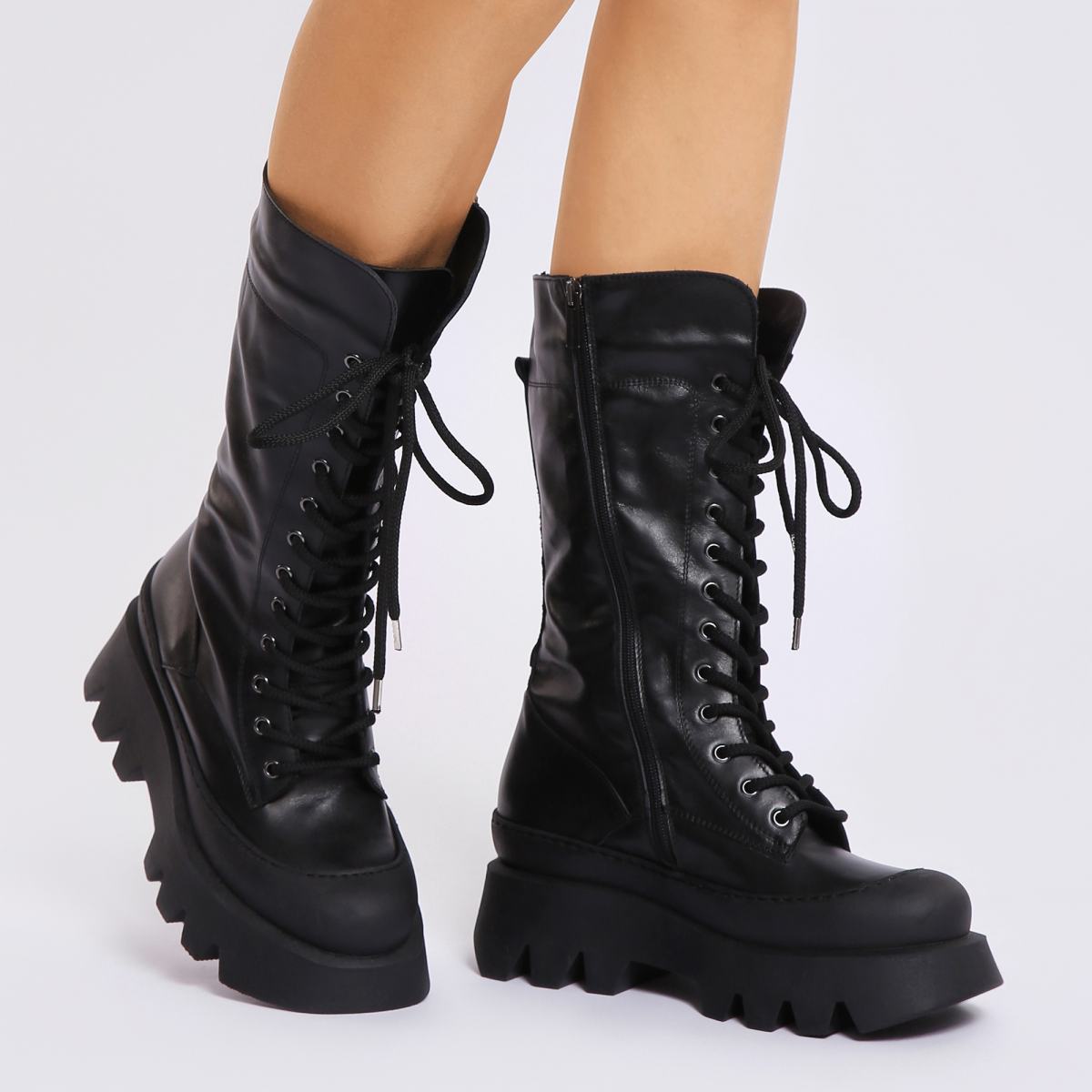 Чёрные сапоги на шнуровке — отличный вариант на зиму, особенно для тех, кто любит носить юбки и платья. Материал верха — натуральная кожа, внутри шерстяной подклад и стелька из натурального меха. Тракторная подошва выполнена из резины, и за счёт крупного протектора, можно не бояться скользких улиц. Сбоку расположена застёжка-молния, чтобы обувать и снимать пару было удобно.
