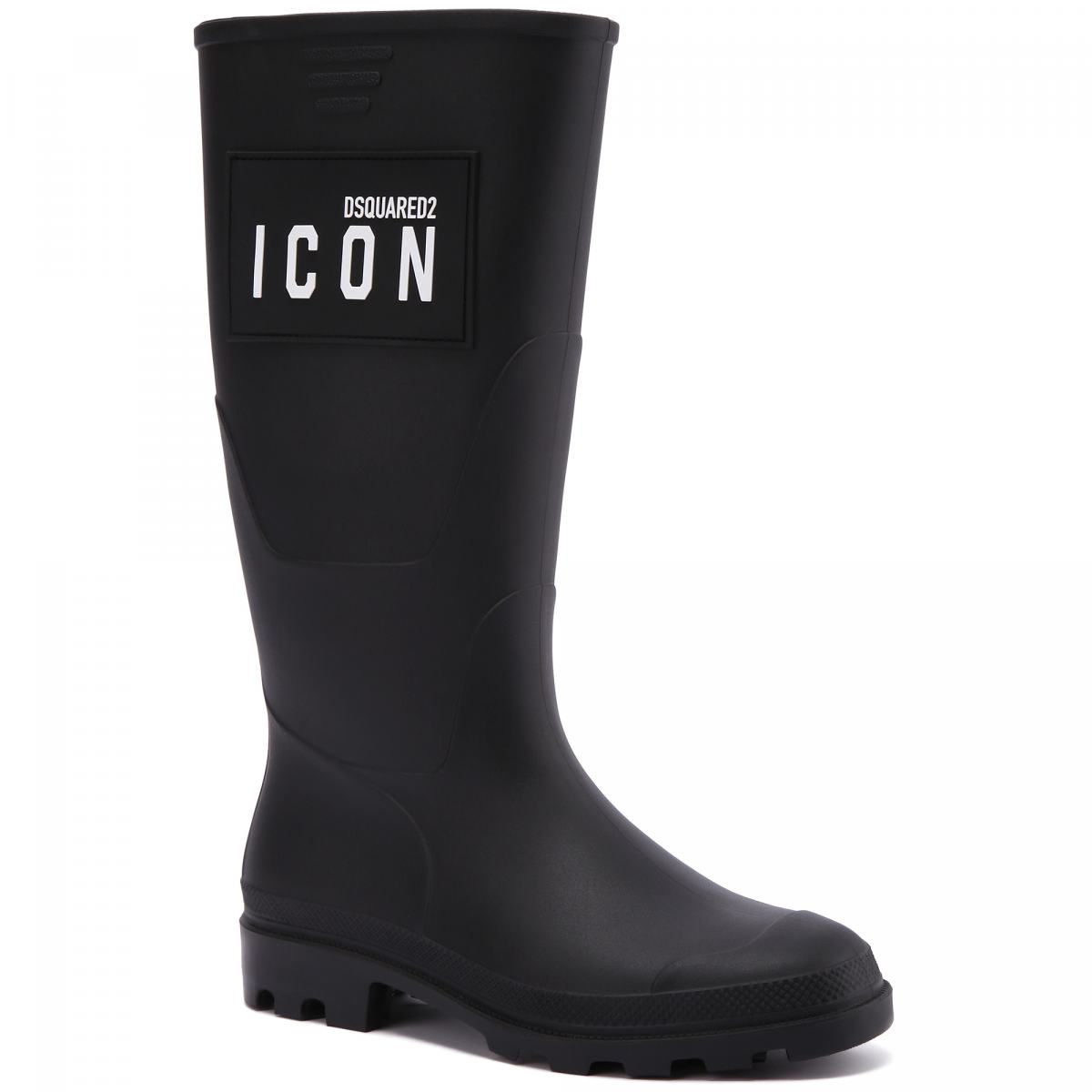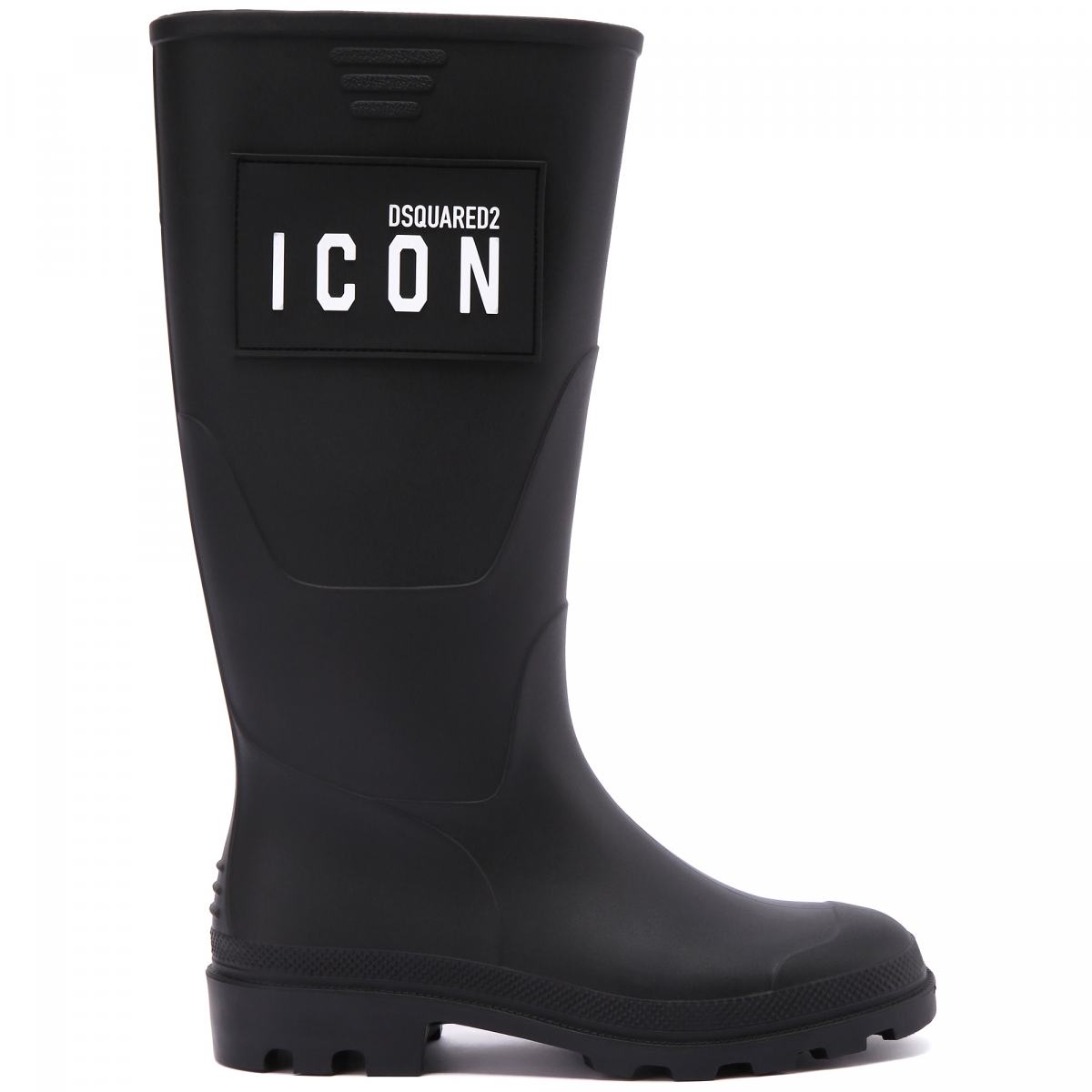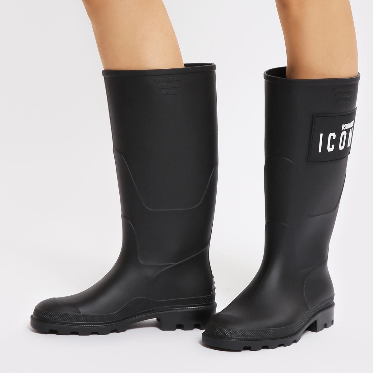 Резиновые сапоги от DSQUARED2. Стильные и удобные резиновые сапоги - просто необходимый элемент осеннего образа для холодной и мокрой погоды. Верх пары выполнен из качественной резины и украшен фирменным логотипом бренда DSQUARED2. У сапог устойчивый каблук квадратной формы и объёмный протектор на подошве. Пара без подкладки, стелька выполнена из натуральной шерсти.