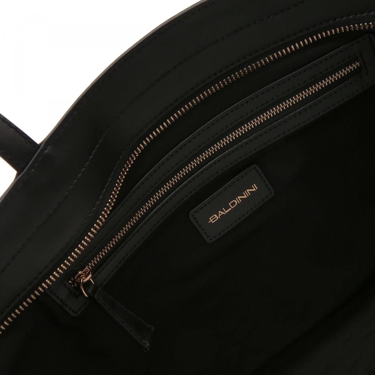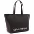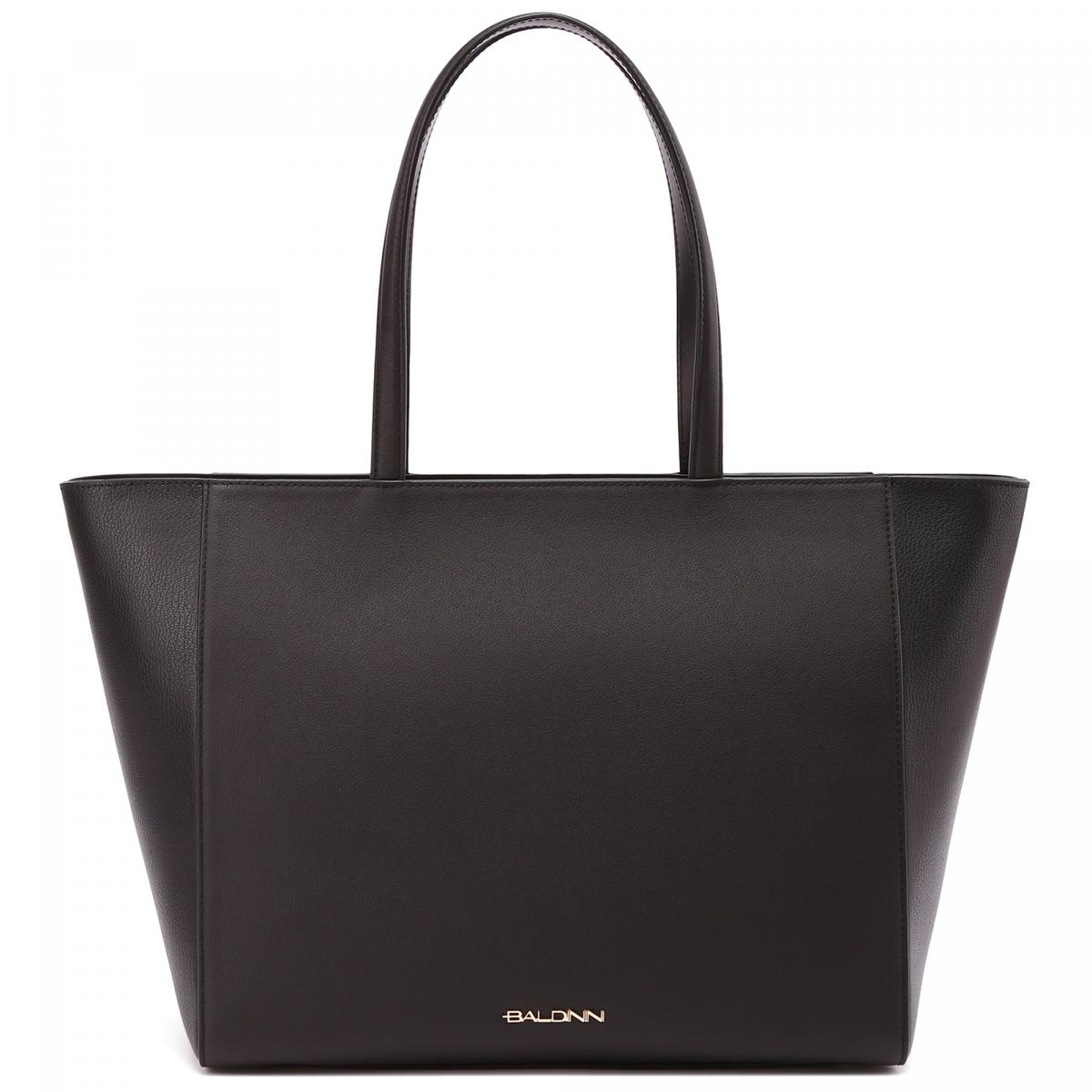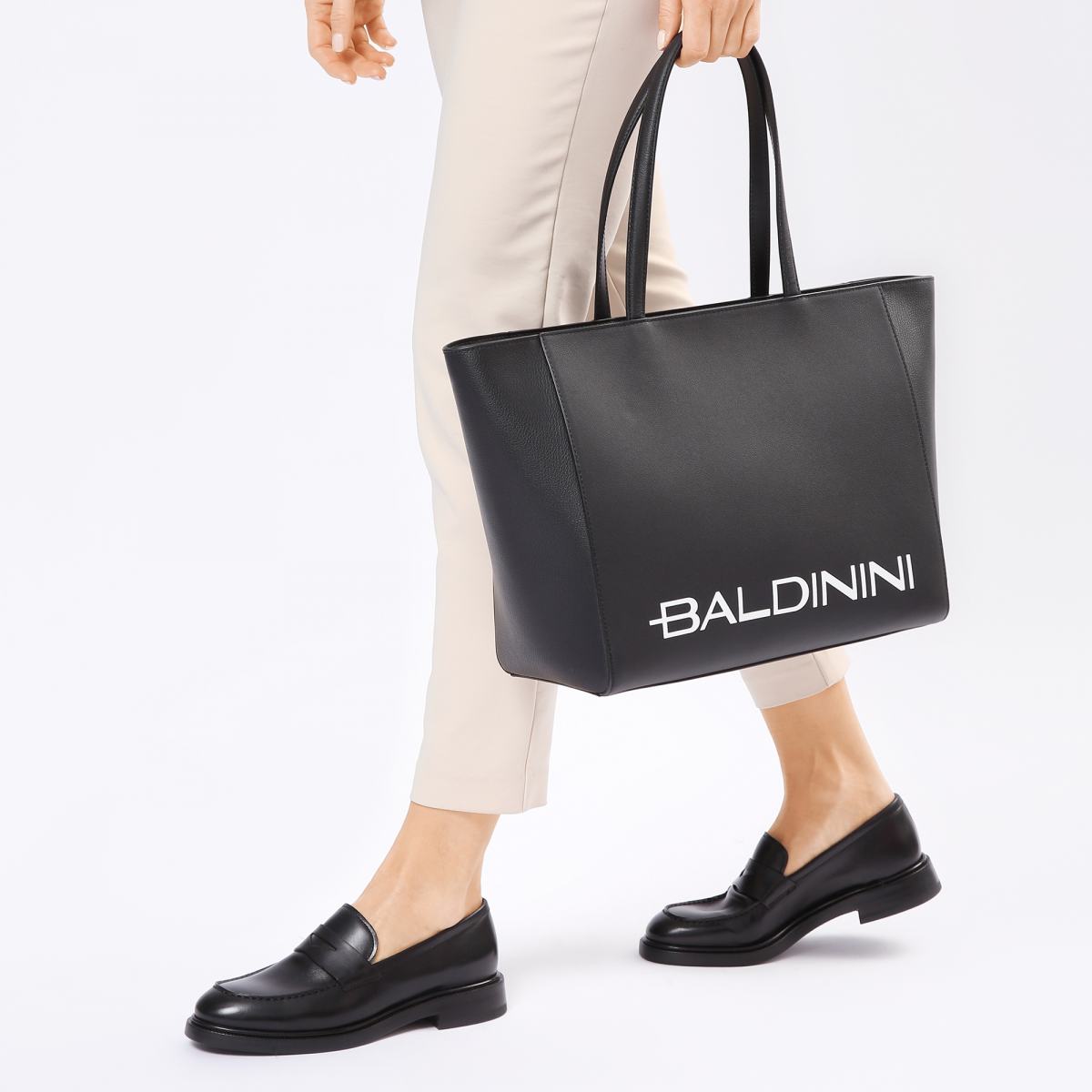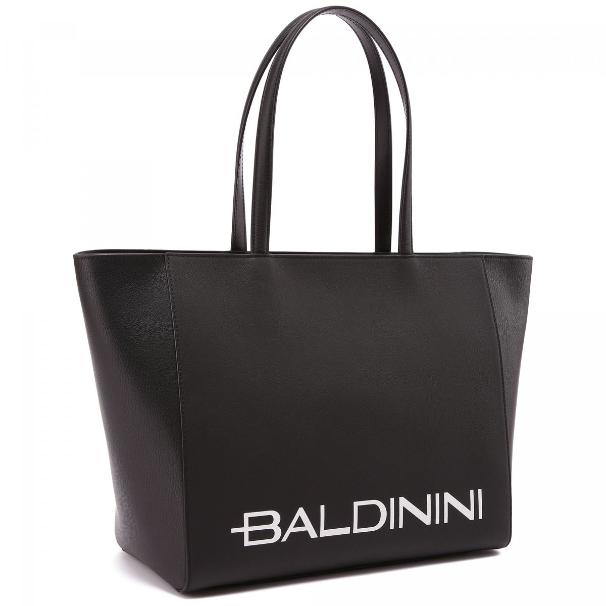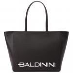 Вместительная сумка в форме трапеции от Baldinini. Сумка из новой осенней коллекции бренда выполнена из гладкой чёрной кожи. Сумку удобно носить на плече благодаря длинным кожаным ручкам. Сумка закрывается на молнию, внутри одно вместительное отделение с фирменной текстильной подкладкой, и небольшой карман на молнии, с кожаной отделкой и фирменным лейблом. Символом бренда служит крупный белый логотип Baldinini, размещённый на передней стороне сумки.