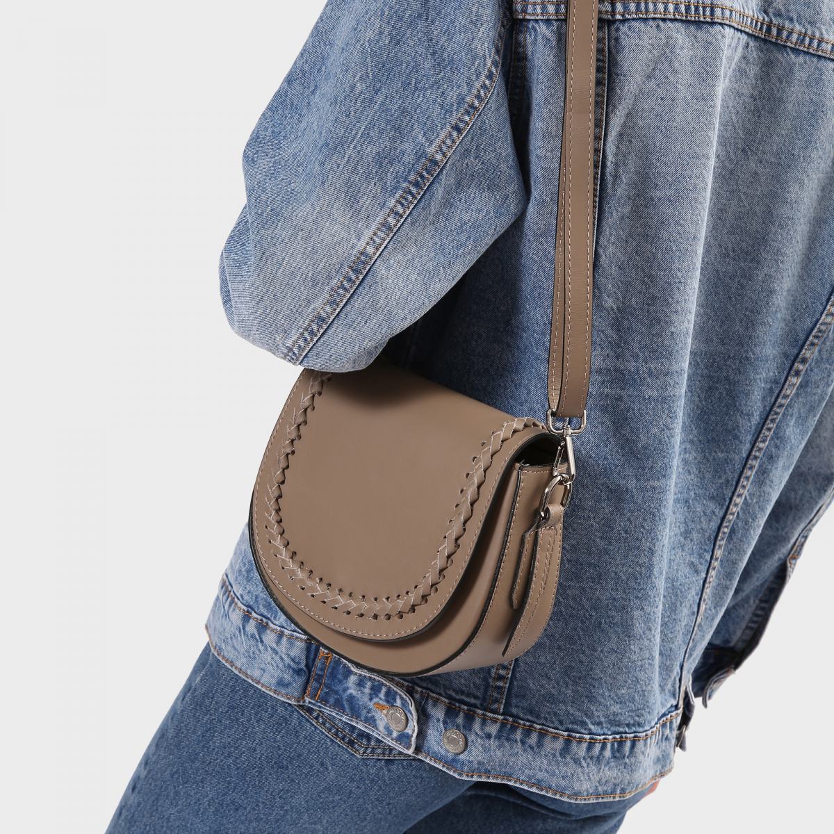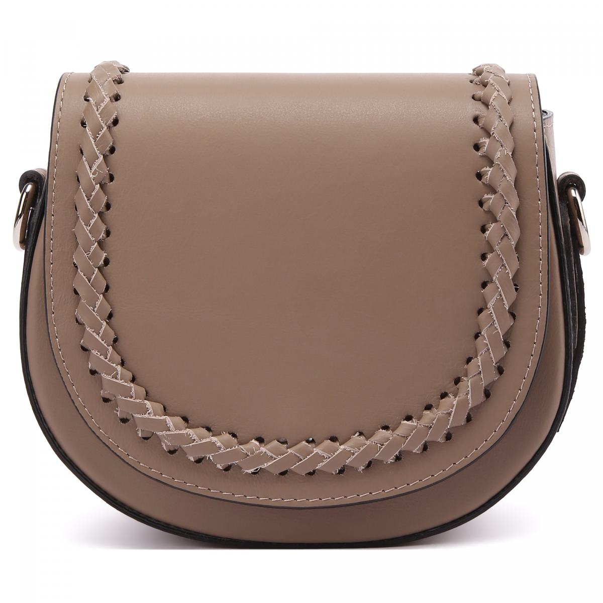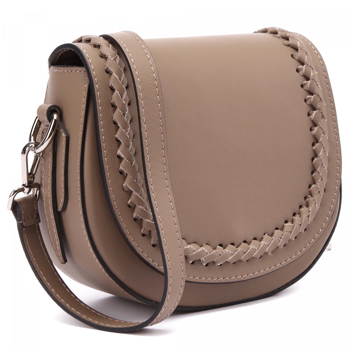 Сумка-седло из коричневой кожи от Fabi. Сумка выполнена из гладкой натуральной кожи с декором в виде плетения сверху. Ремень на плечо выполнен из кожи в тон и крепится к сумке на карабинах. Сумка закрывается на магнитный замок и молнию, внутри подкладка из текстильной ткани с кожаным логотипом бренда.
