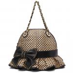 Сумка в виде шляпки от Braccialini. Сумка из эксклюзивной коллекции бренда выполнена украшена кожаным бантом и стразами. У сумки ручки-цепочки, кожаный ремень на карабинах и застёжка на молнию. Внутри текстильная подкладка, а на дне сумки расположены металлические ножки.