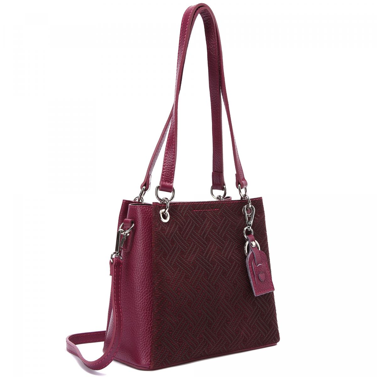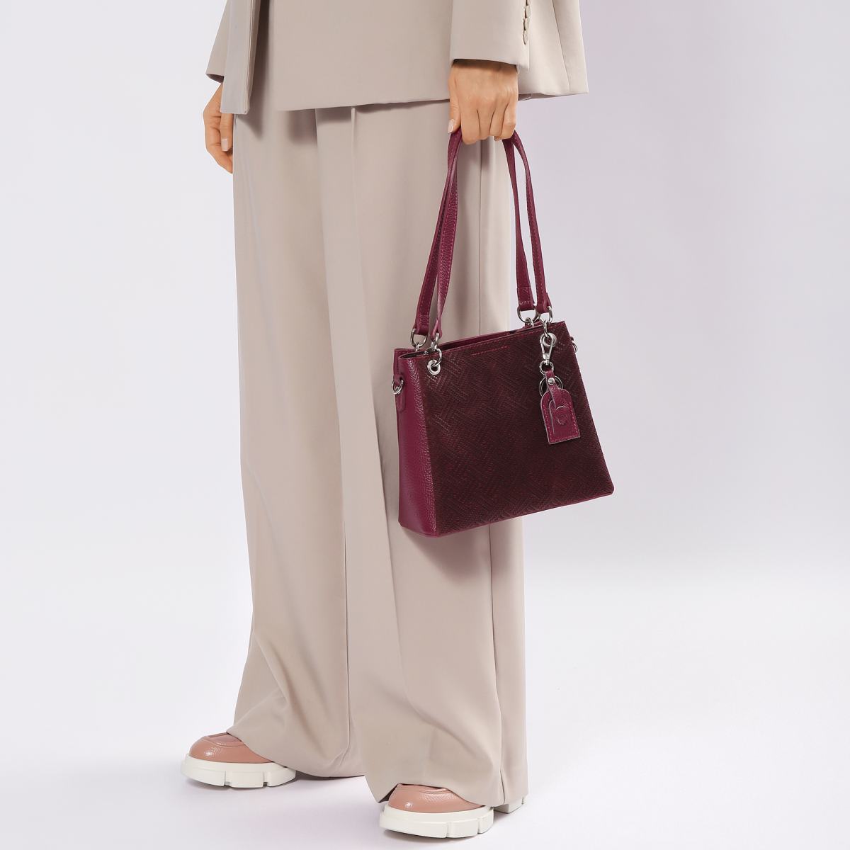 Бордовая сумка с кожаными ручками идеально подойдёт на каждый день. Модель выполнена из натуральной кожи с текстильной отделкой, внутри текстильный подклад, центральное отделение на молнии и боковые отделения. Благодаря длинным ручкам, сумку можно носить и в руках и на плече, в комплекте также есть длинный ремень на карабинах. Размер сумки позволяет вместить в неё всё самое необходимое, при чем неважно, выберете ли вы этот аксессуар для офиса или для обычных будней. Стильное дополнение - небольшой кожаный брелок.
