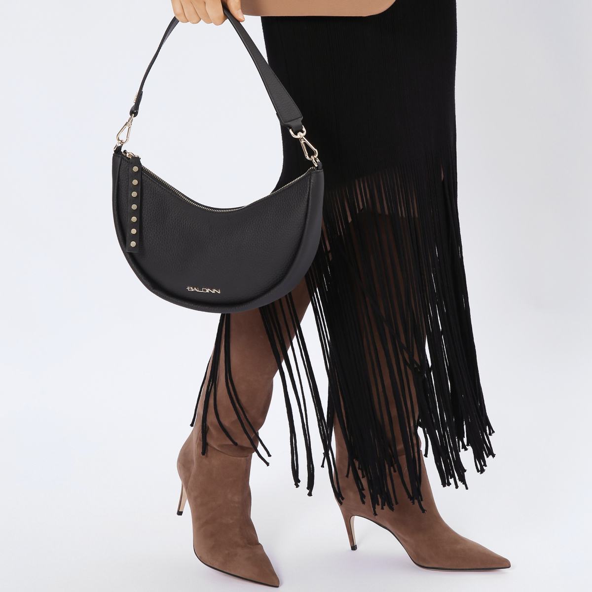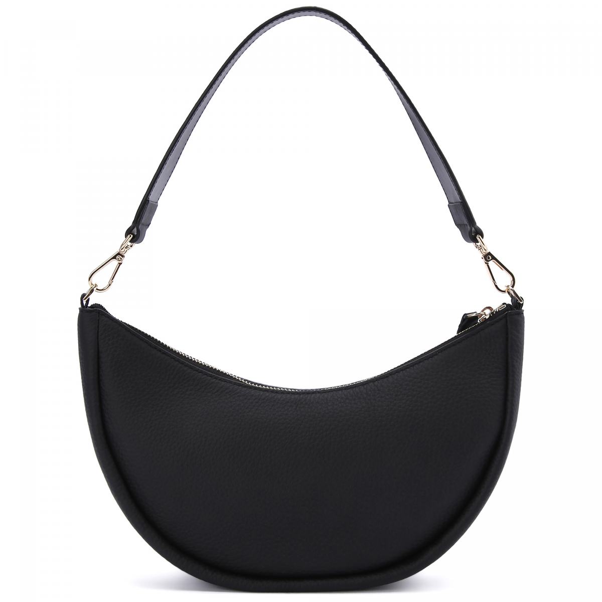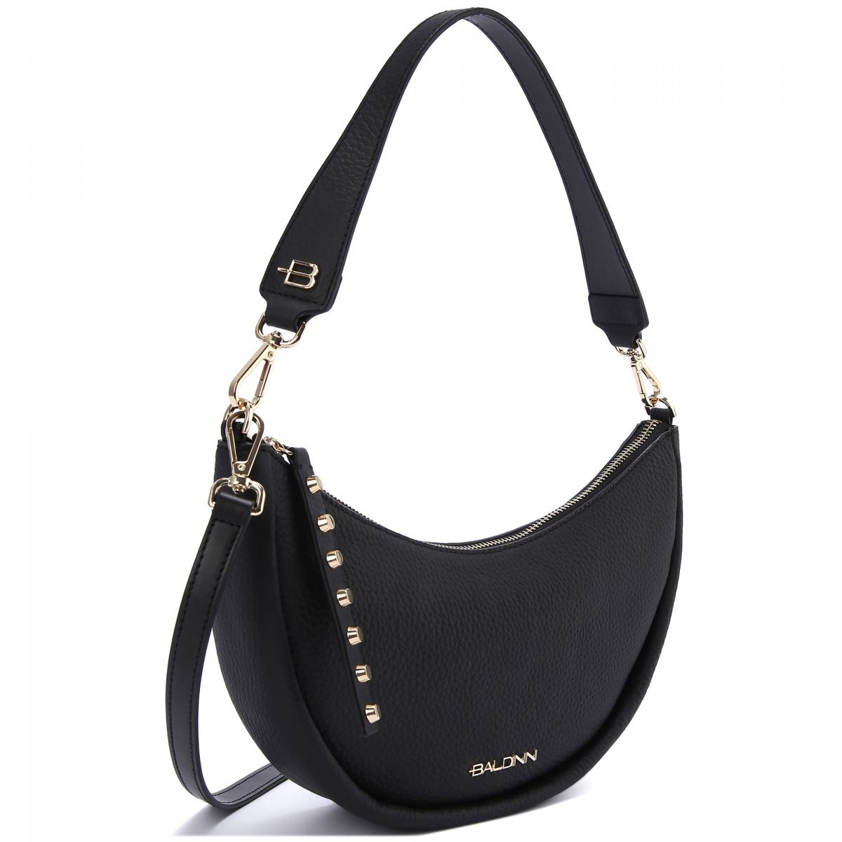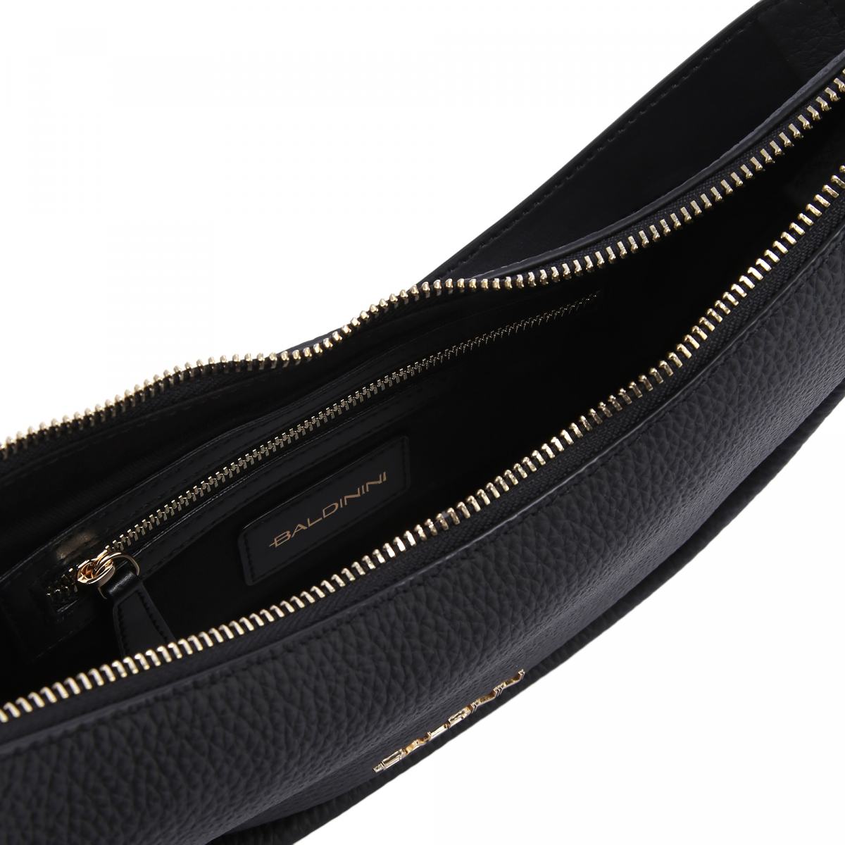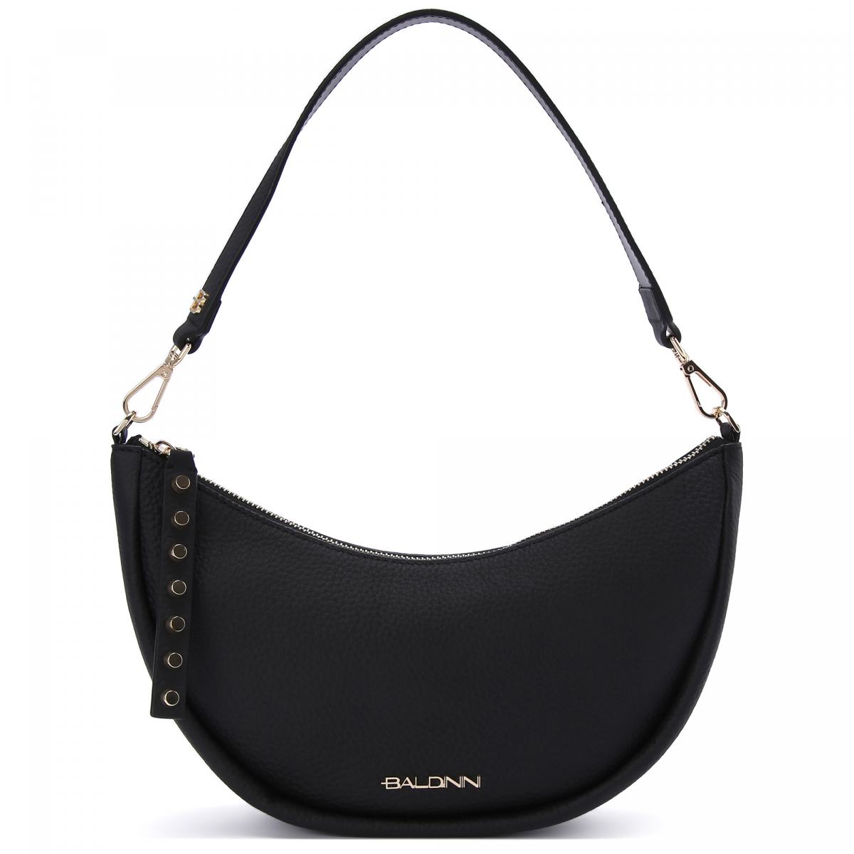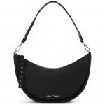 Небольшая сумка полукруглой формы от Baldinini. Сумка выполнена из натуральной кожи в классическом чёрном цвете. Ручка и плечевой ремень из кожи в цвет крепятся к сумке на карабинах. Сумка закрывается на молнию, внутри фирменная подкладка и небольшой карман на молнии с кожаной отделкой и логотипом бренда. Модель украшена фирменным логотипом золотистого цвета.
