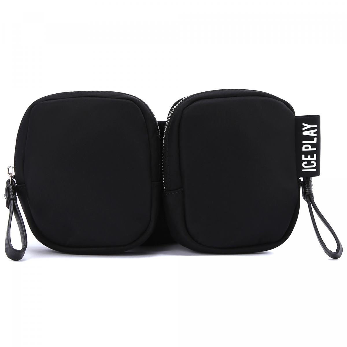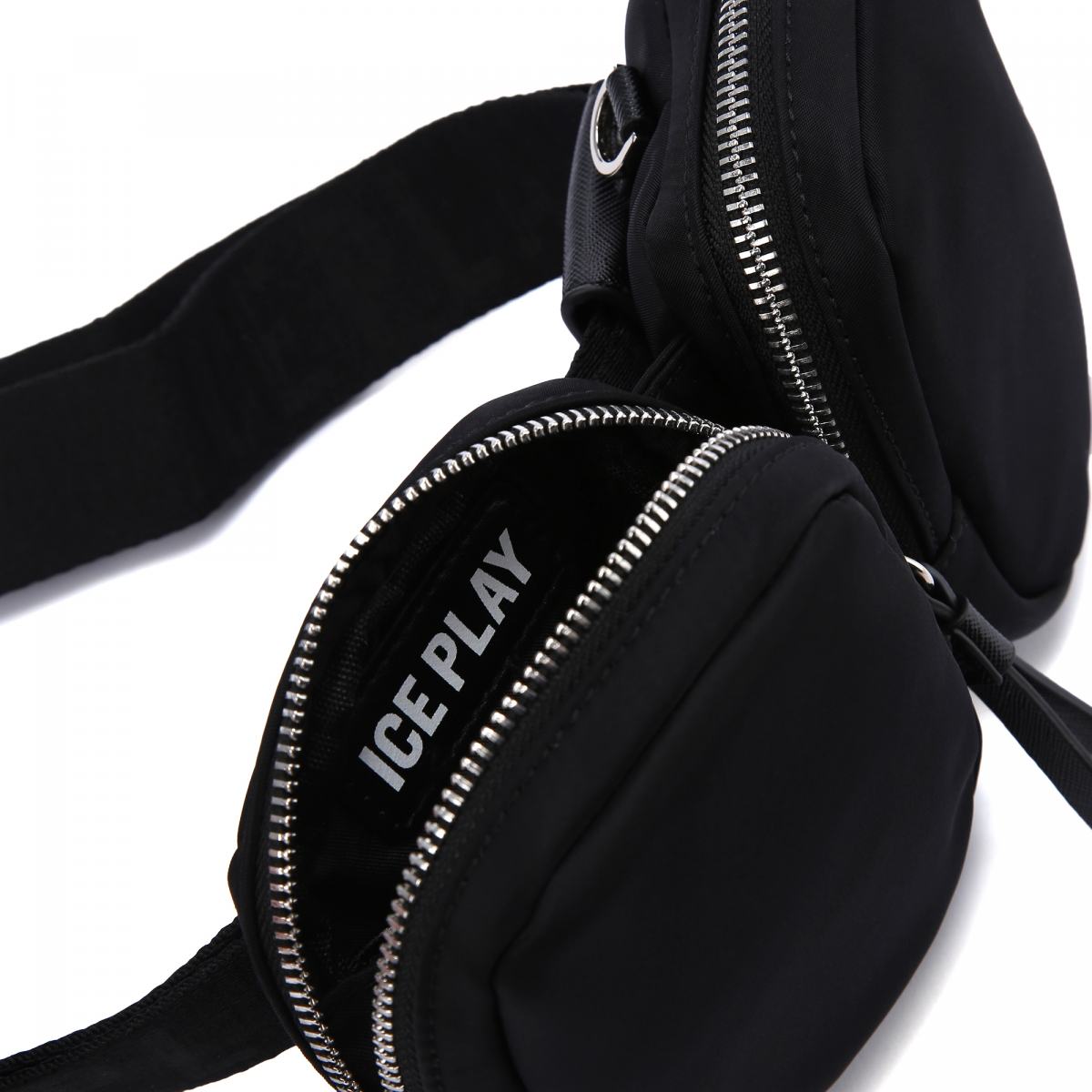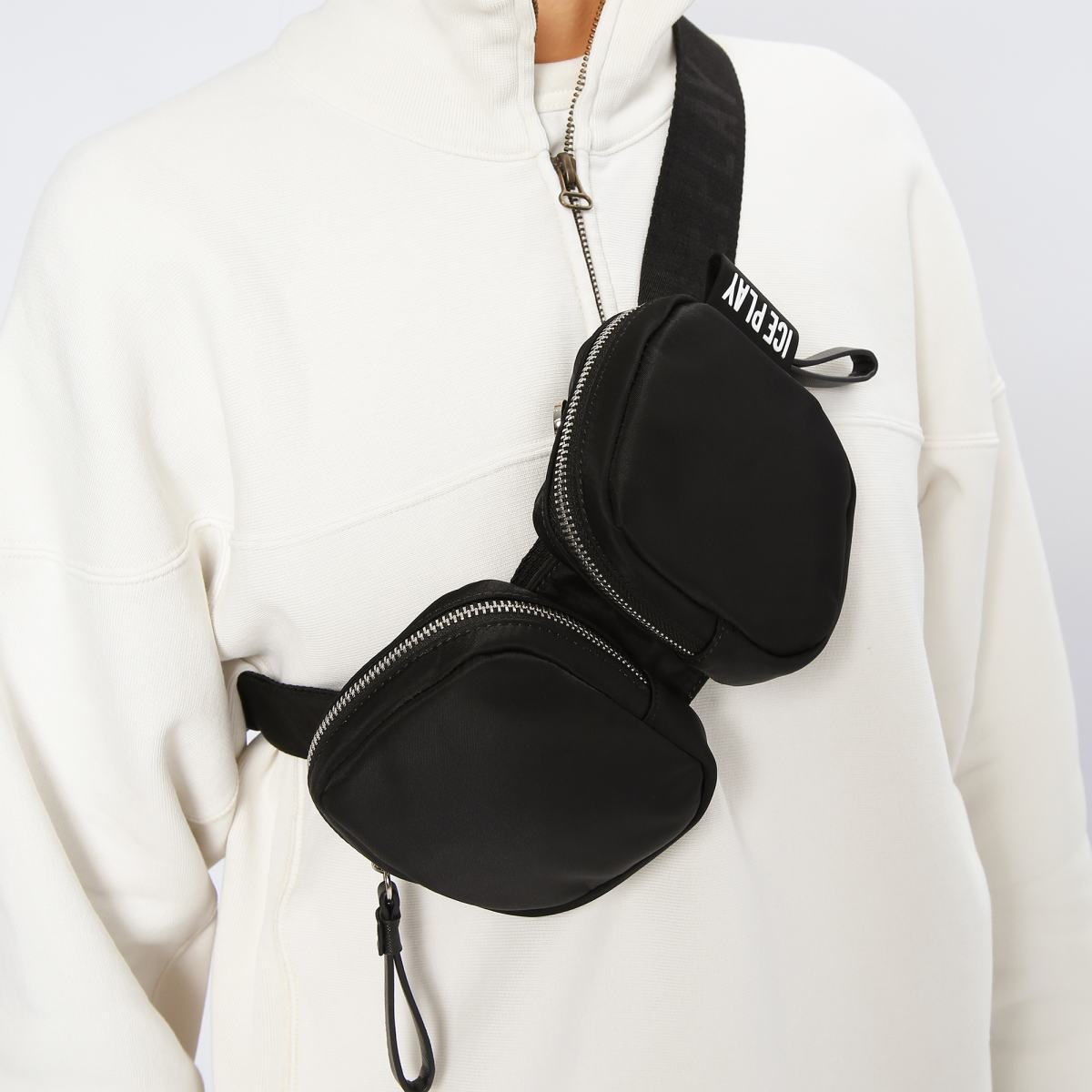 Сумка из чёрной текстильной ткани от Ice Play. Компактная и удобная сумка, в которой можно носить все самые необходимые вещи: смартфон, кошелёк и документы. В комплекте ремень с фирменным логотипом бренда с застёжкой на автоматический замок. Сумка состоит из двух отделений-карманов, каждое из которых застёгивается на молнию.