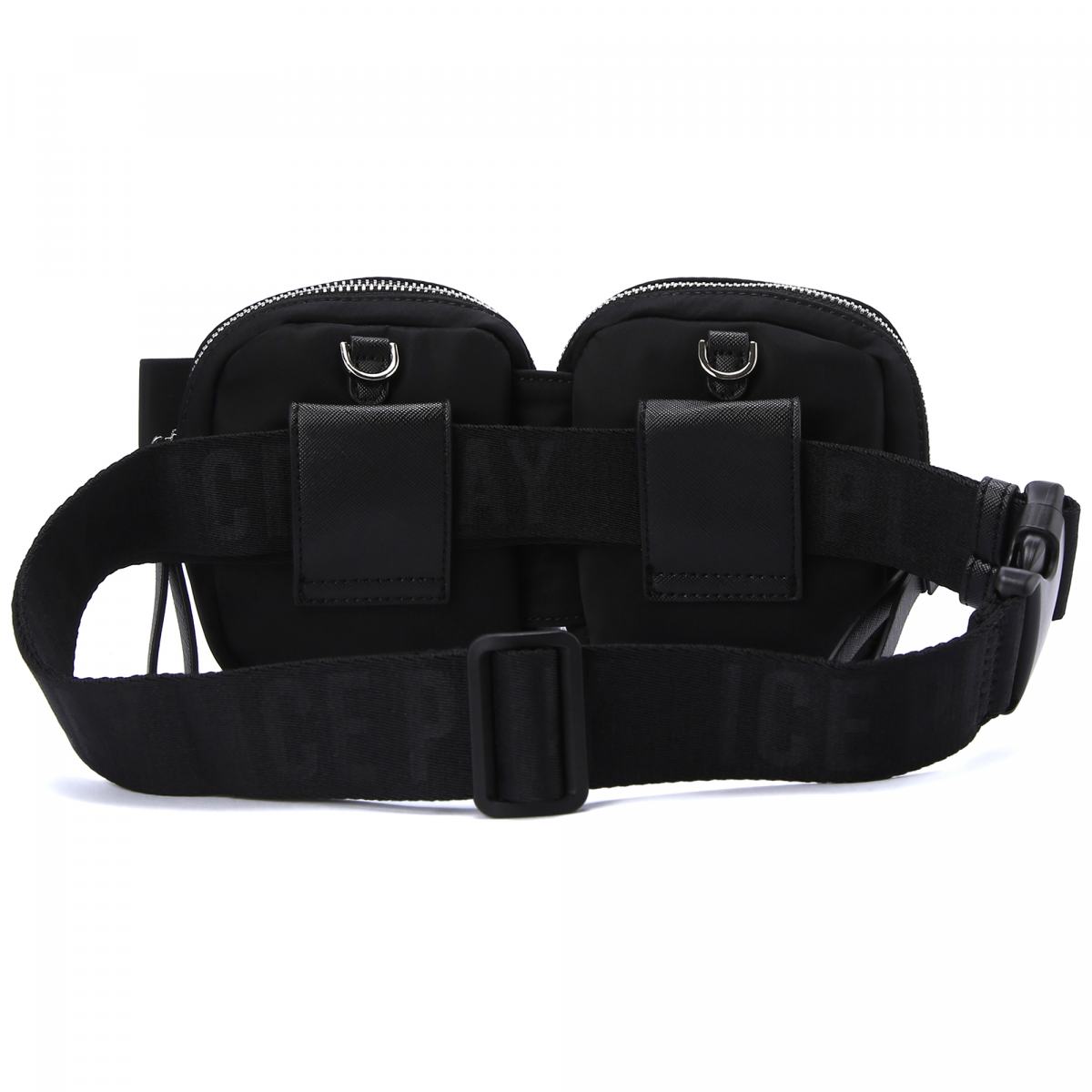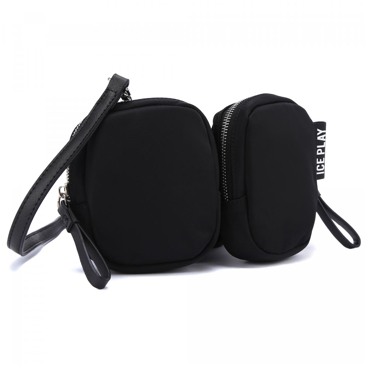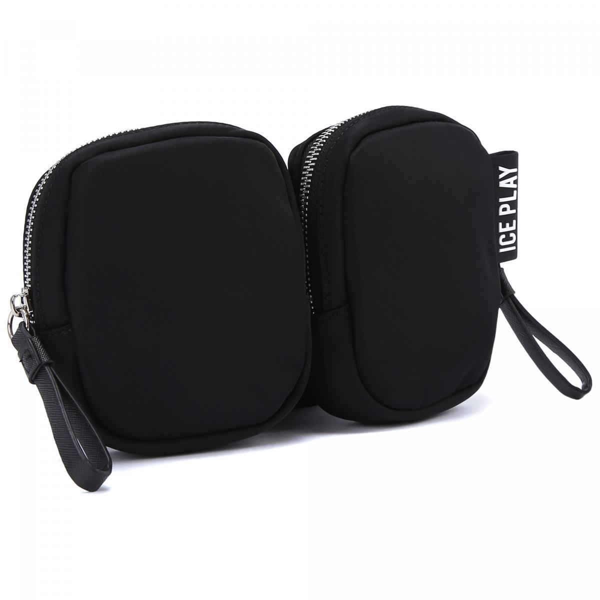 Сумка из чёрной текстильной ткани от Ice Play. Компактная и удобная сумка, в которой можно носить все самые необходимые вещи: смартфон, кошелёк и документы. В комплекте ремень с фирменным логотипом бренда с застёжкой на автоматический замок. Сумка состоит из двух отделений-карманов, каждое из которых застёгивается на молнию.