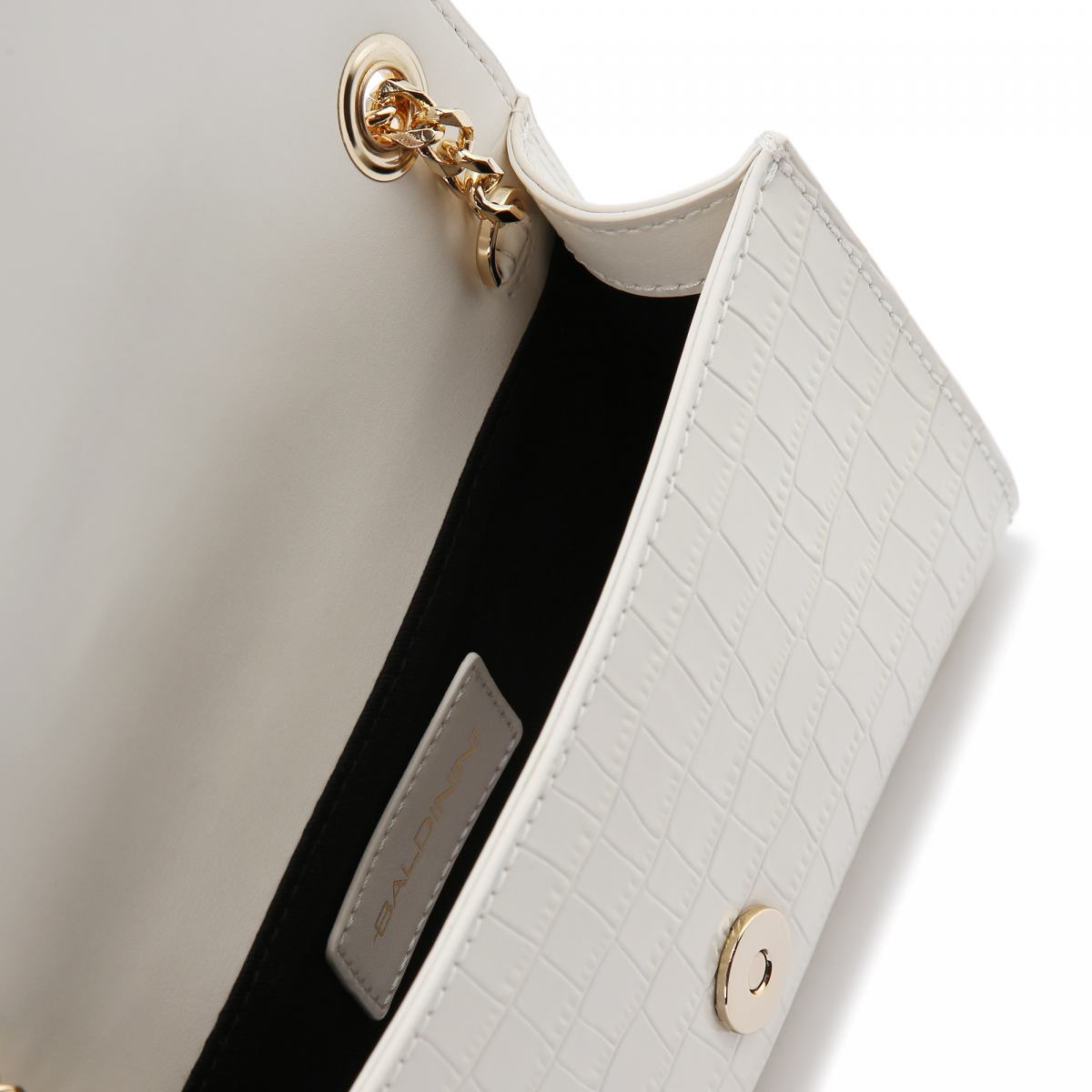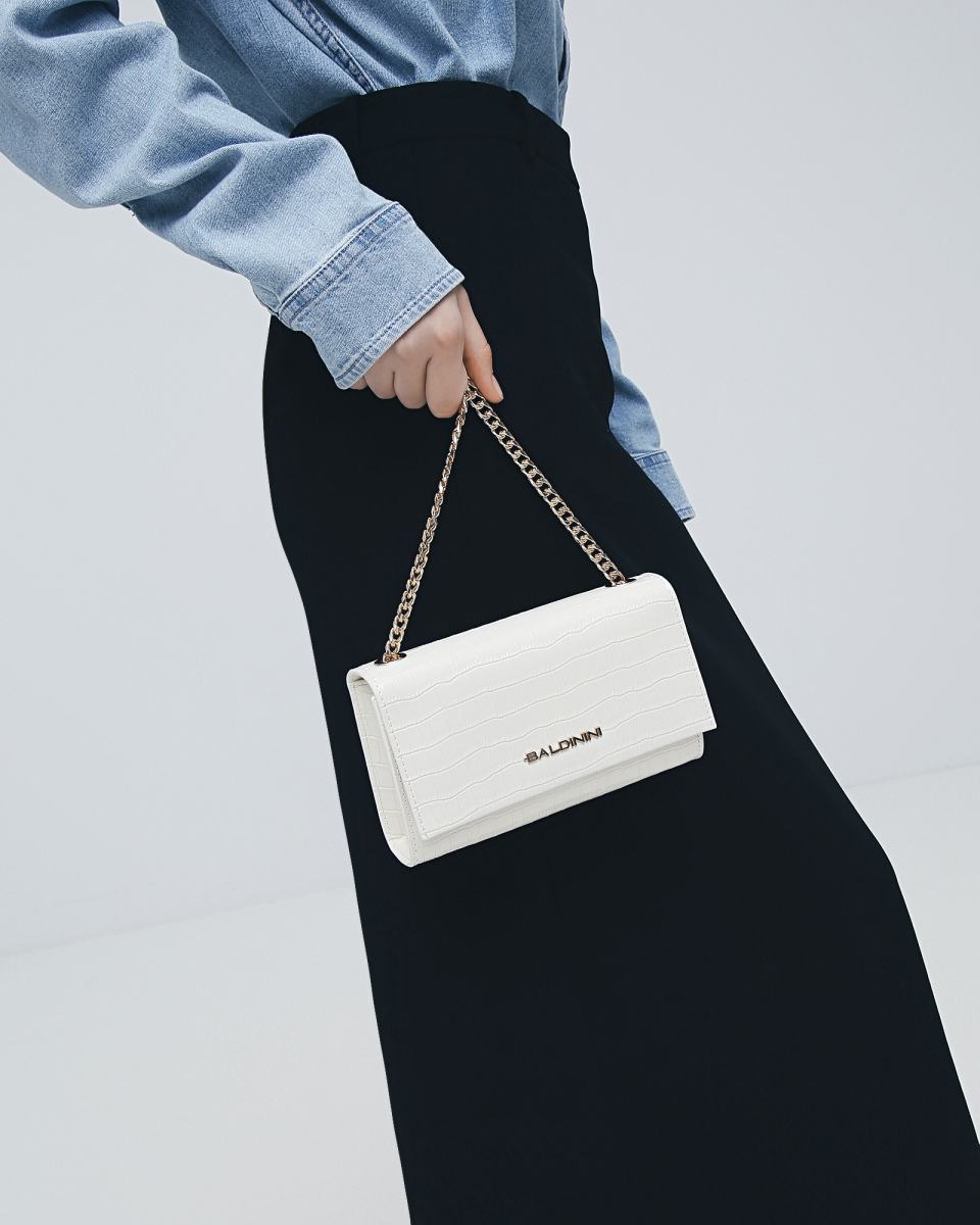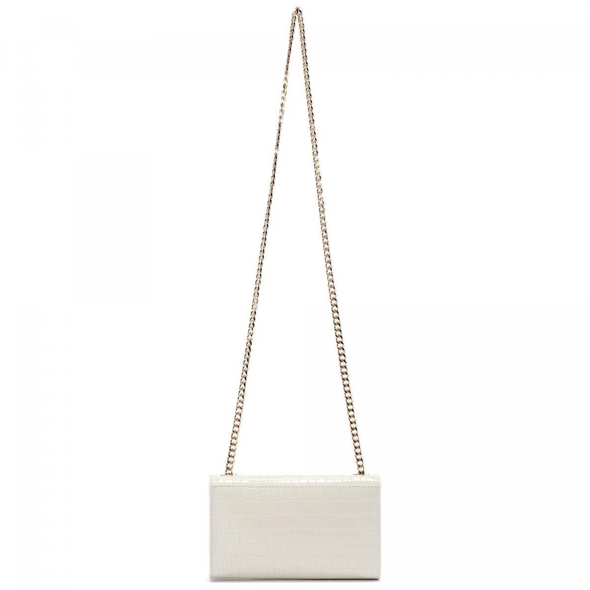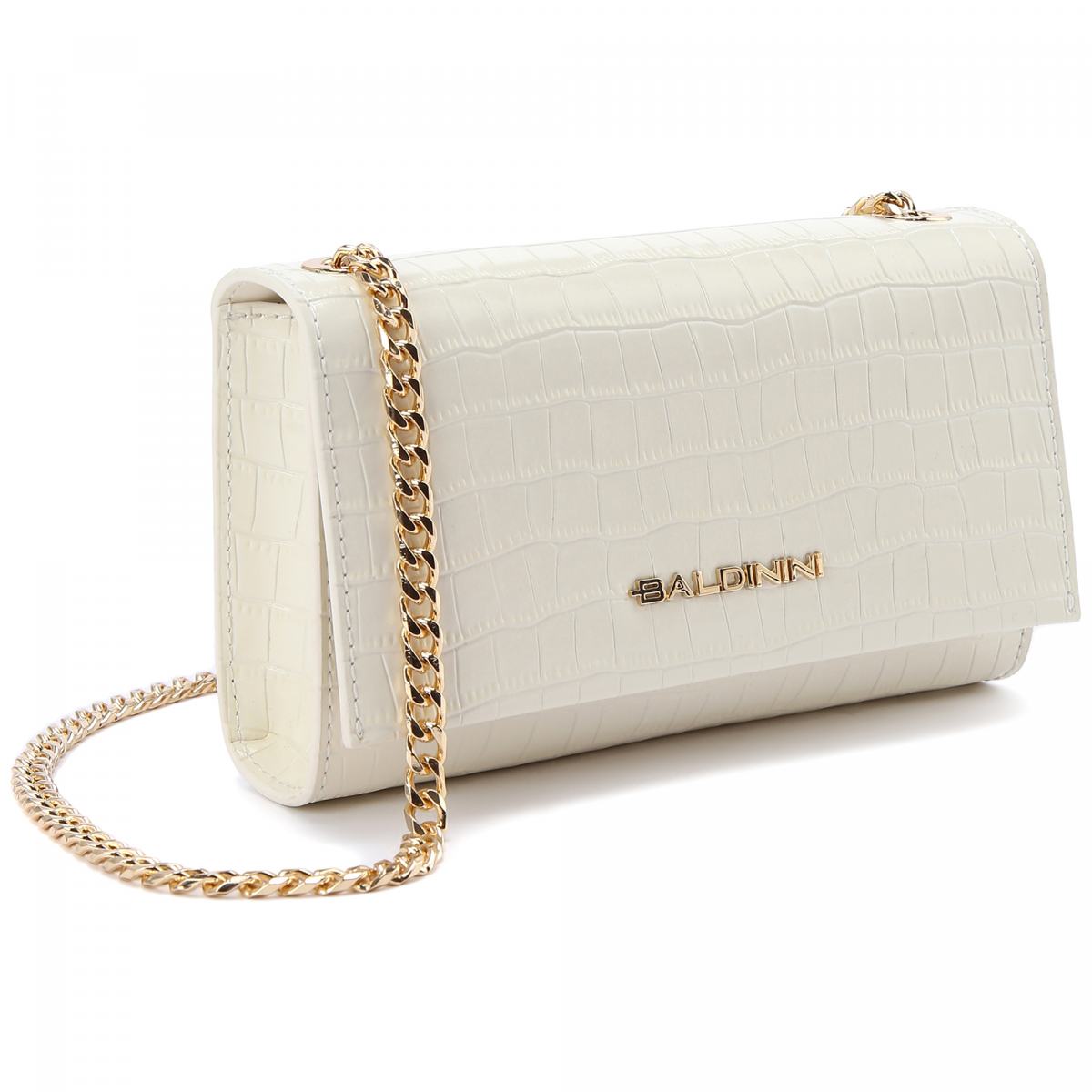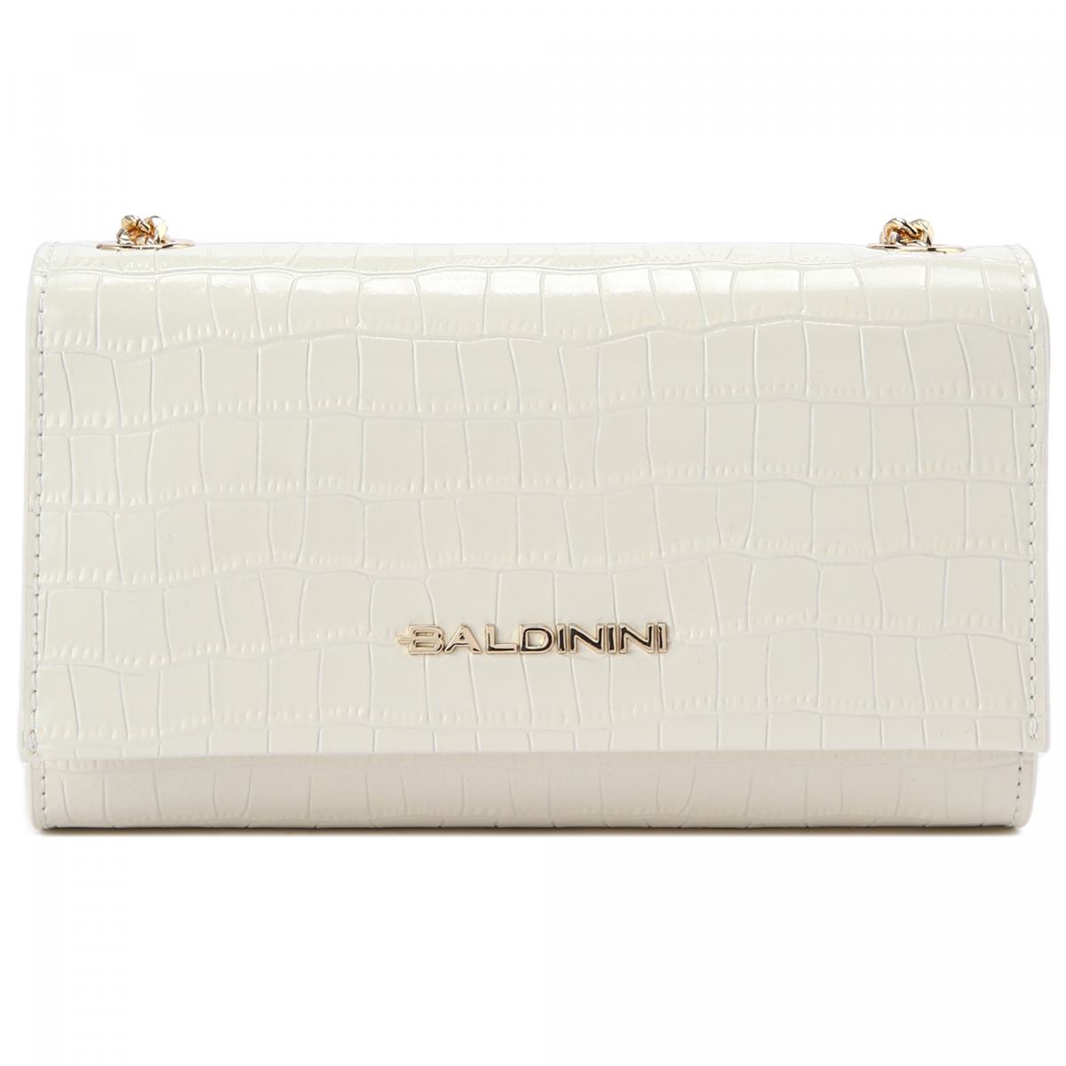 Сумка-клатч из белой лакированной кожи от Baldinini. Изящная сумочка-клатч дополнит повседневные и вечерние образы. Модель выполнена из лакированной кожи с эффектом чешуи рептилии, с логотипом Baldinini в центре. В качестве ремня на плечо выступает тонкая золотистая цепочка. Сумка закрывается на магнитный замок, внутри текстильная подкладка и небольшой карман.