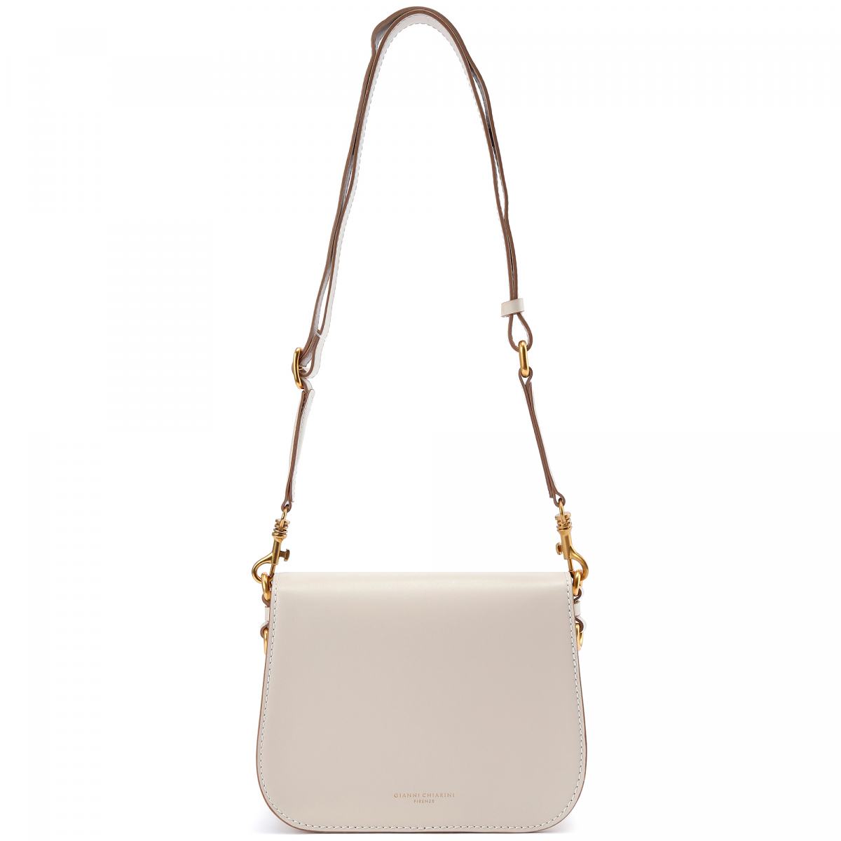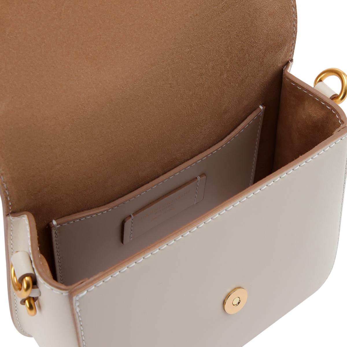 Сумка из натуральной кожи в кремовом цвете от Gianni Chiarini. Сумка через плечо Meg выполнена из матовой кожи с магнитной застежкой с металлической подвеской. Замшевая подкладка дополнена плоским универсальным карманом. Кожаный ремень через плечо в комплекте.
