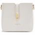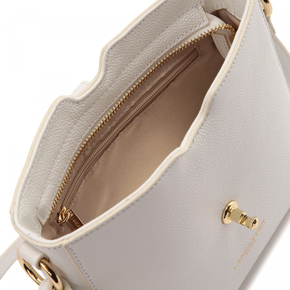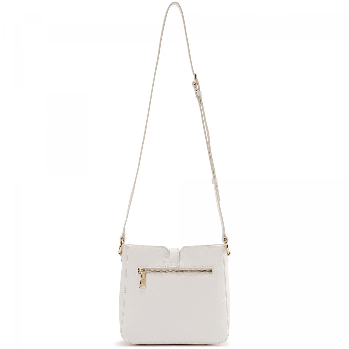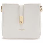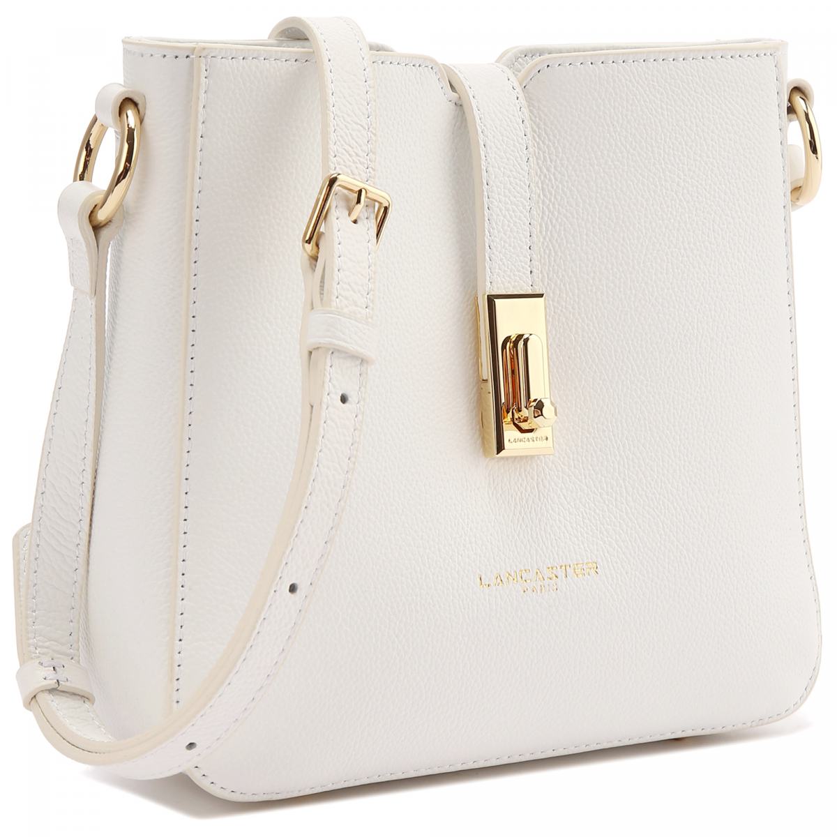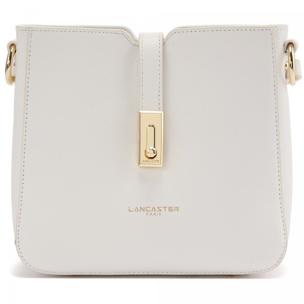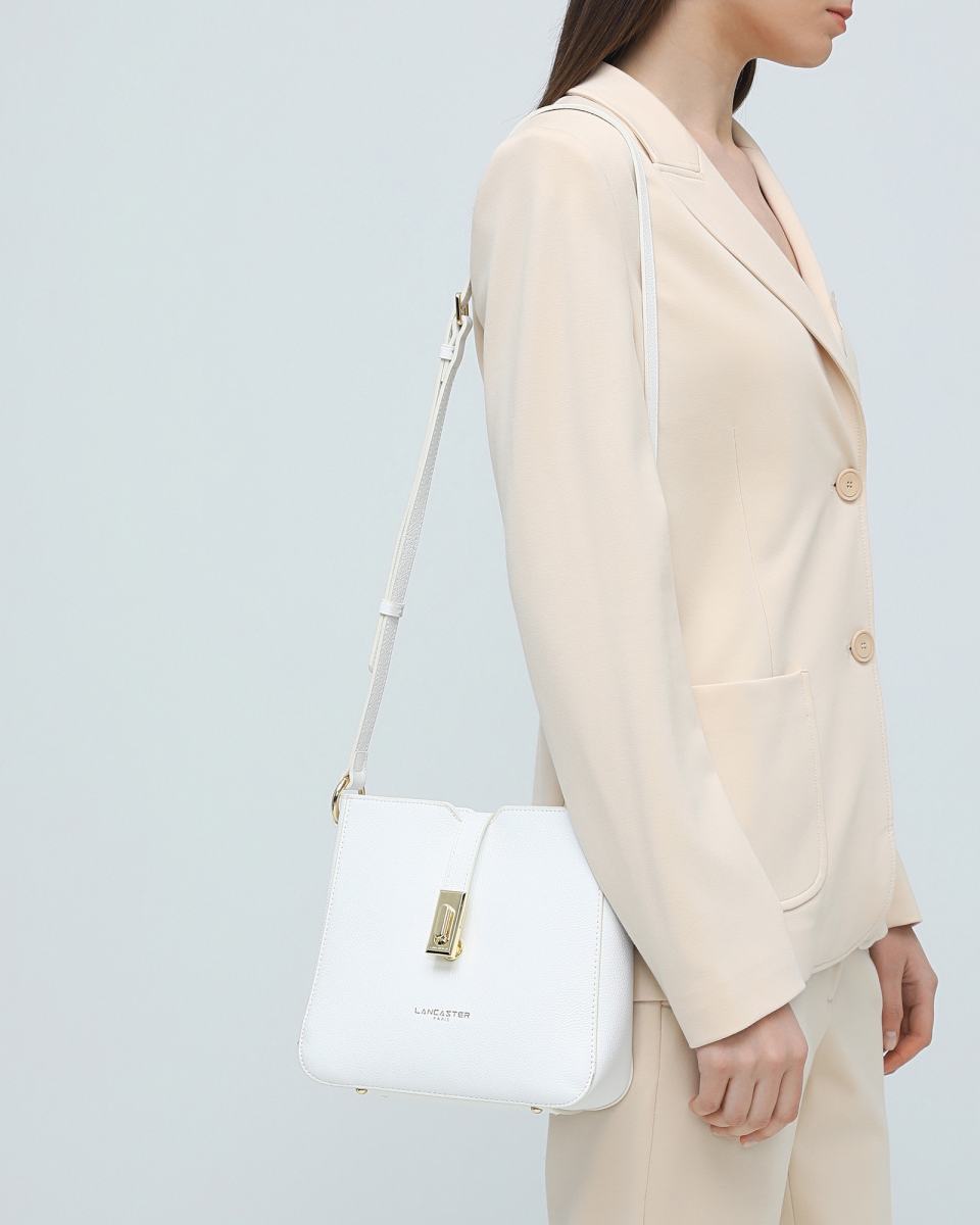 Квадратная сумка из белой зернистой кожи от французского бренда Lancaster. Единственный ремень выполнен из кожи, длину его можно отрегулировать благодаря застёжке-пряжке. На задней стороне сумки дизайнеры расположили дополнительный карман на молнии. Основное отделение закрывается на молнию, внутри текстильная подкладка и небольшой карман на молнии.