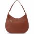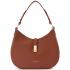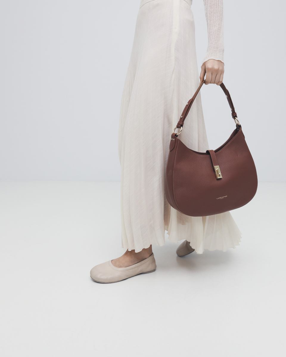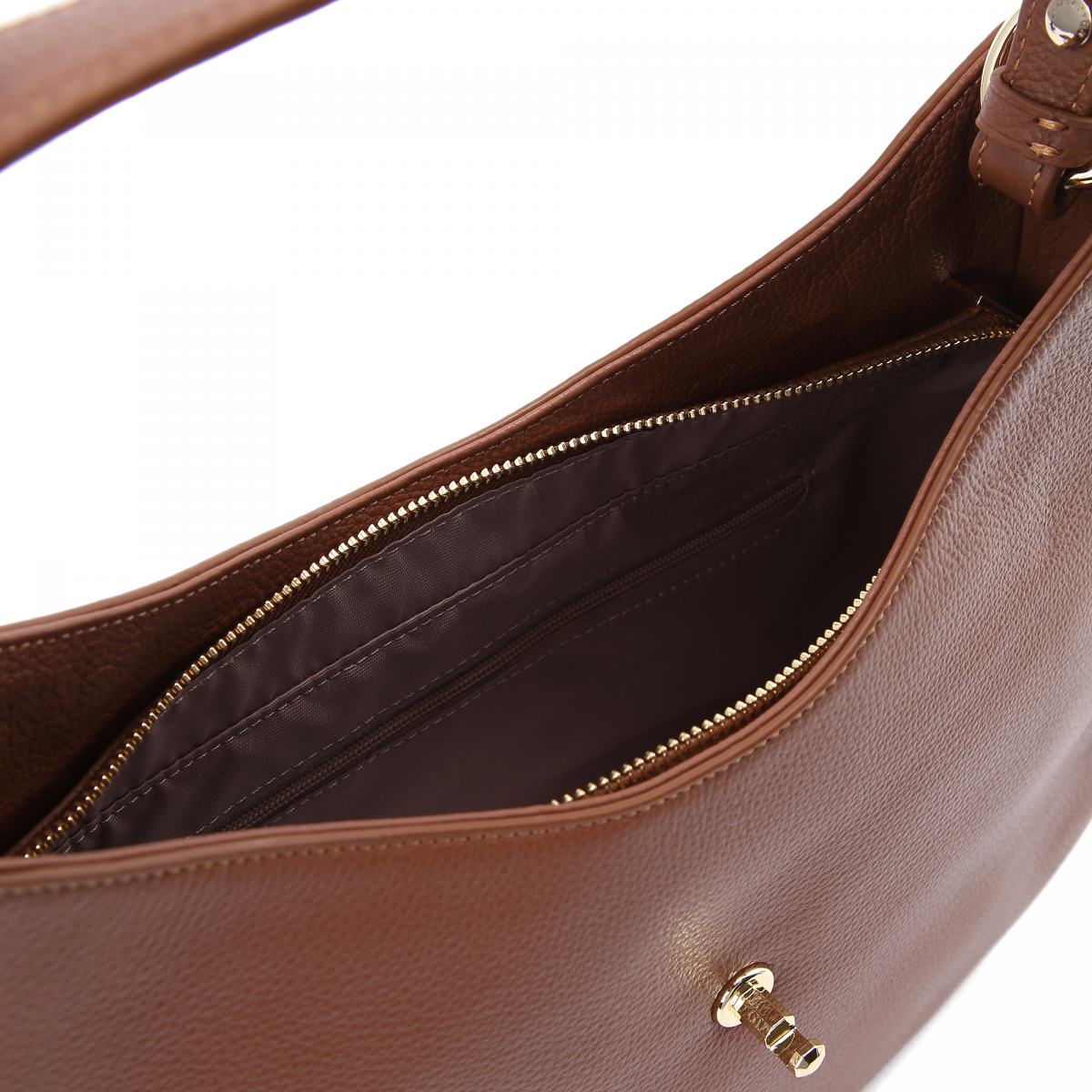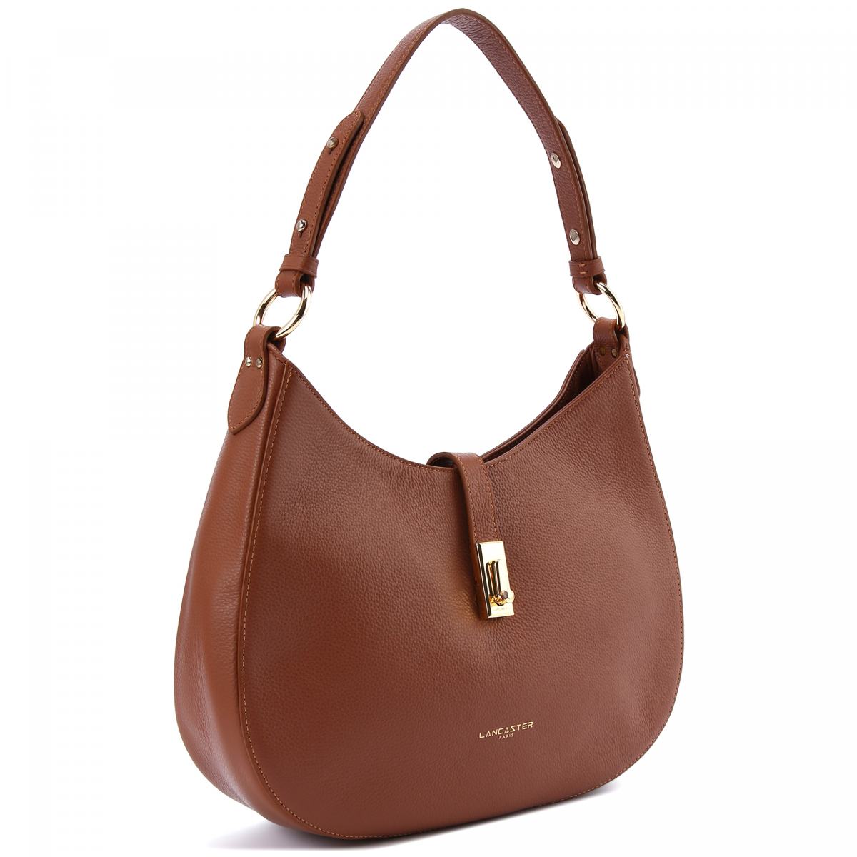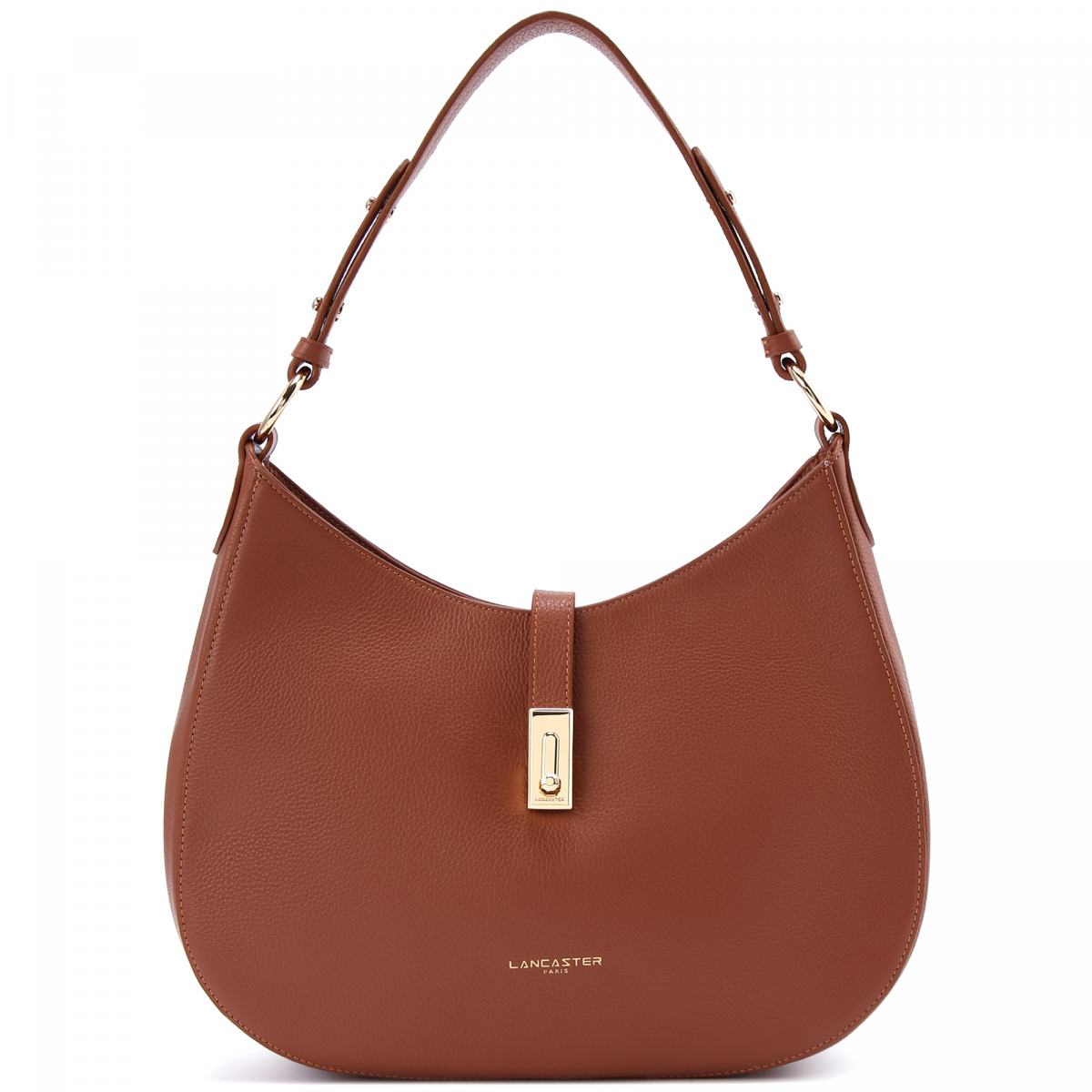 Сумка из коричневой зернистой кожи от французского бренда Lancaster. Единственный ремень выполнен из кожи, длину его можно отрегулировать благодаря кнопкам по бокам. На задней стороне сумки дизайнеры расположили дополнительный карман на молнии. Основное отделение закрывается на молнию, внутри текстильная подкладка и небольшой карман на молнии.