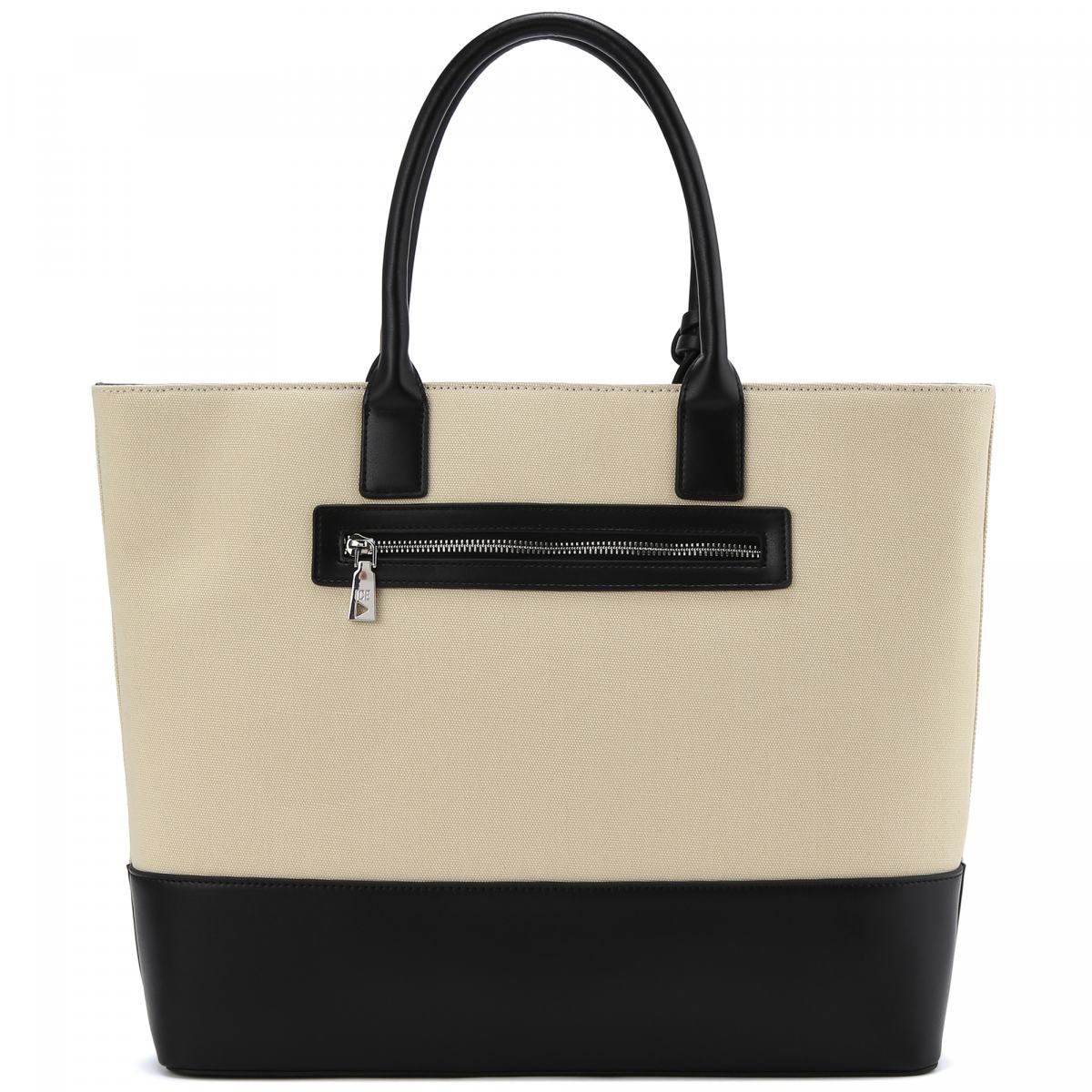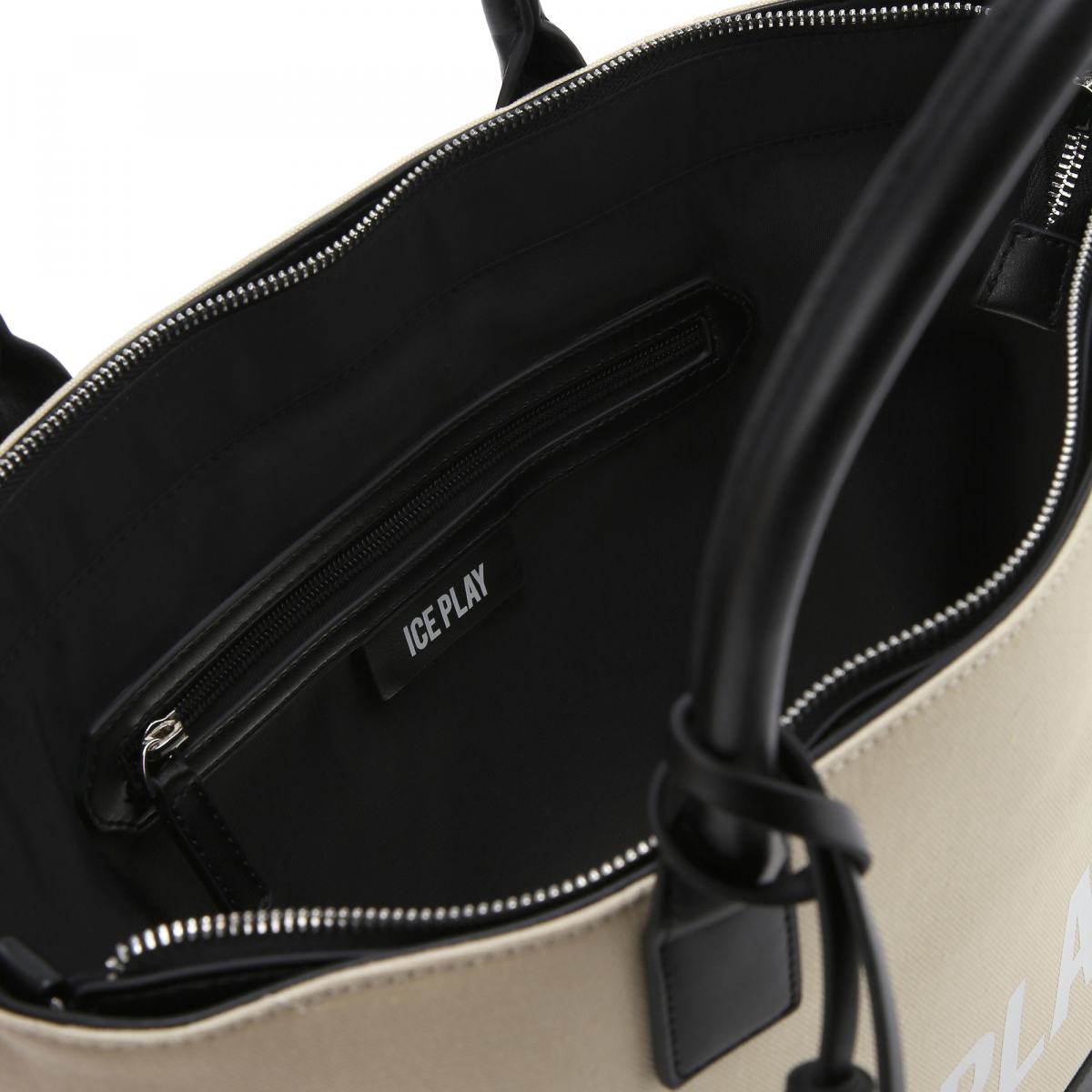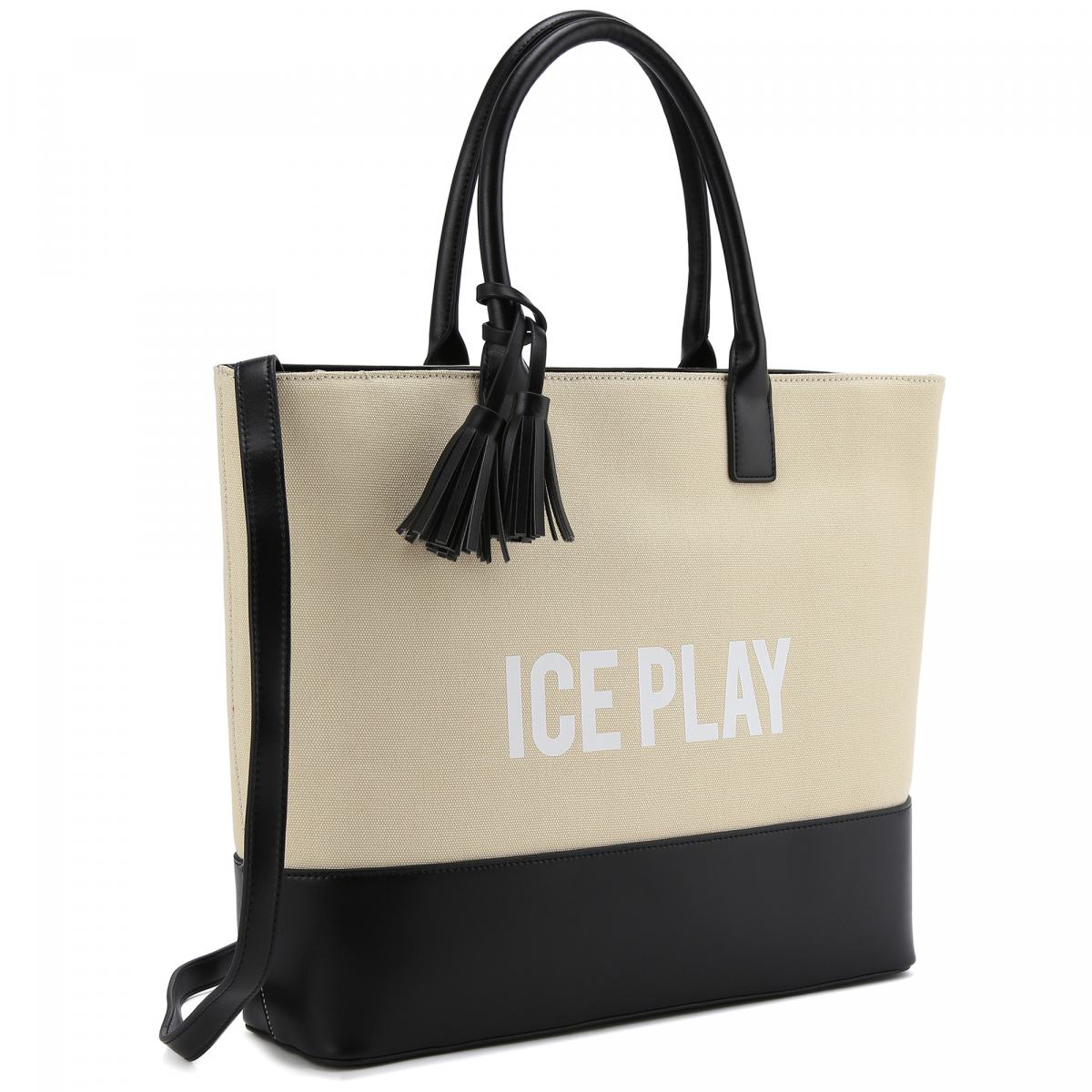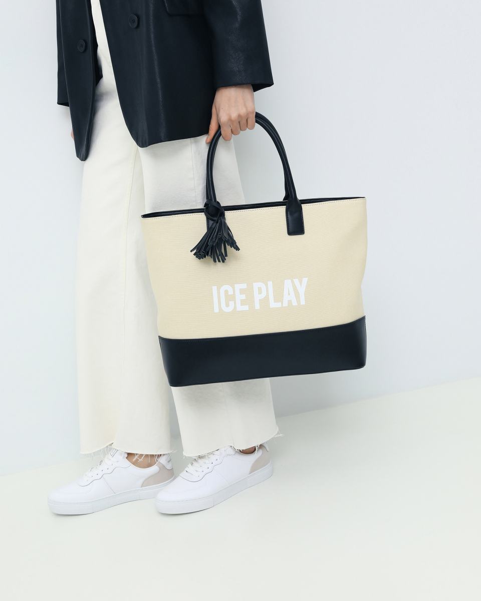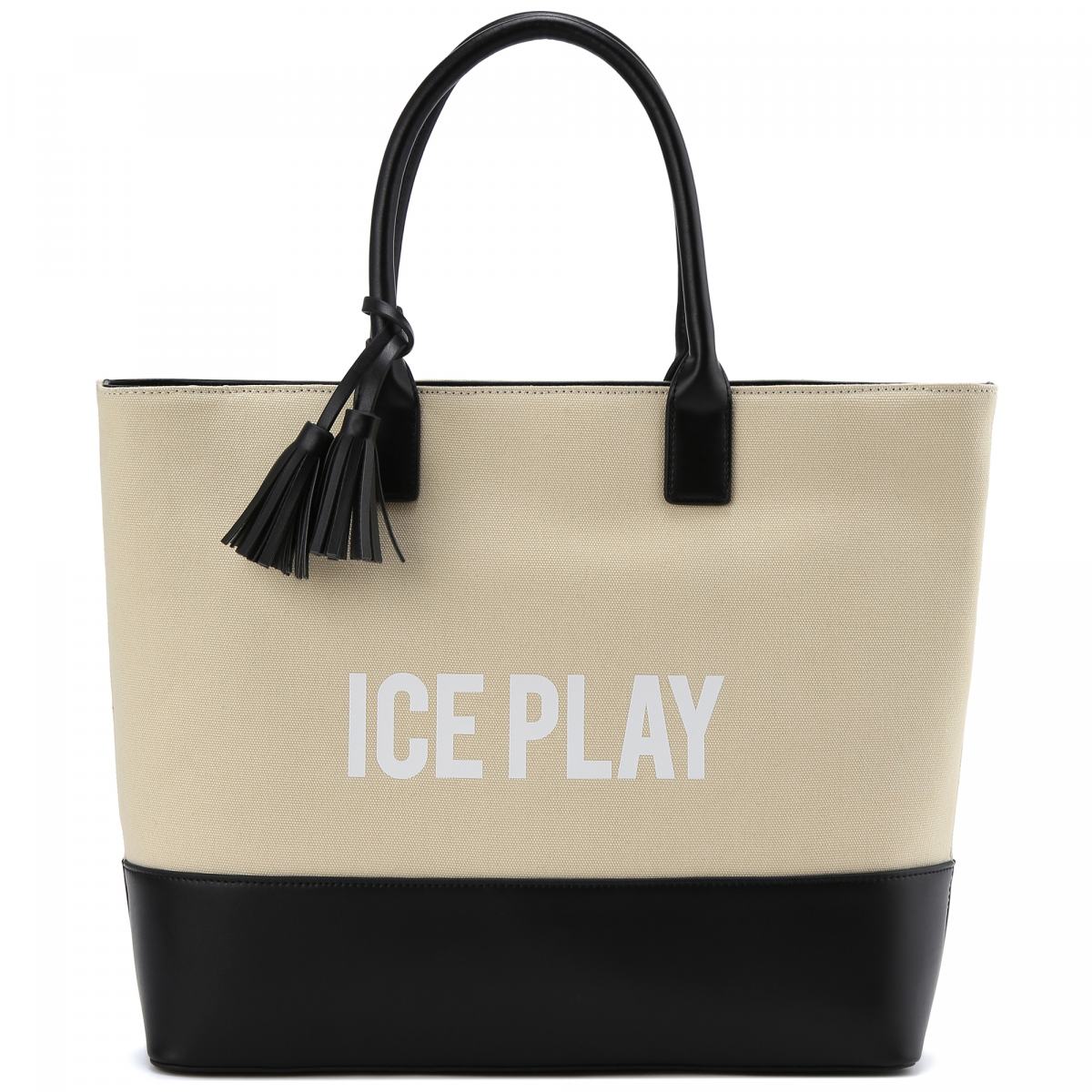 Сумка-шоппер из текстильной ткани в бежевом цвете от Ice Play. Вместительная и практичная сумка, с которой можно отправиться за покупками или взять с собой на пляж. У сумки удобные кожаные ручки и съемный ремень на плечо из кожи. Сумка закрывается на молнию, внутри текстильная подкладка и карман на молнии для мелочей. Модель украшает большой кожаный логотип Ice Play.