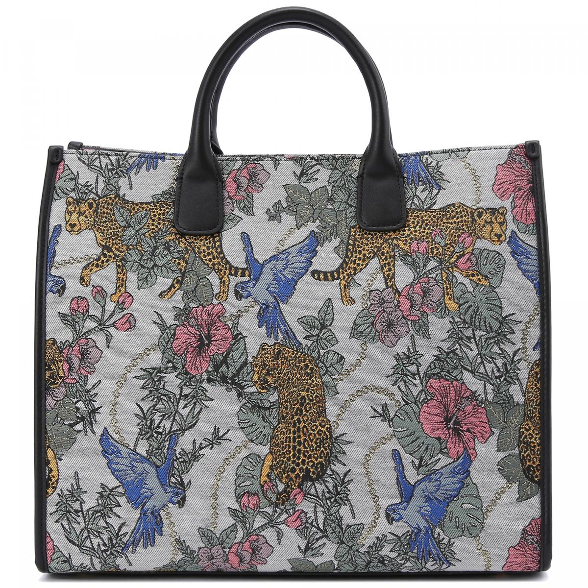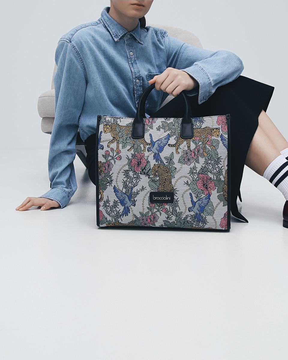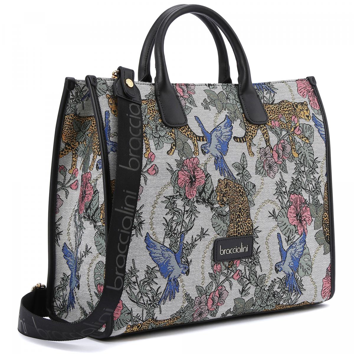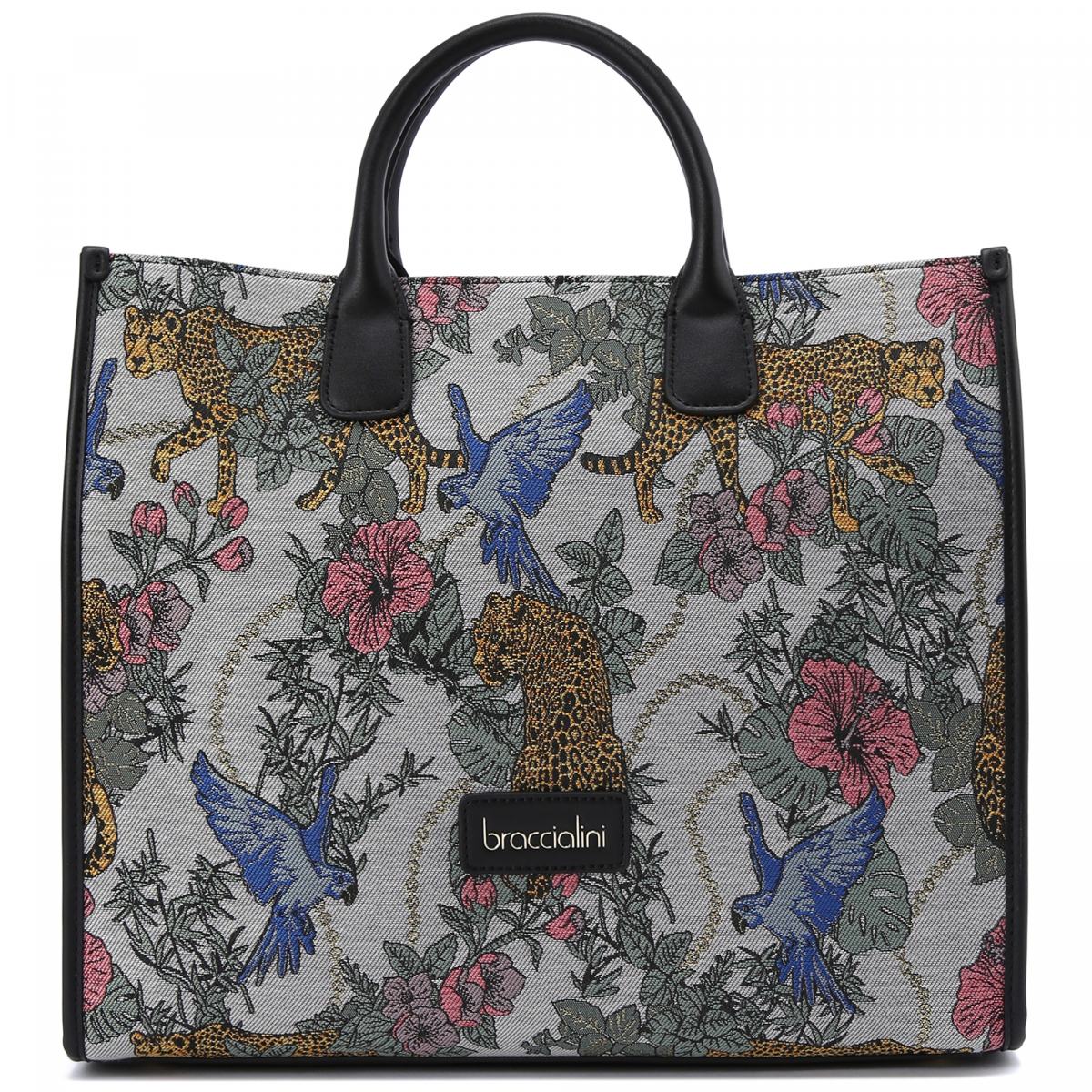 Сумка из текстильной ткани от Braccialini. Жаккардовая текстура с тропическими узорами и логотипом Braccialini идеально впишется в летние образы. Ручки выполнены из кожи, в комплекте так же ремень на плечо из текстильной ленты с фирменным логотипом бренда. Сумка застегивается на молнию, внутри подкладка из текстильной ткани и карман на молнии.