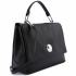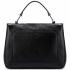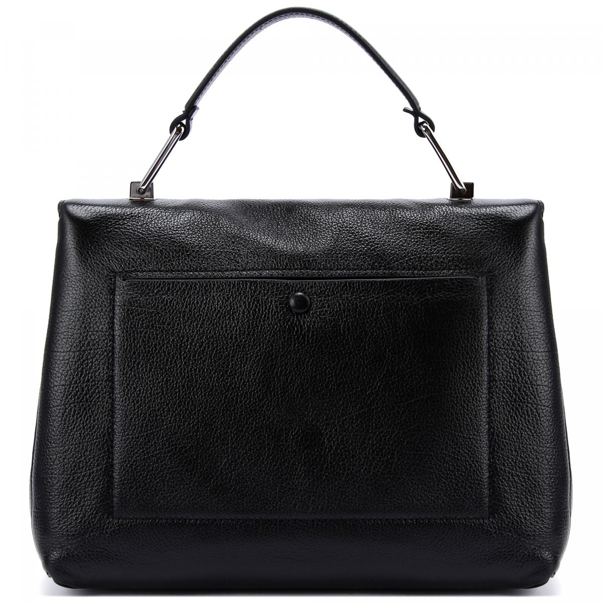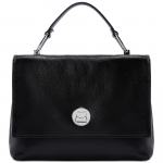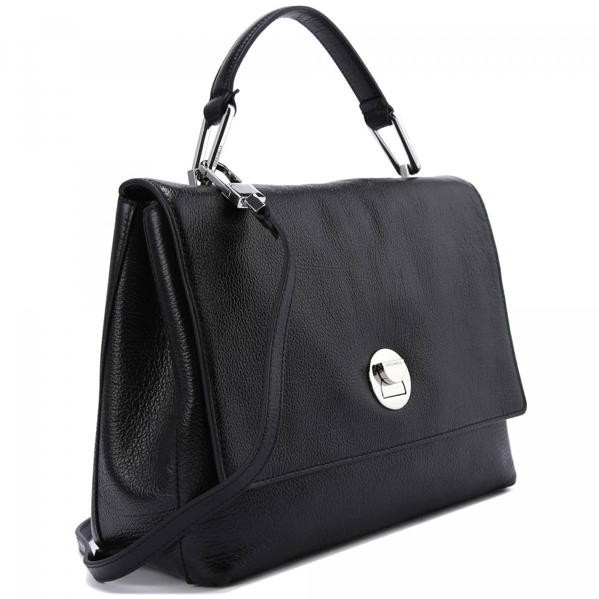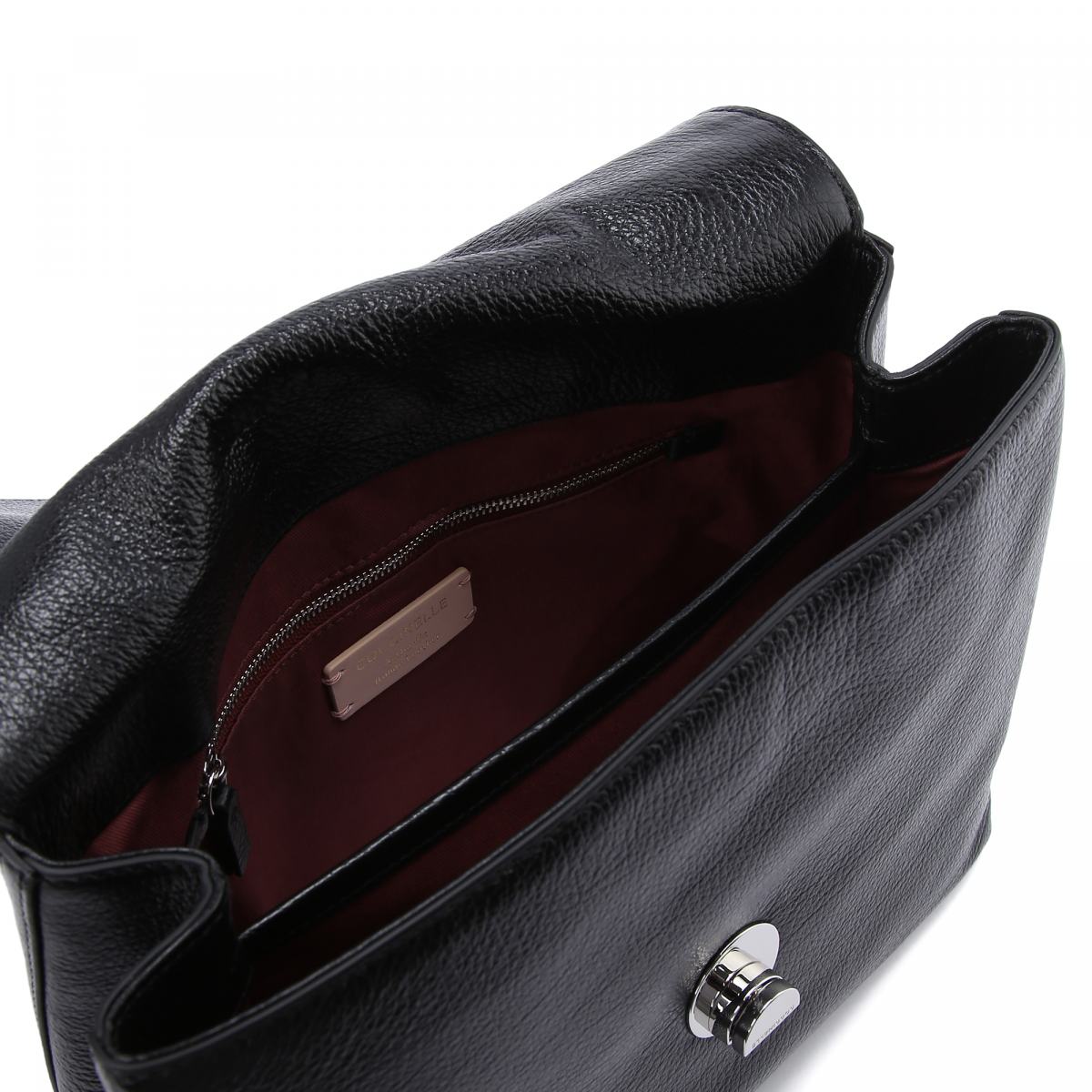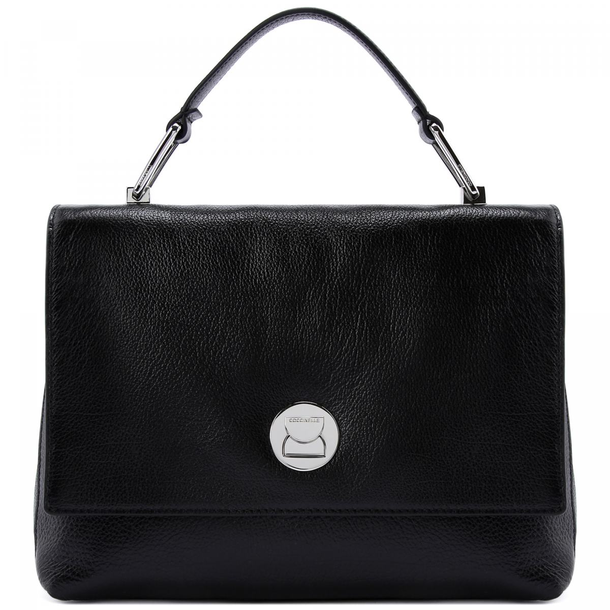 Сумка прямоугольной формы из мягкой черной кожи от Coccinelle. Модель с ремнём на плечо из кожи, который можно снять, и кожаной ручкой. Сумка закрывается на металлический замок, внутри два отделения, текстильная подкладка и небольшой карман на молнии с фирменным кожаным лейблом. На задней стороне сумки дизайнеры предусмотрели дополнительный карман с застёжкой на кнопку.