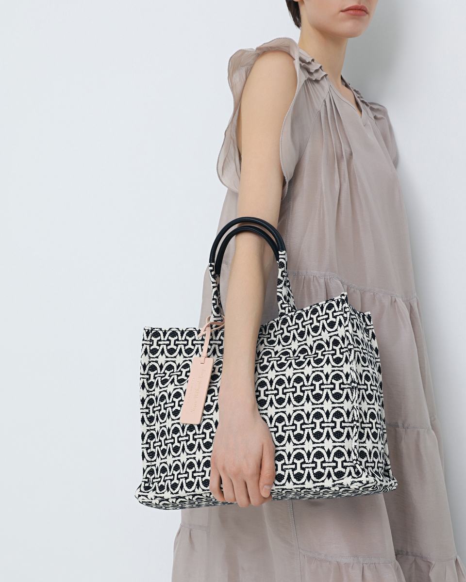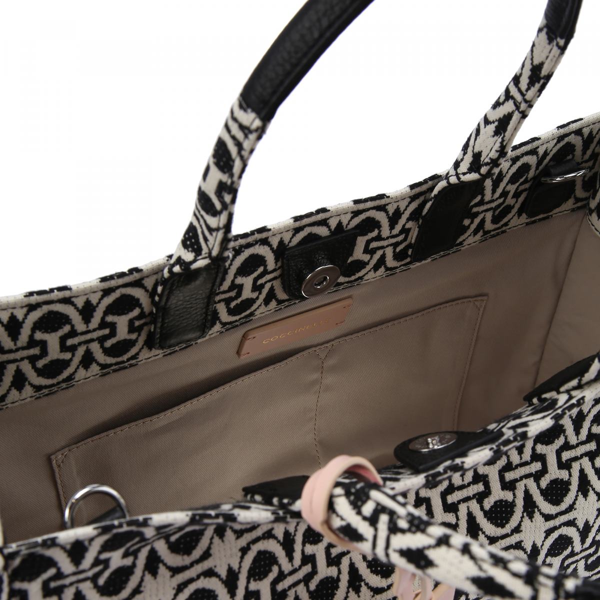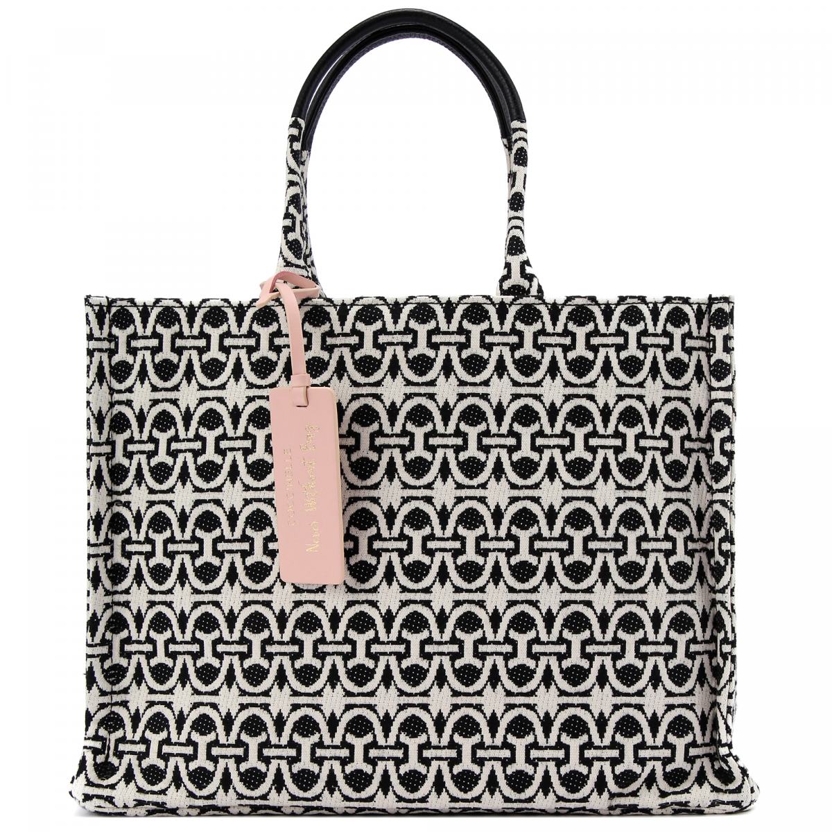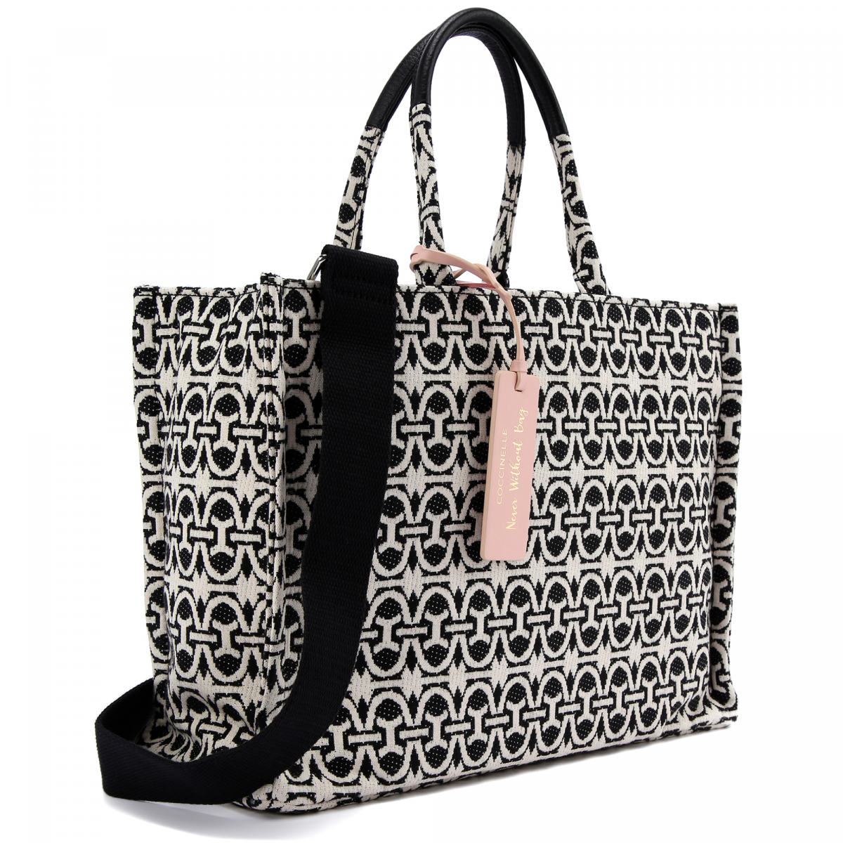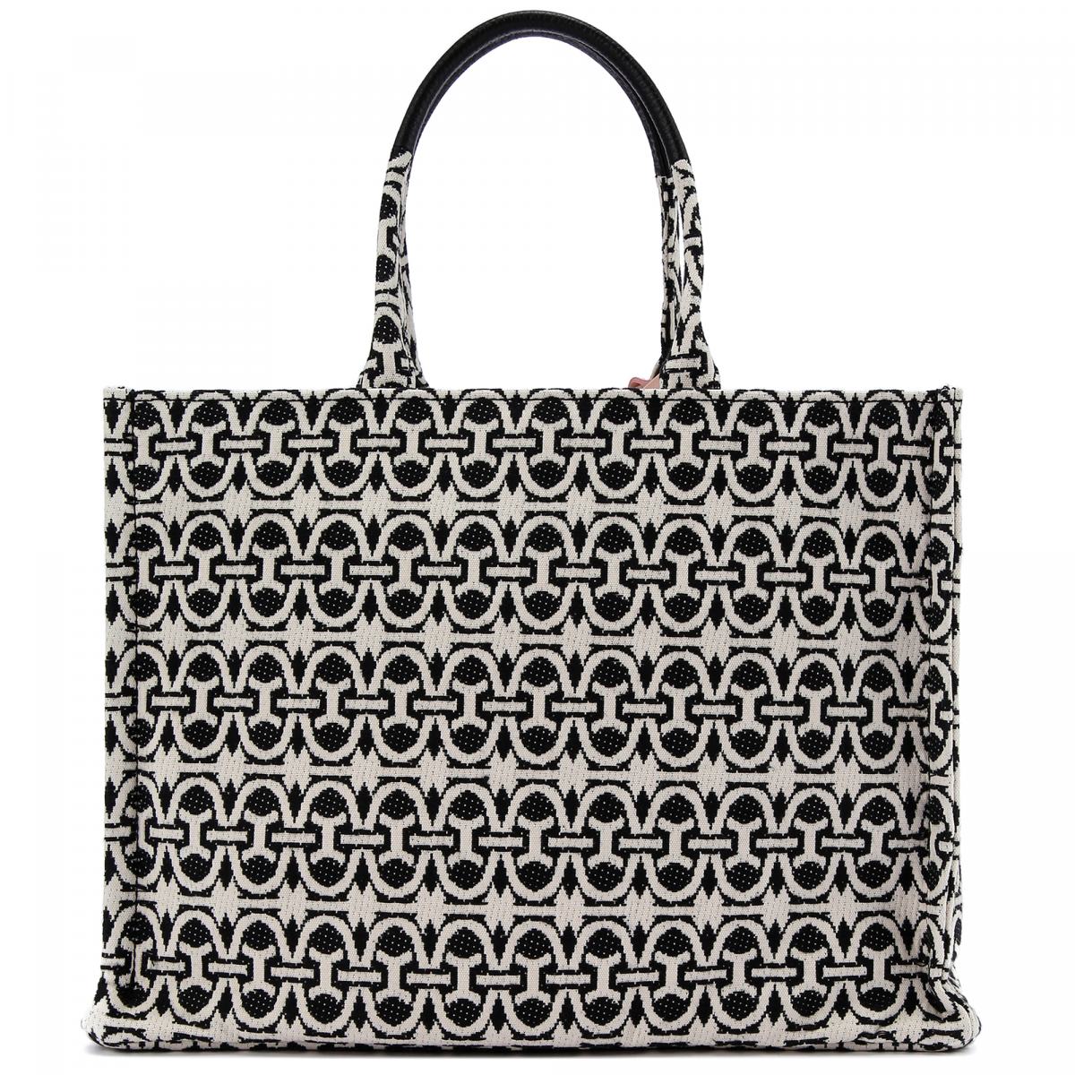 Текстильная сумка в черно-белом цвете от Coccinelle. Never Without Bag — это специальная большая сумка для покупок, изготовленная из текстиля с фирменным узором. Удобные ручки дополнены кожаными вставками. Сумка закрывается на магнитный замок, внутри текстильная подкладка и карманы для небольших вещей. В комплекте ремень на плечо. Удобная и вместительная сумка, без которой невозможно обойтись!