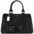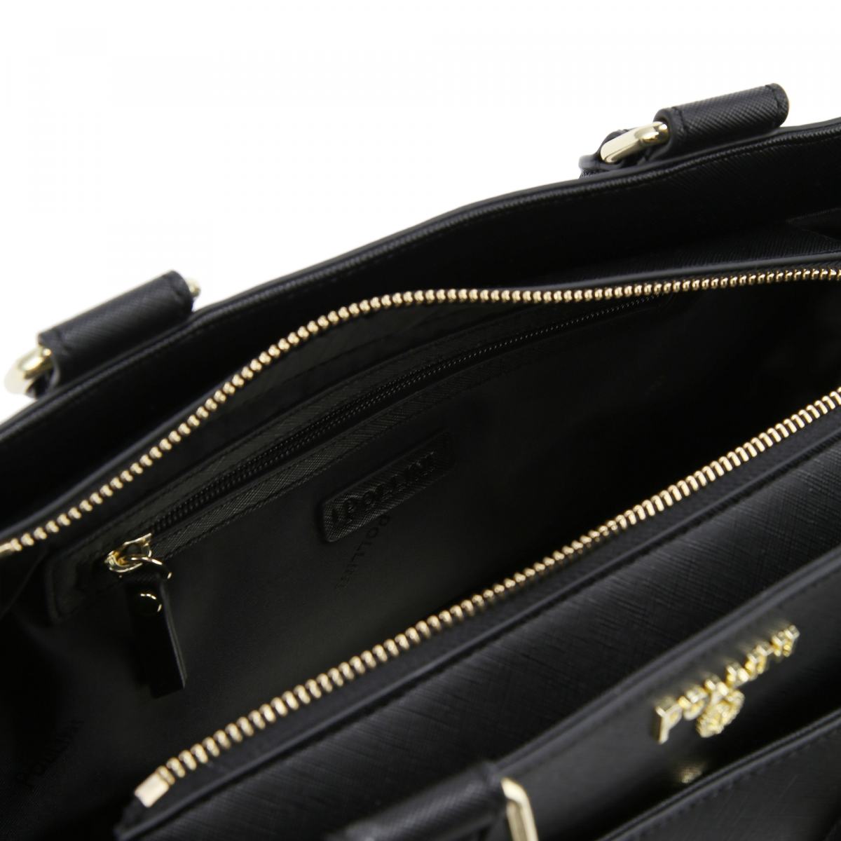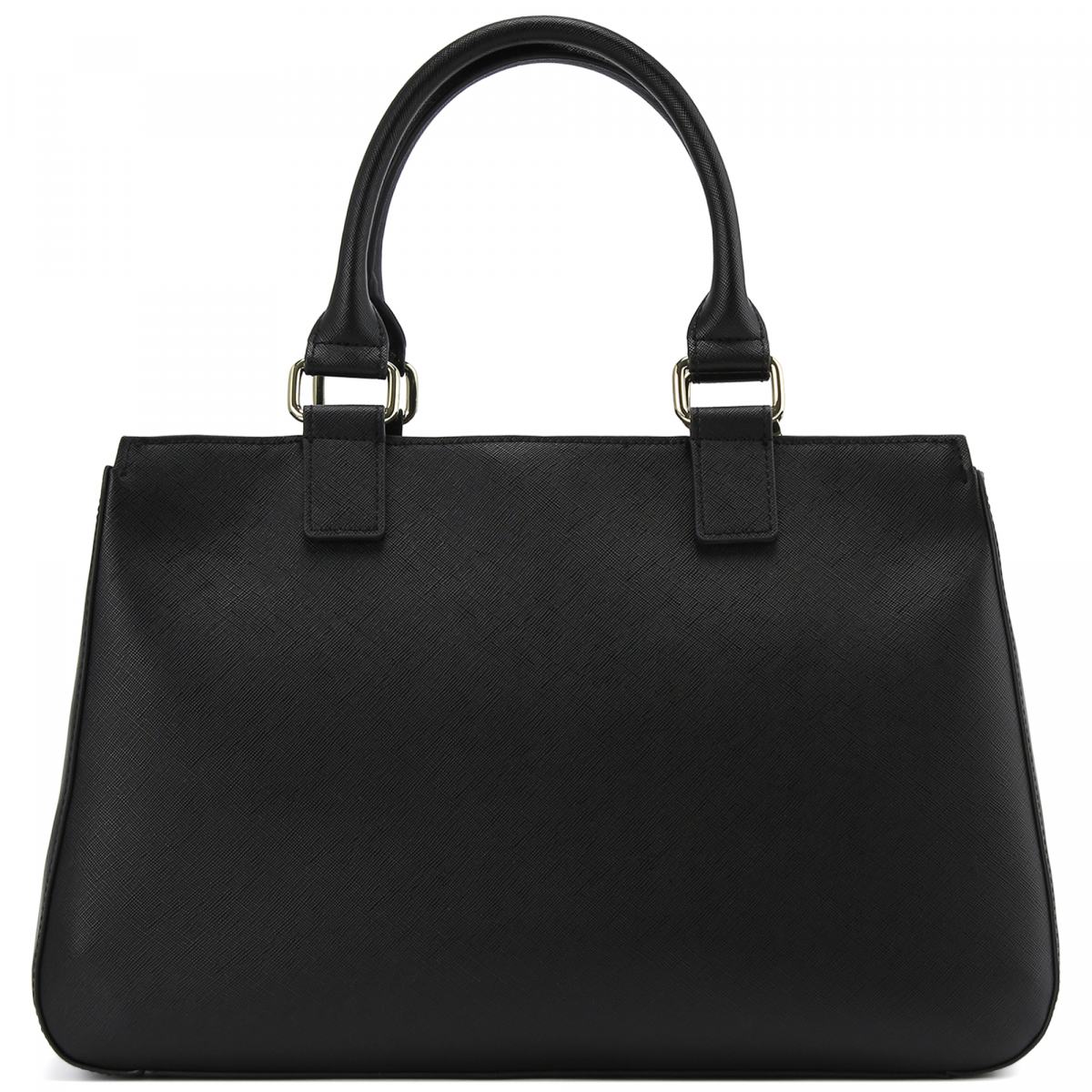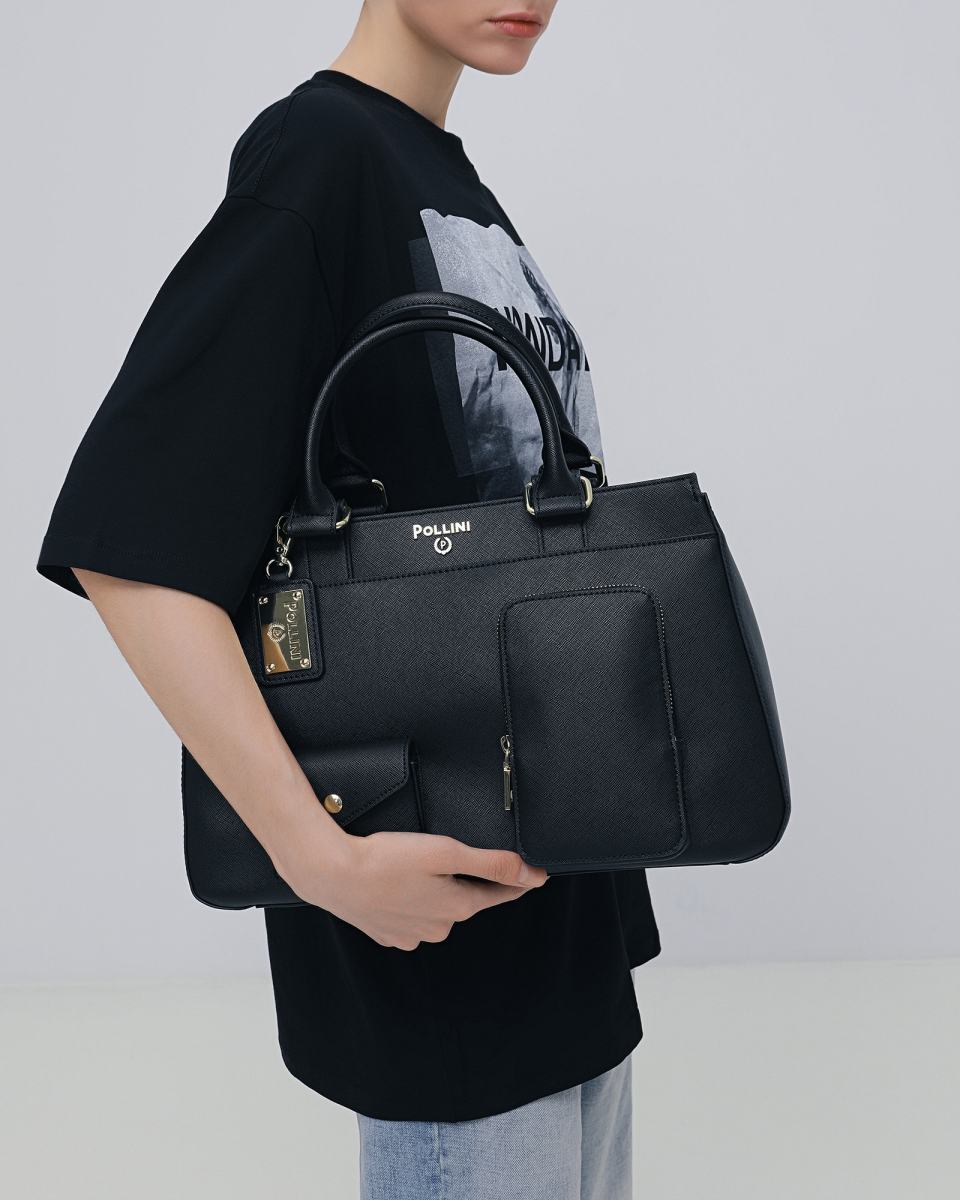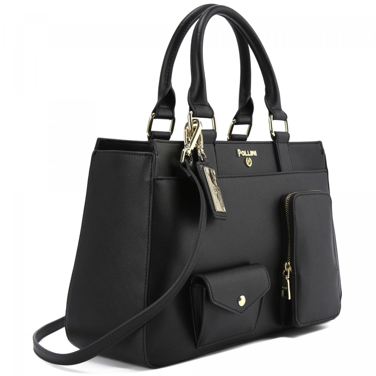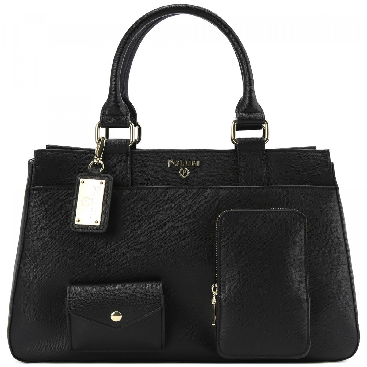 Сумка из искусственной кожи в черном цвете от Pollini. Небольшая сумочка прямоугольной формы прекрасно подойдёт к образам в классическом стиле, а множество карманов позволит разместить все необходимые вещи. У сумки плотные кожаные ручки и съемный ремень на плечо на карабинах. Застежка на молнию, внутри подклад из текстильной ткани и небольшой карман на молнии. Сумочку украшает фирменный логотип бренда, так же в комплекте небольшой брелок из кожи.