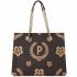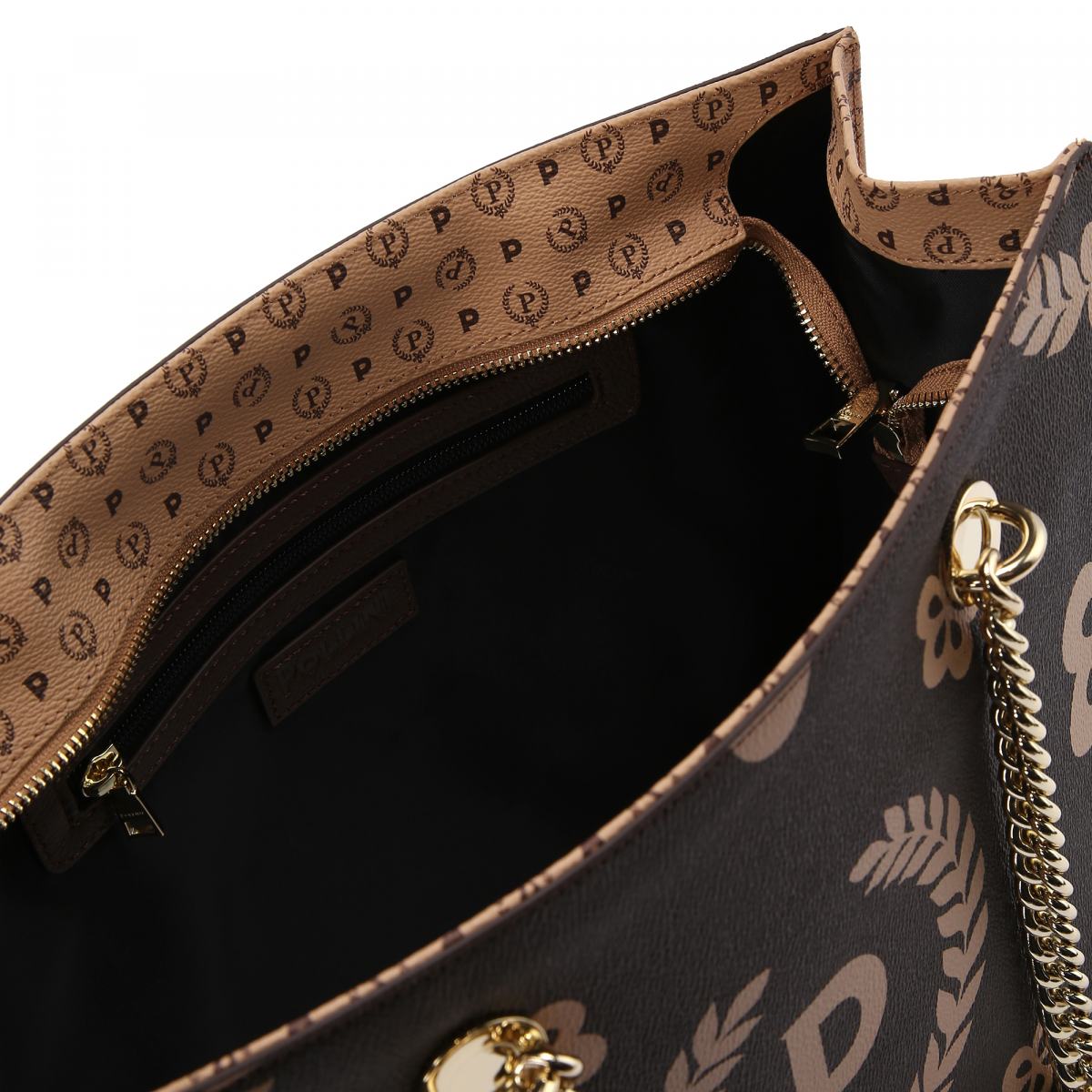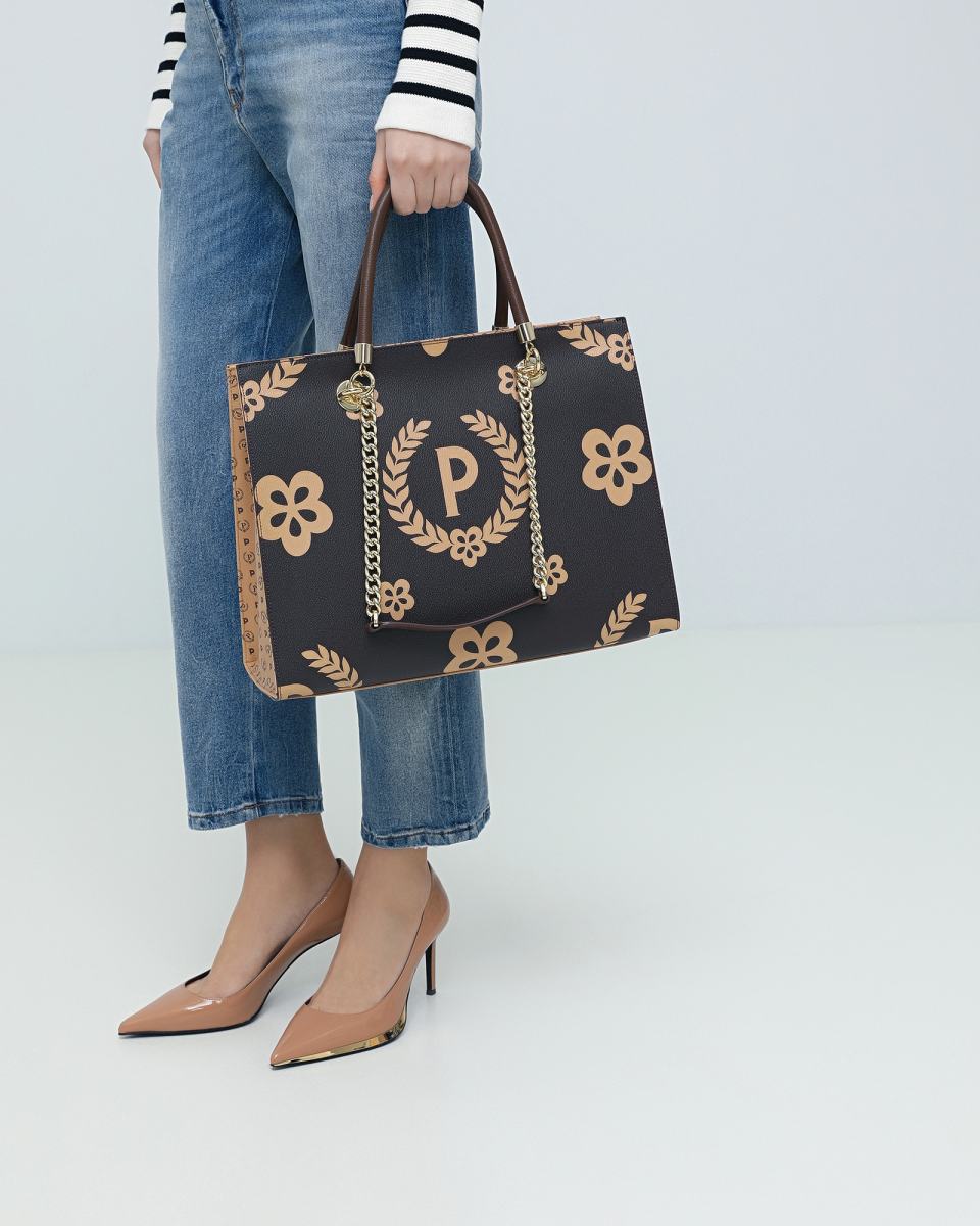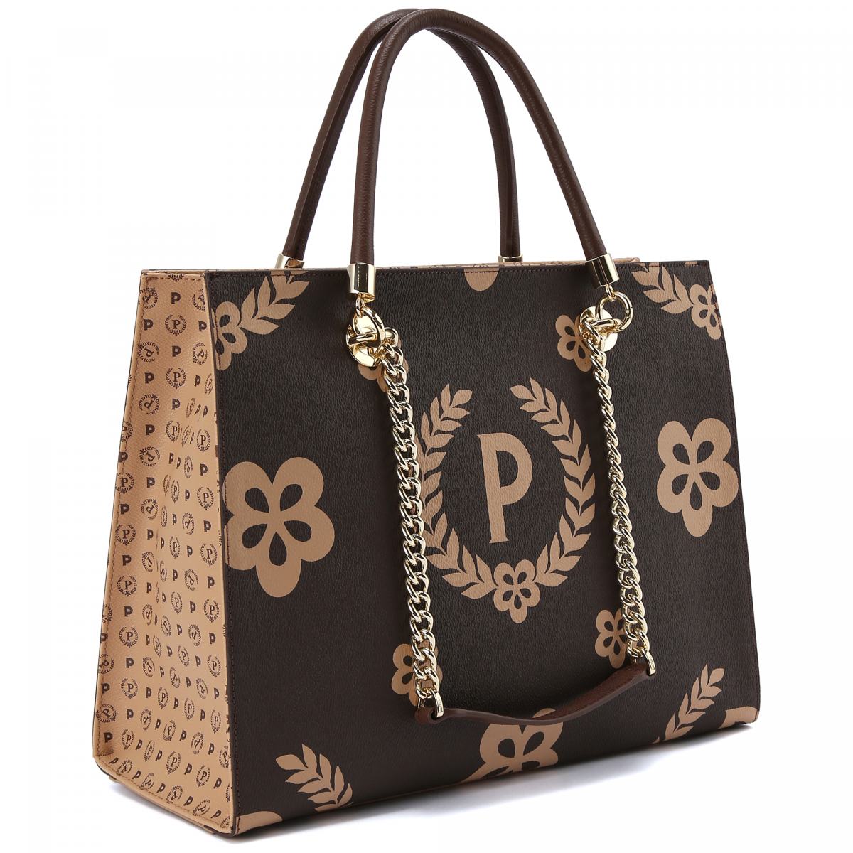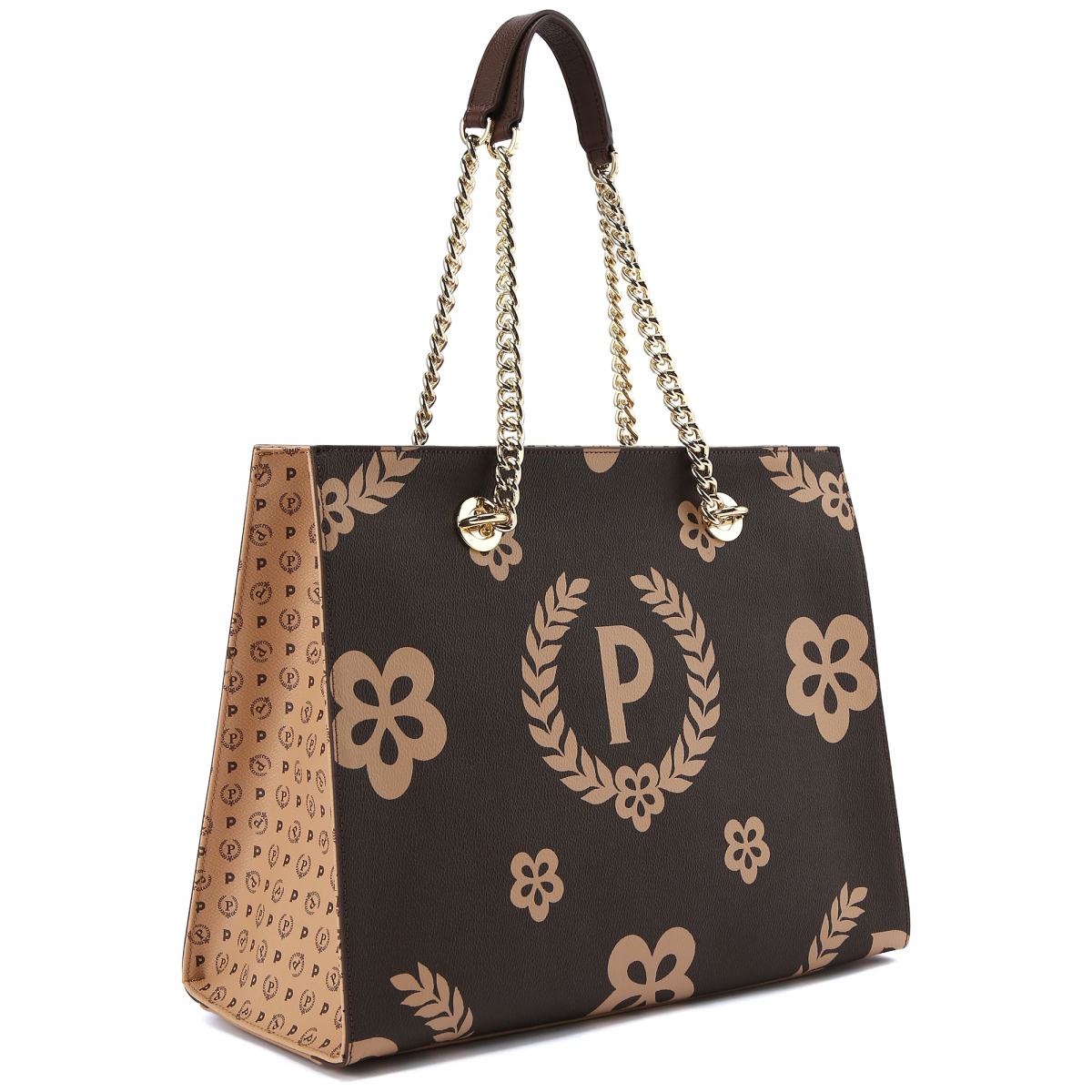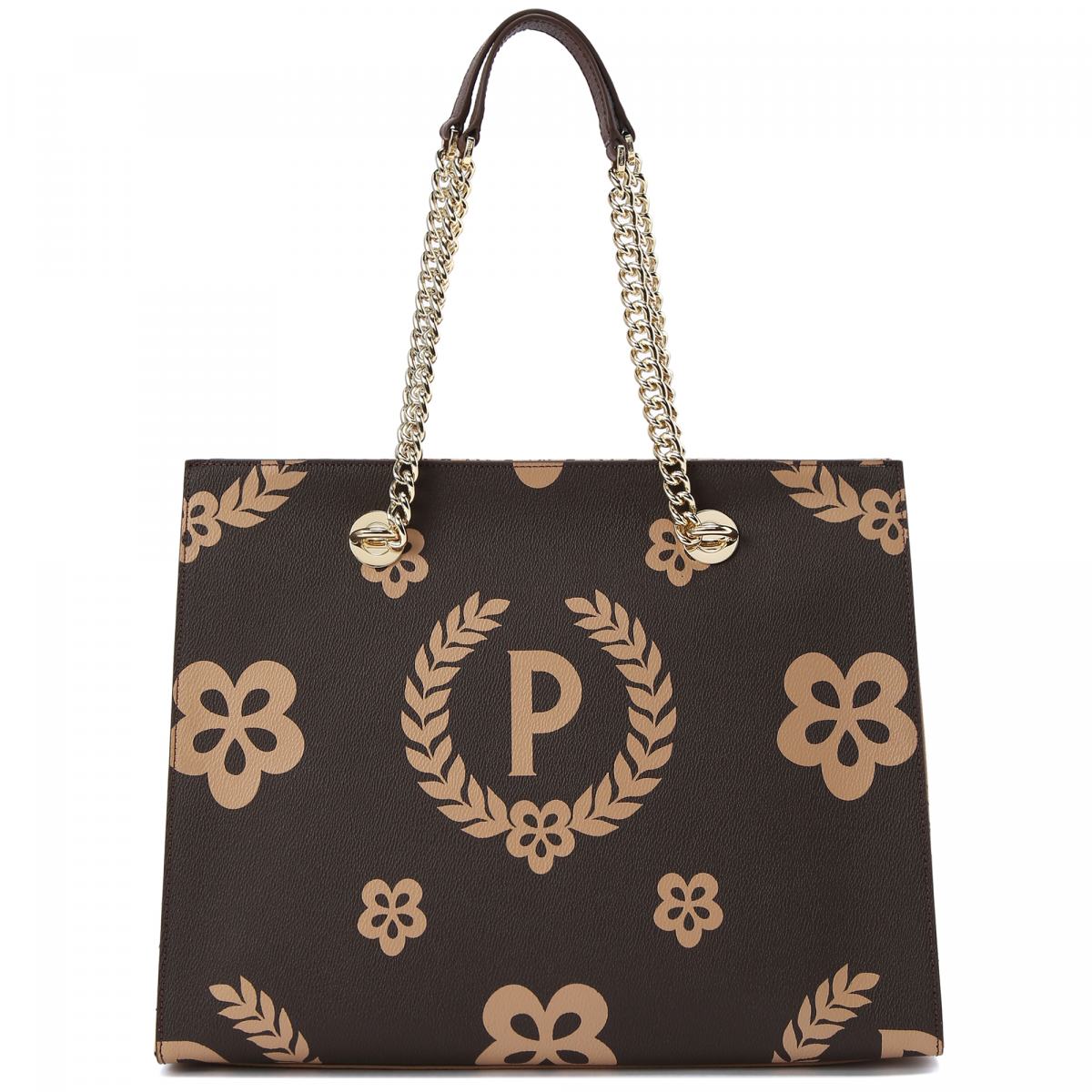 Сумка из коричневой эко кожи с фирменной монограммой Pollini и цветочным узором в коричневом цвете. Сумка строгой формы идеально подойдёт к деловому стилю, а фирменный рисунок добавит в образ стильную нотку. Ручки выполнены в виде металлических цепочек золотого цвета, с вставками из кожи. Боковые стороны сумки выполнены из белой кожи с принтом бренда. Внутри большое отделение на молнии и карман на молнии для мелочей. На передней части сумки принт-монограмма в виде буквы Р.