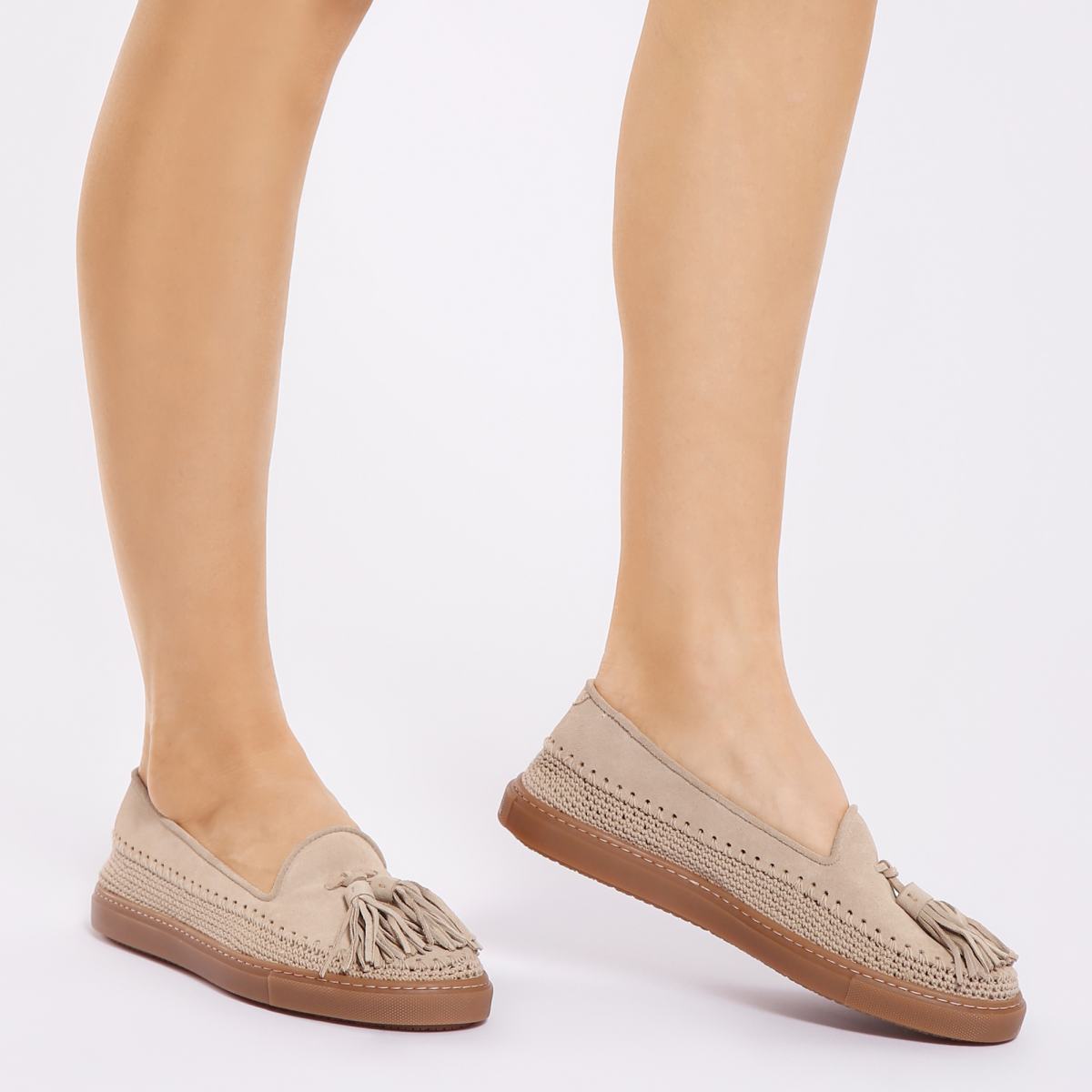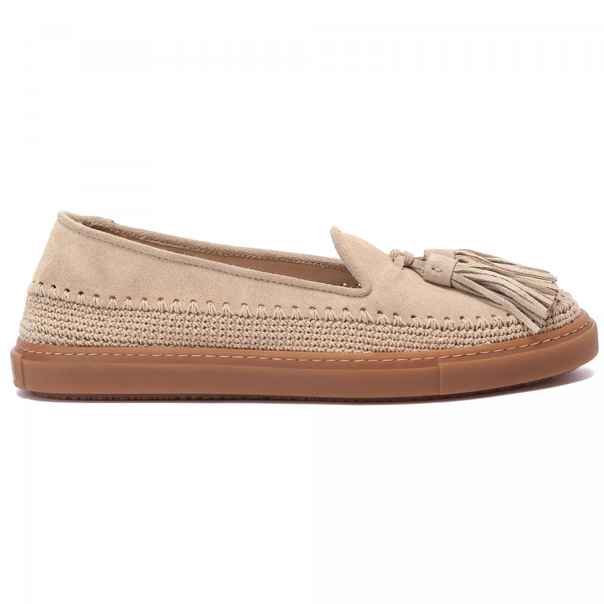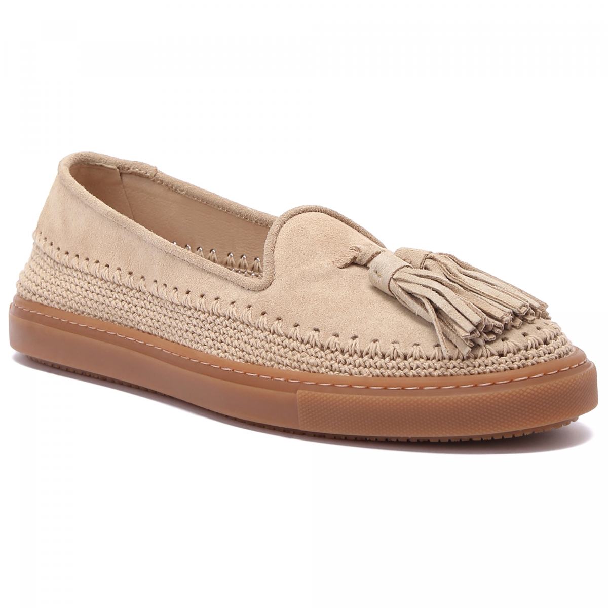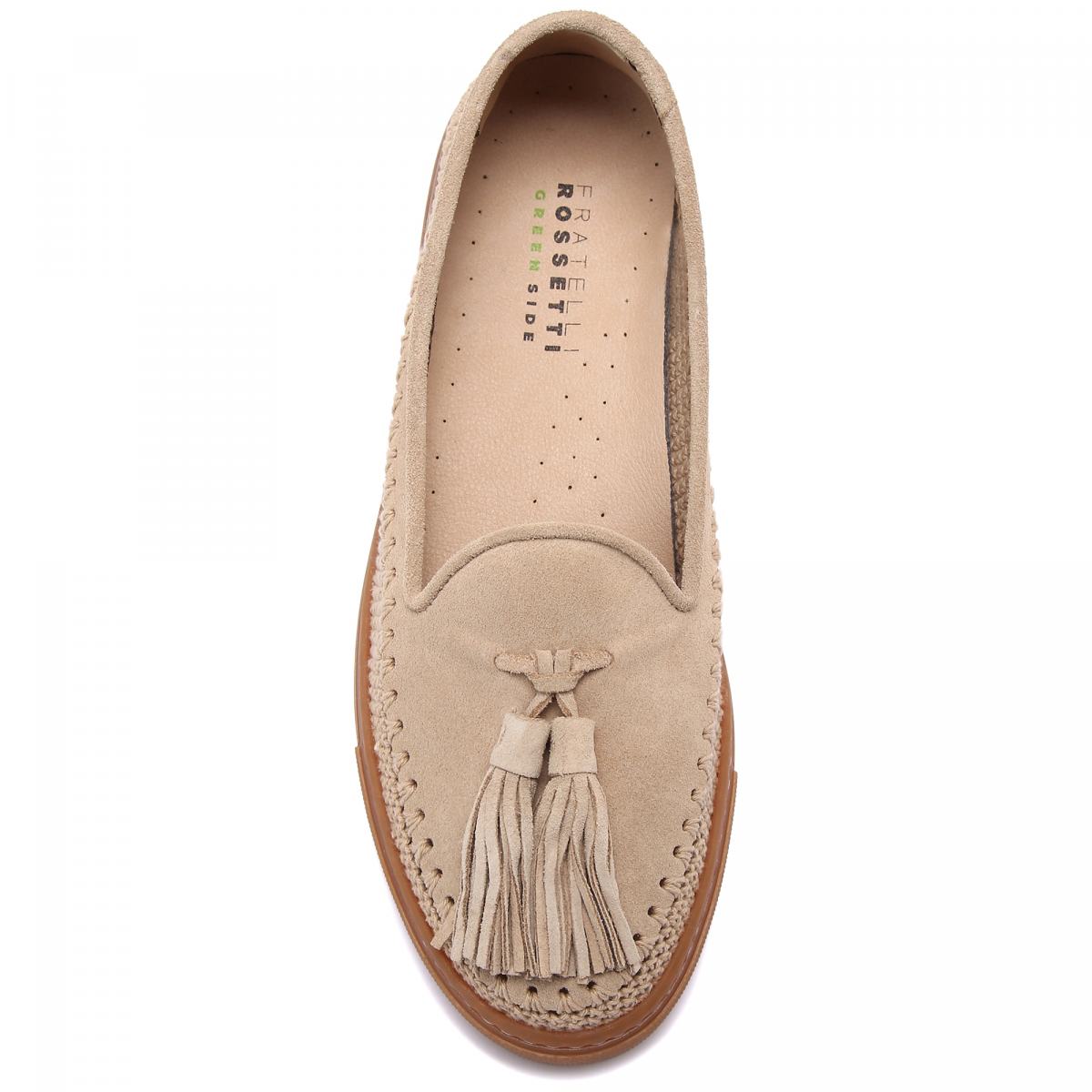 Эспадрильи из мягкой бежевой замши от Fratelli Rossetti. Очень мягкие и удобные, эти туфли подойдут к образам в стиле casual на каждый день. Замшу верха удачно дополняет плетёная вставка у подошвы и фирменные замшевые кисточки сверху. Гибкая подошва выполнена из резины, стелька - из натуральной кожи.