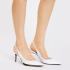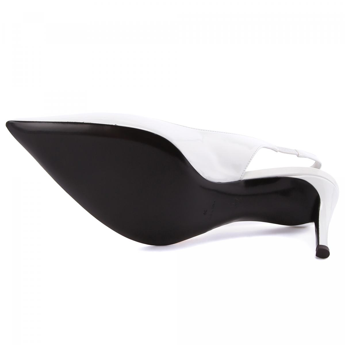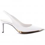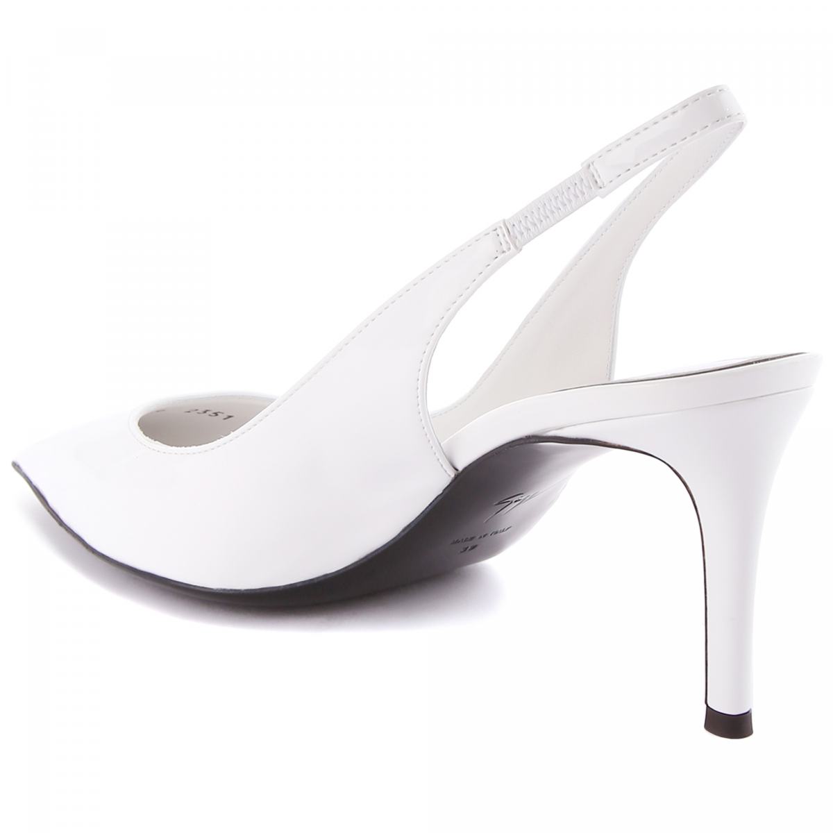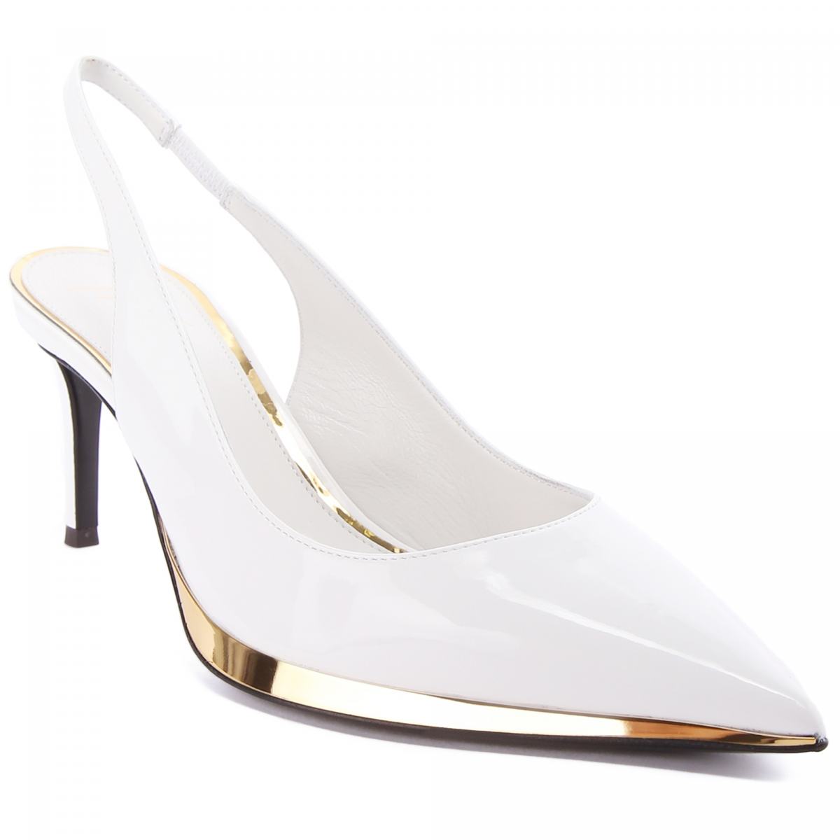 Туфли из белой искусственной кожи от Giuseppe Zanotti. Эти остроносые туфли-лодочки с ремешком на пятке, изготовленные из белой синтетической ткани с лаковым эффектом, сочетаются с обтянутыми шпильками и украшены чёрной кожаной подошвой, обведённой золотистой деталью с зеркальным эффектом снаружи. Пара подойдёт для вечерних и офисных образов в классическом стиле. Высота каблука - 70 мм.