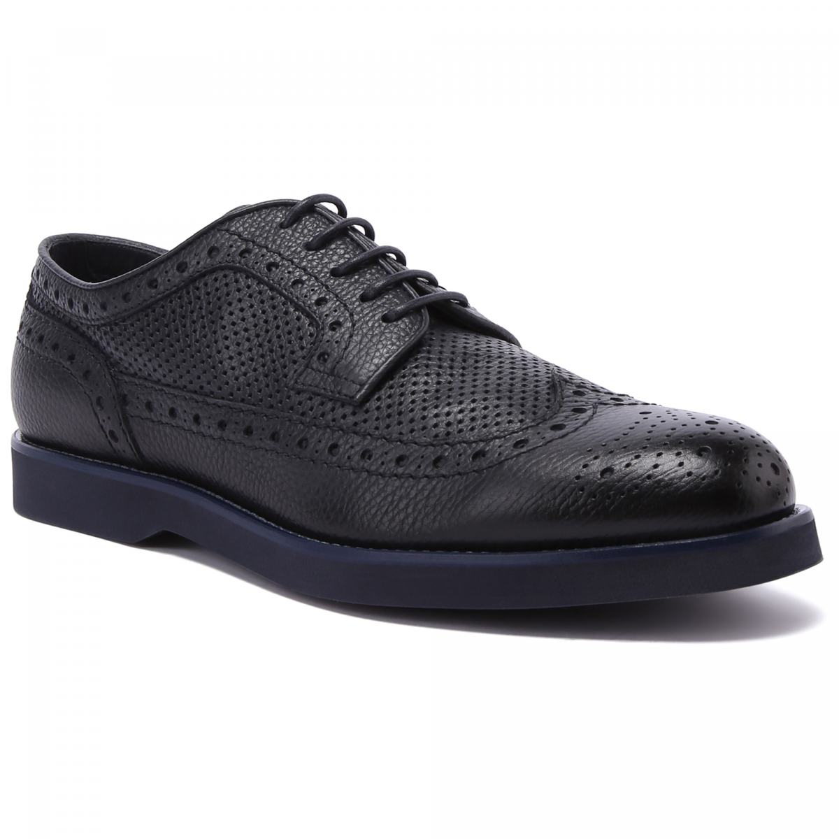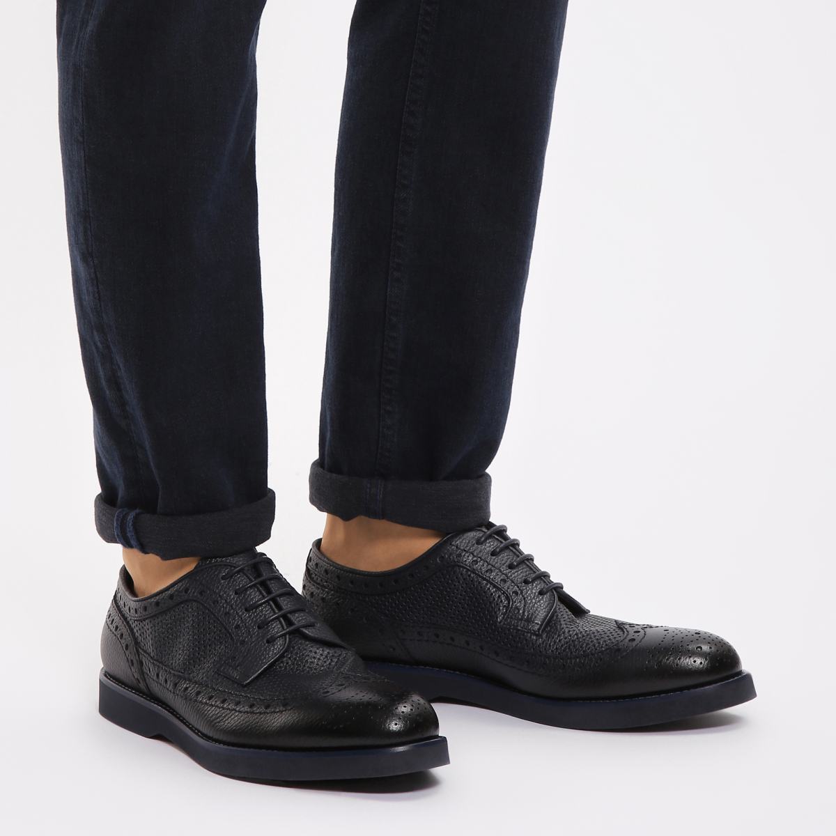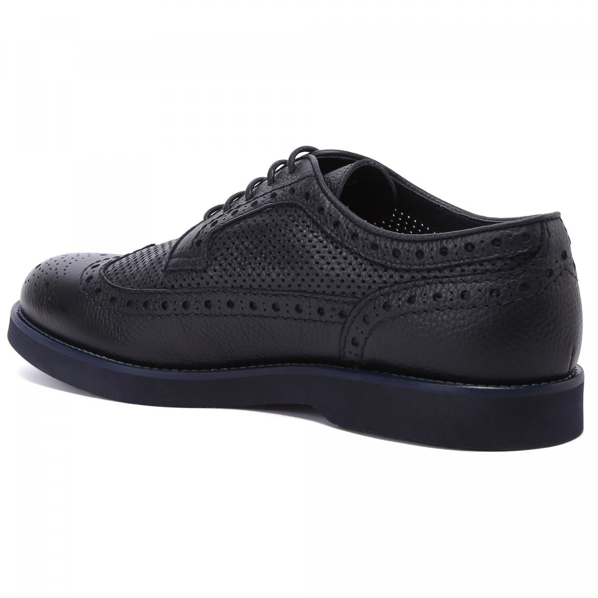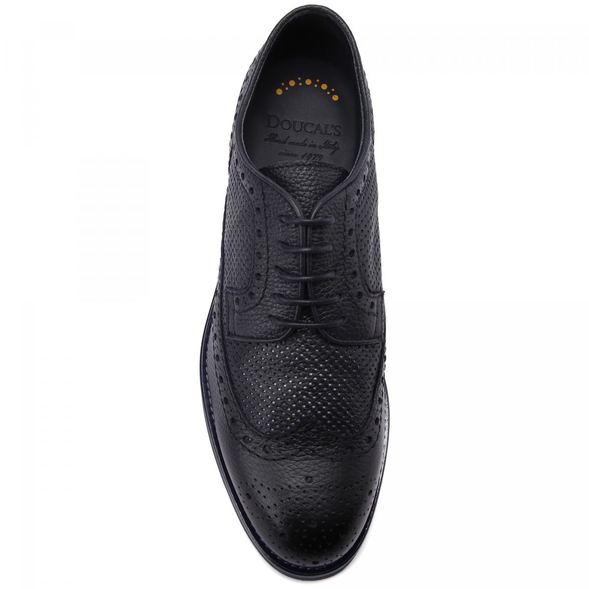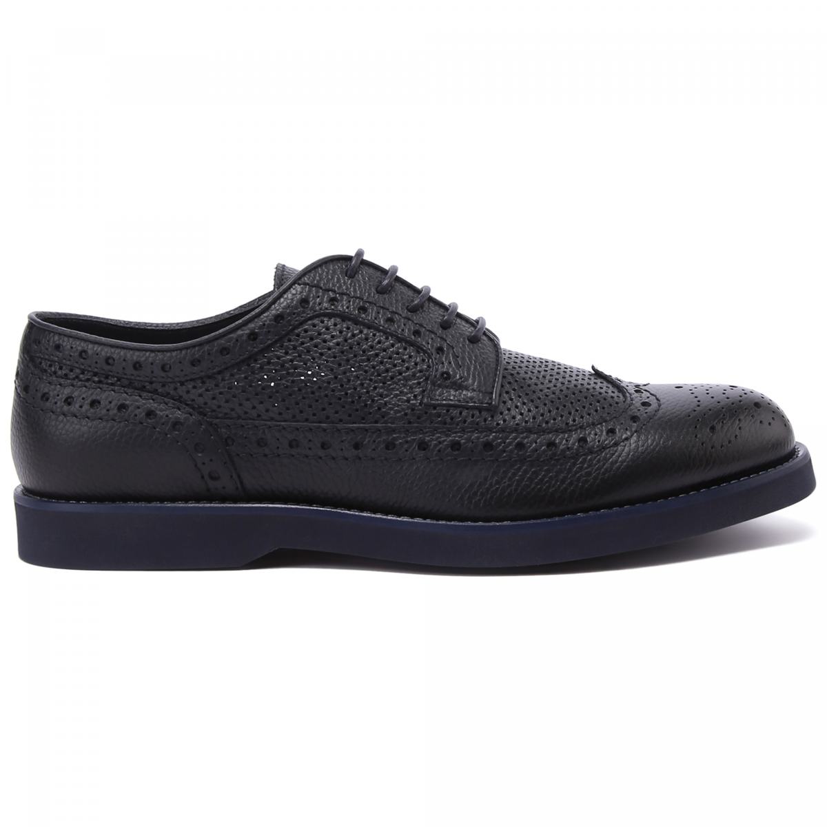 Туфли от Doucal’s из натуральной тёмно-синей кожи. Пара из летней коллекции бренда выполнена из зернистой кожи и дополнена сквозной перфорацией и узором на носке. Стильные туфли прекрасно впишутся в деловой или повседневный гардероб. Модель с резиновой подошвой, тонкой шнуровкой, кожаной подкладкой и стелькой.