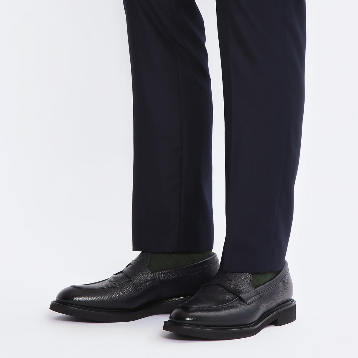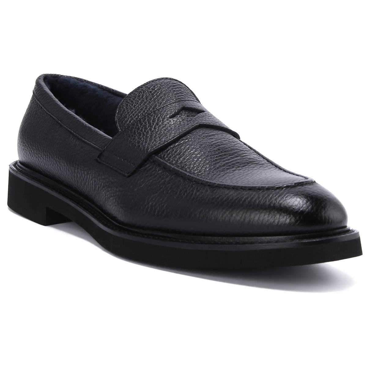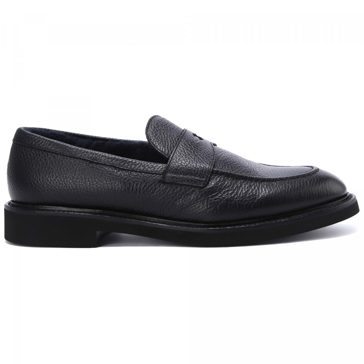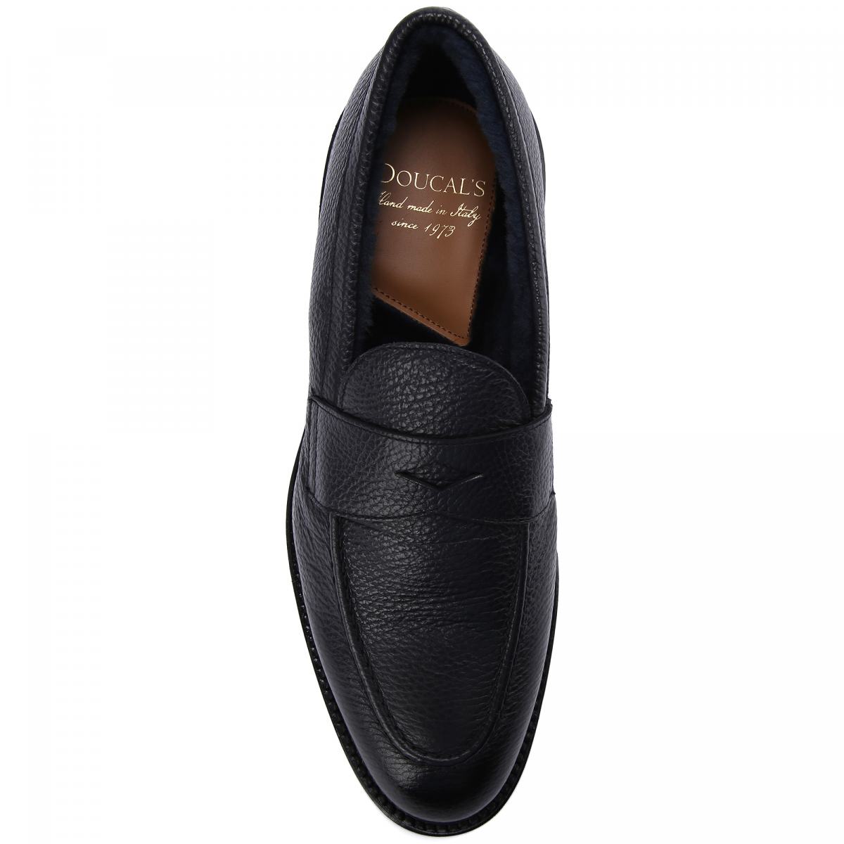 Мокасины из тёмно-синей зернистой кожи от Doucal’s. Городская модель в стиле casual прекрасно подойдёт для холодных дней. Верх выполнен из зернистой натуральной кожи. Подкладка и стелька выполнены из натурального меха. Дизайн завершает гибкая резиновая подошва с небольшим каблуком. Модель подойдёт как для формальных офисных образов, так и для более расслабленного городского стиля.