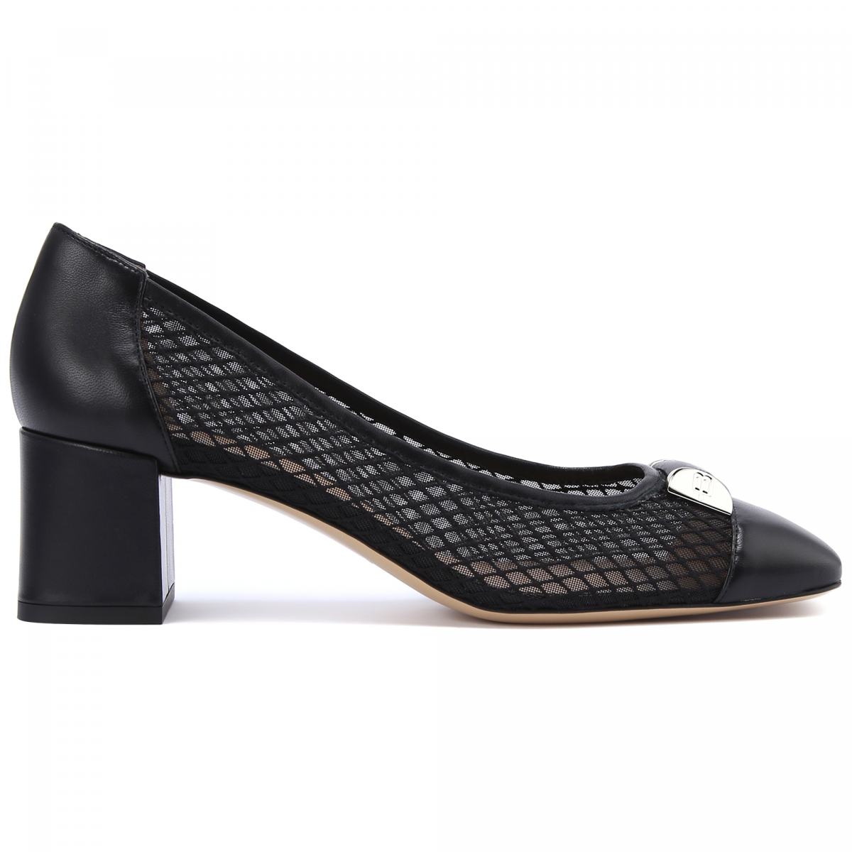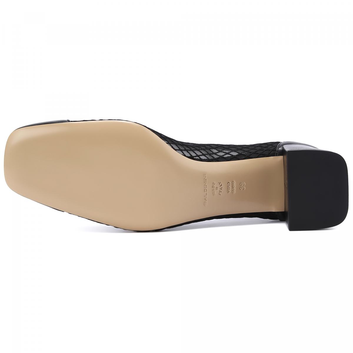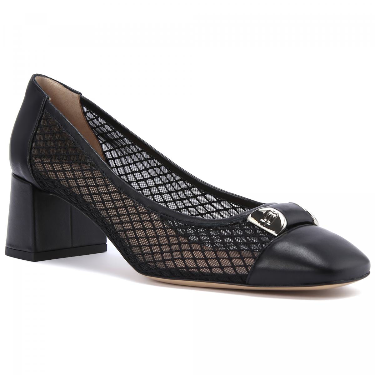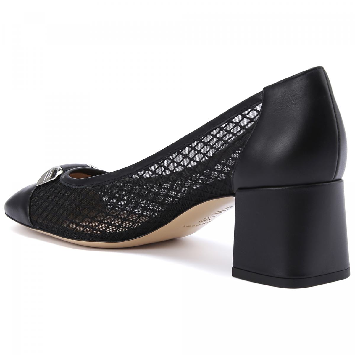 Чёрные туфли от Baldinini отлично подойдут для тех, кому необходимо соблюдать дресс-код даже в жаркий день. Модель выполнена из текстильной сетки, при этом пятка и носок закрыты натуральной кожей. Квадратный каблук также обтянут кожей. Завершает дизайн декоративная вставка на передней части. Квадратный мыс и устойчивый каблук обеспечат комфорт, поэтому туфли можно добавлять в повседневные образы.