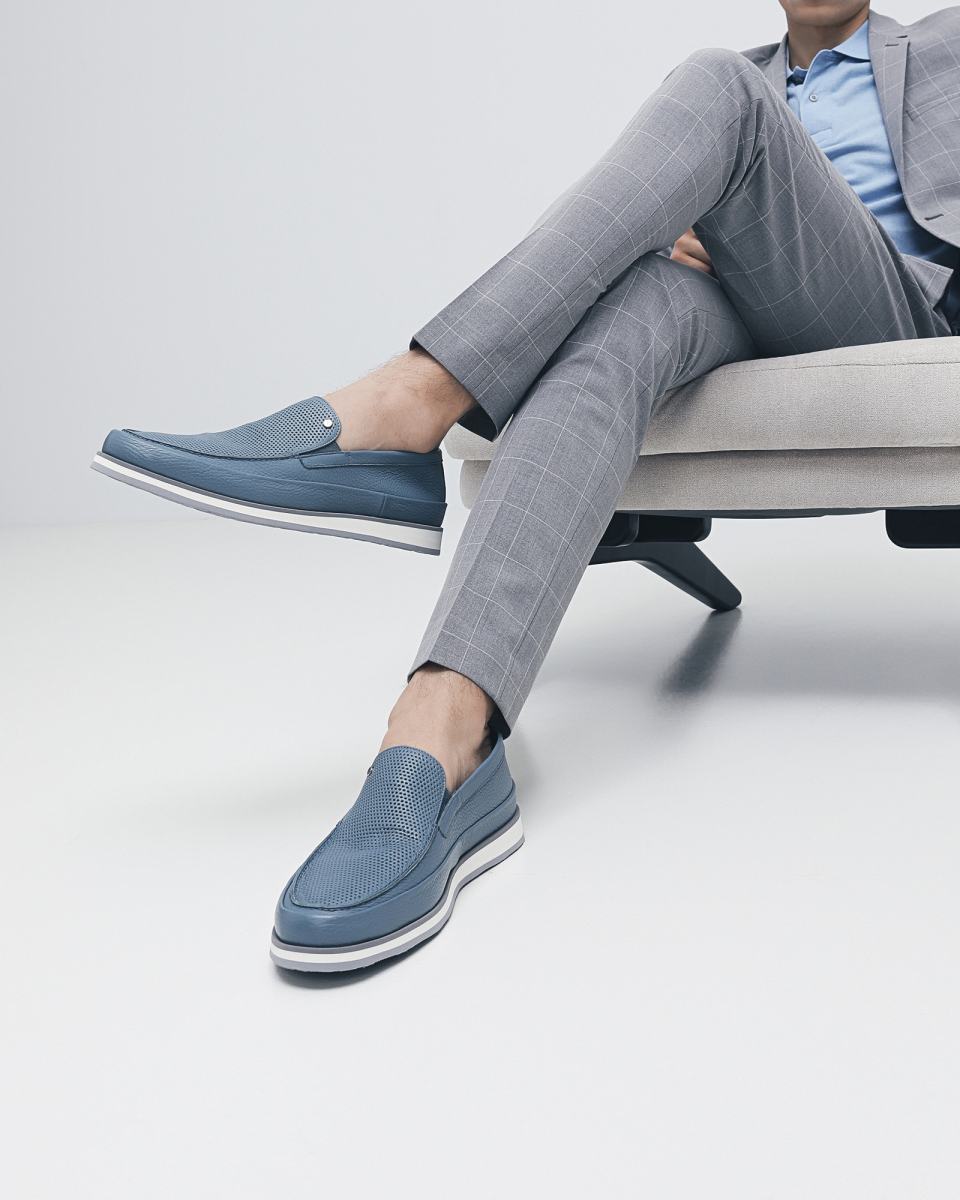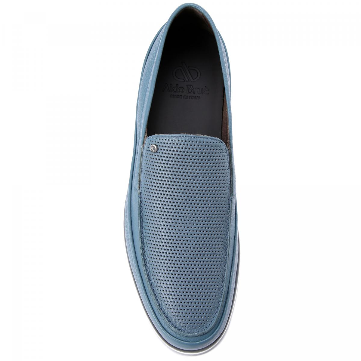 Мокасины из натуральной кожи в голубом цвете от Aldo Brue. Эти лёгкие мокасины в стиле casual созданы в Италии специально для жарких дней. Модель дополнена сквозной перфорацией, обеспечивающей приток воздуха. Стелька из натуральной кожи и гибкая резиновая подошва.
