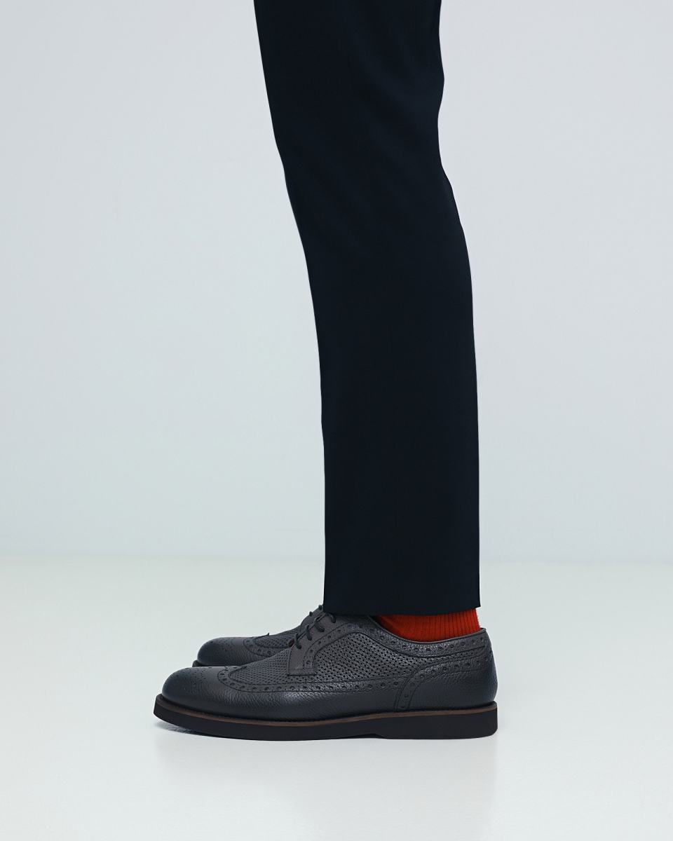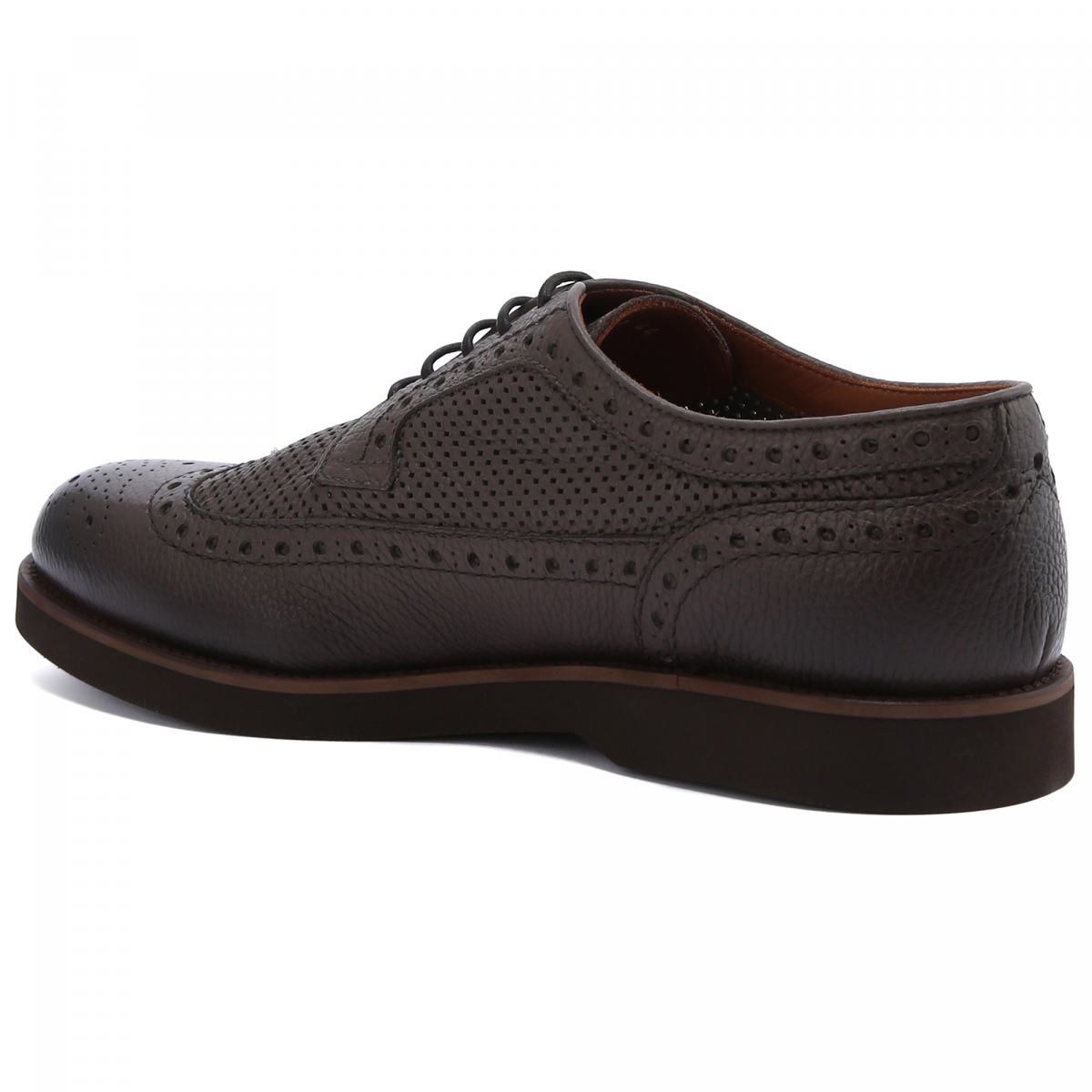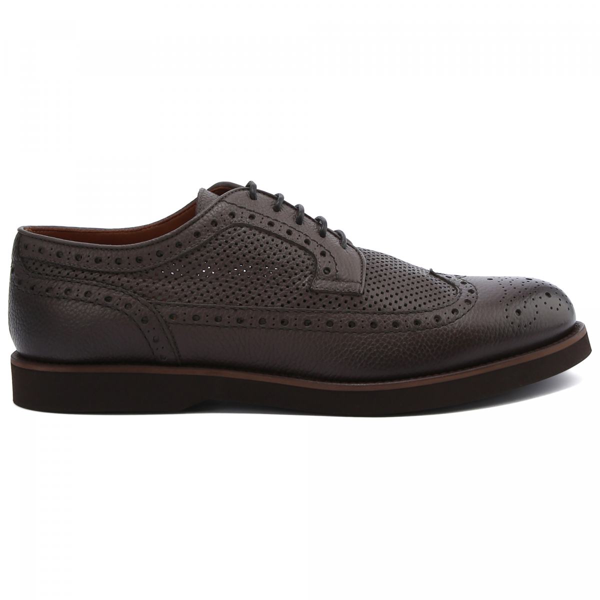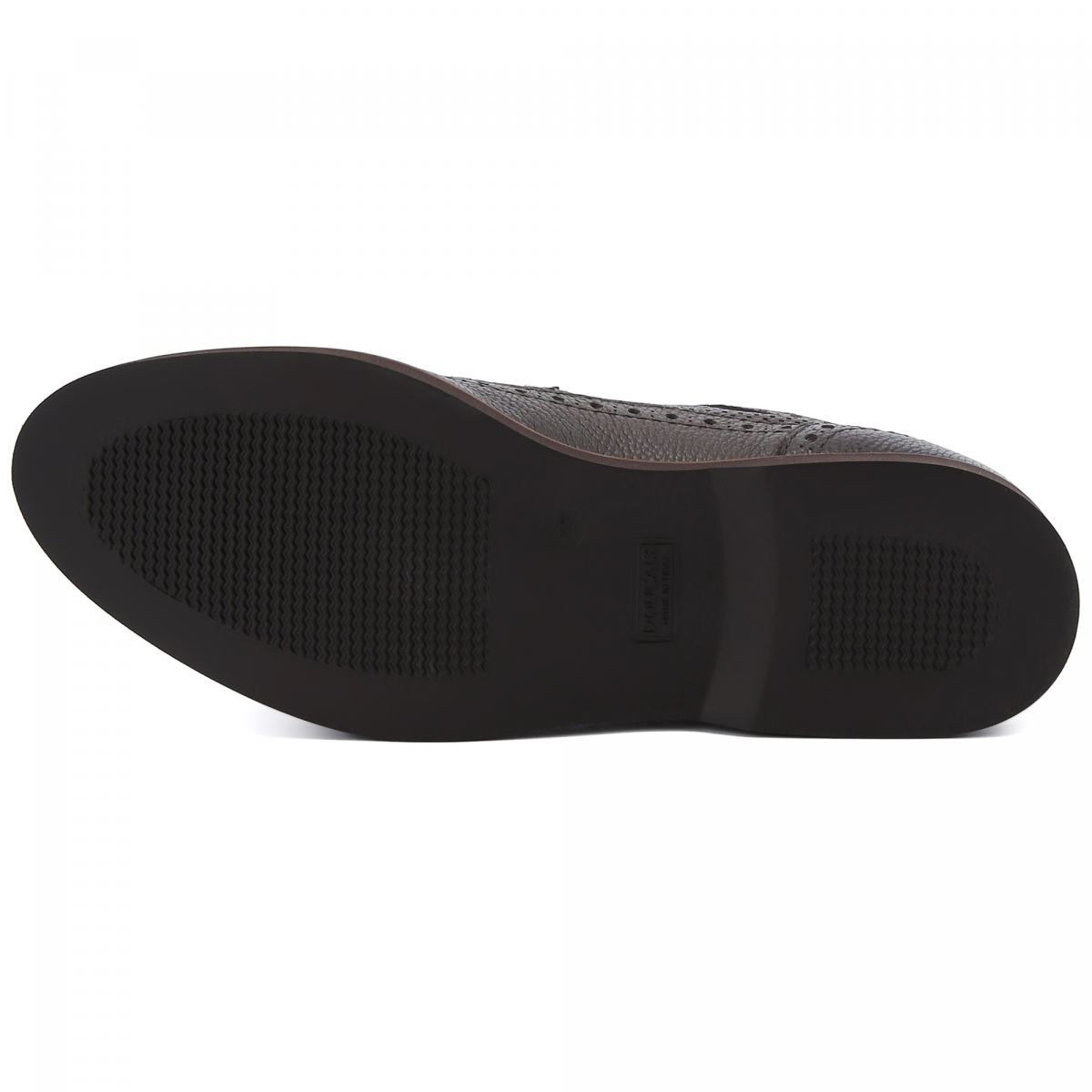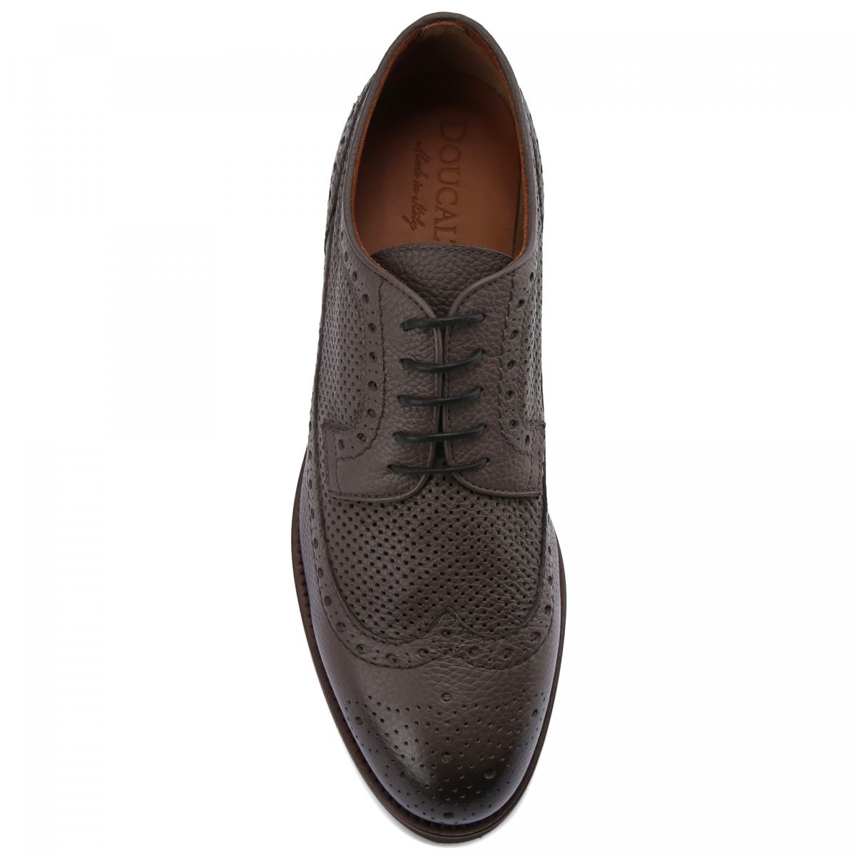 Туфли от Doucal’s из натуральной кожи в тёмно-коричневом цвете. Пара из летней коллекции бренда выполнена из зернистой кожи и дополнена сквозной перфорацией и узором. Стильные туфли прекрасно впишутся в деловой или повседневный гардероб. Модель с резиновой подошвой, тонкой шнуровкой, кожаной подкладкой и стелькой.