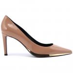 Туфли из искусственной кожи в бежевом цвете от Giuseppe Zanotti. Туфли с заострённым носом на каблуке-шпильке, выполненные из лакированной кожи бежевого цвета, дополнены кожаной подошвой с золотистой зеркальной поверхностью на внешней стороне. Изящная модель для создания элегантного образа в строгом стиле. Высота каблука - 85 мм.
