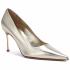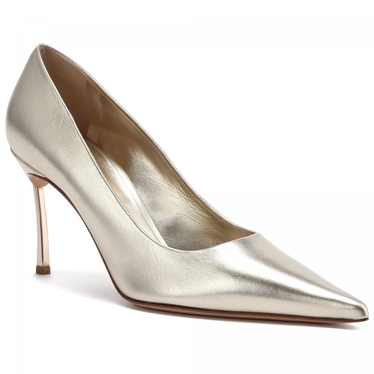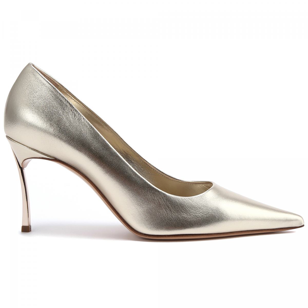 Туфли из натуральной кожи в золотом цвете от Casadei. Элегантная модель выполнена из натуральной кожи золотого цвета. Стальной каблук-лезвие высотой 80 мм. придает образу силу и характер. Туфли для женщин, которые не хотят отказываться от женственного образа даже в офисе.