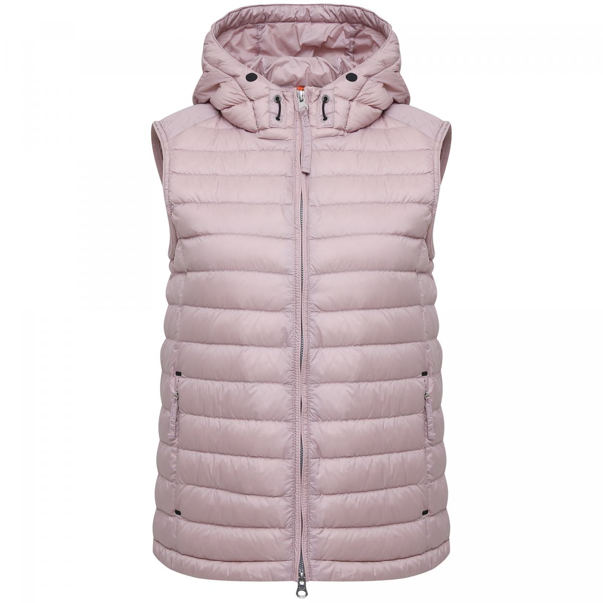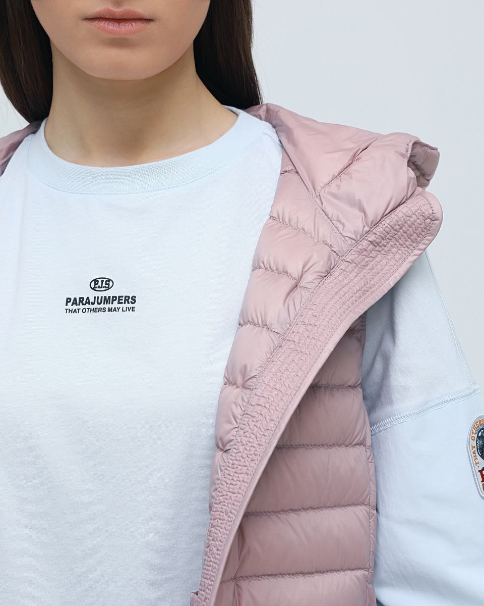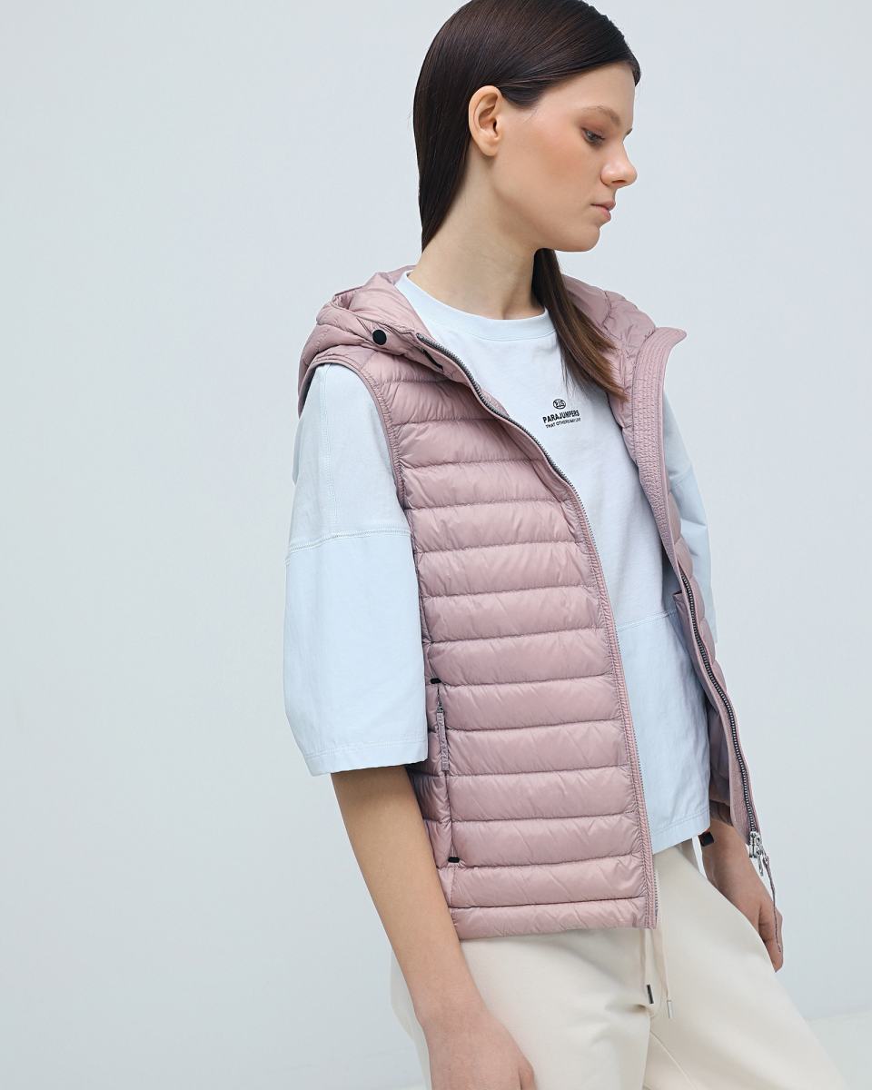 Утепленный жилет в нежно-розовом цвете от Parajumpers. Носите ли вы жилет в межсезонье или надеваете под зимнее пальто для дополнительного тепла - это универсальная вещь, которая обязательно должна быть в вашем гардеробе. Жилет выполнен из плотной водостойкой ткани. Застежка на молнию. Капюшон с регулирующей кулиской и двусторонняя молния. Два кармана на молнии по бокам. Посадка регулируется с помощью молнии на спинке. Наполнитель: 100% утиный пух.